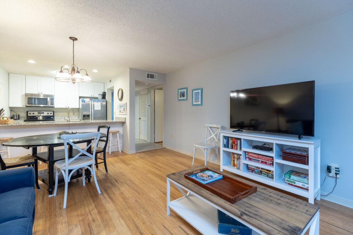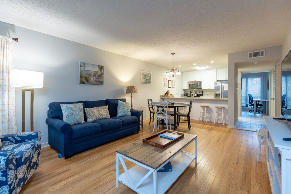 This ocean oriented villa features: • A 1 minute walk to the Dunes House beach club area. • Community swimming pool. (Open April through September.) • Flat screen TV's in Living Room and both bedrooms. • Free Wifi and Cable TV • 2 Free Adult Bicycles • 4 Free Beach Chairs This beautiful villa, just steps from the Dunes House beach club in the heart of Palmetto Dunes, is perfect for beach-loving guests who desire all the spectacular amenities of the Palmetto Dunes resort within walking distance. The tastefully remodeled kitchen opens to the spacious living area, featuring two balconies, a large flat-screen TV, and a sleeper sofa that complements the light and bright atmosphere. The dining area between the living space and kitchen creates an open and inviting feel throughout the villa. The master bedroom offers a King bed, flat-screen TV, and an ensuite bath with a vanity area and a separate tub/shower. The second bedroom features two queen beds and another full bathroom with a tub/shower combination. Near the entryway is a third full bathroom, which also houses the stackable washer and dryer and a stall shower – the perfect spot for rinsing off after a day at the beach! Palmetto Dunes, recognized for its outstanding amenities, has been voted the Top 25 World's Best Family Resort (Travel and Leisure Magazine), #1 Tennis Resort in the Carolinas (Tennis Magazine), Best Buddy Trip Destination (Golf Digest), Best Resort in the South (Conde Nast), and Certificate of Excellence (Trip Advisor). Palmetto Dunes is a private and secure neighborhood with a 24-hour monitored entrance to the Moorings area. Lined with palm trees and bike trails, the community welcomes you with impeccable landscaping. The streets showcase a small part of the neighborhood's offerings, including restaurants, outfitters, tennis courts, golf courses, and stores! Our prices include all fees. No hidden fees.