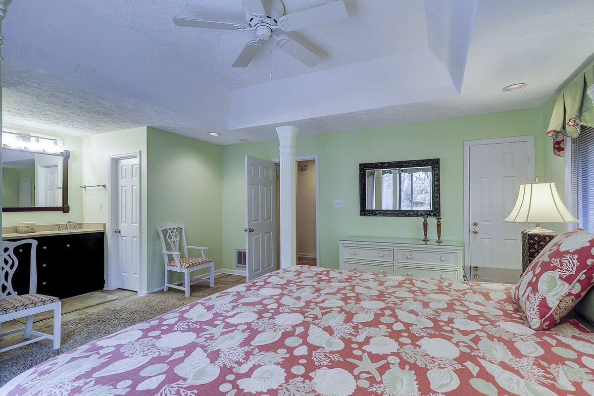 This three-bedroom house has three baths, dining room, game table , and family room. It has a large deck out back that spreads nearly the length of the house. This house is in a gated community with 24 hour security. The people on Port Tack are nice and mostly permanent residents. It is quiet, comfortable, and inviting. The house will be serviced by a cleaning service. So, no need to make the beds nor wash dishes upon your departure. The house is equipped with four TVs, and WI-FI. There is a land-line telephone for the house, 843-785-2380. There is a barbecue grill on the patio. There are as many as four working bicycles for your use. The two master bedrooms are located on opposite ends of the house. The queen-size bed room is located in the front of the house. The house fronts on a freshwater lake. {Good fishermen always catch fish from the lake using the dock for the house.} In addition to the game table, there is a card table w/chairs located in the very large closet of the queen-sized bed room. Our prices include all fees. No hidden fees.