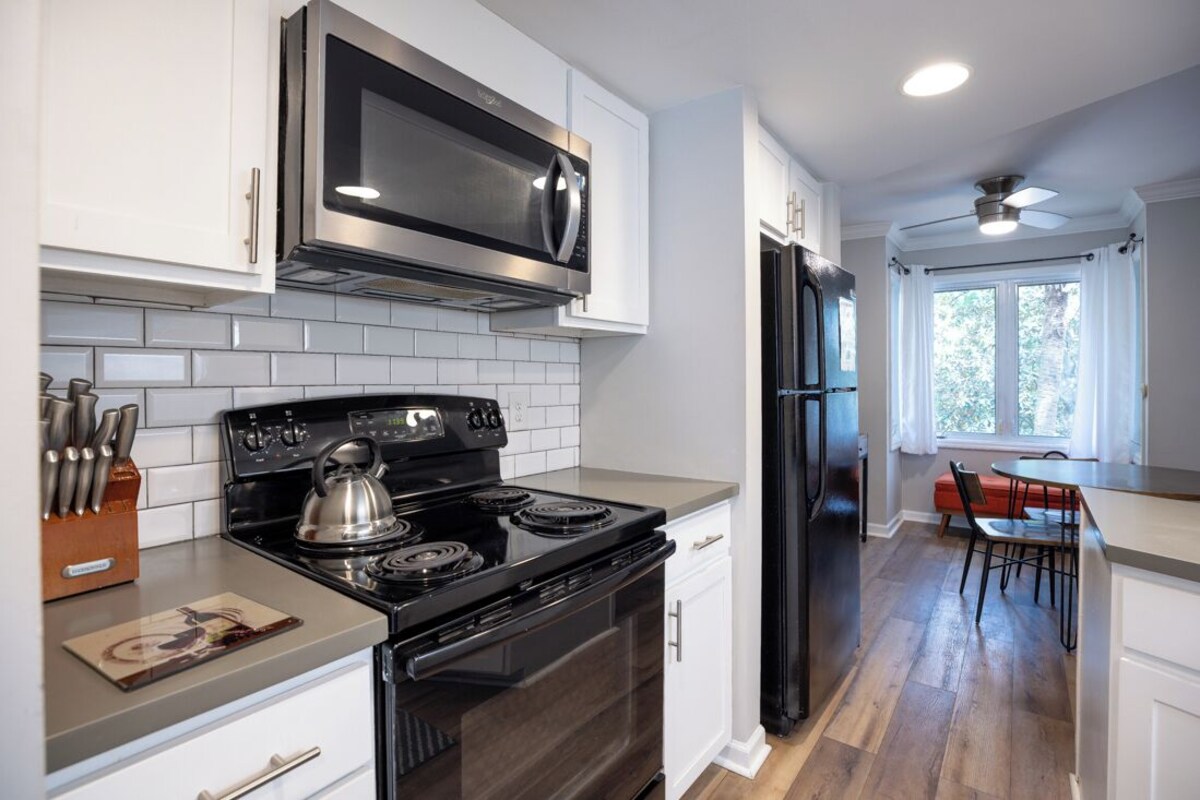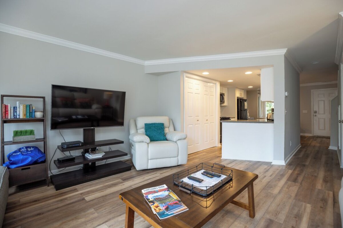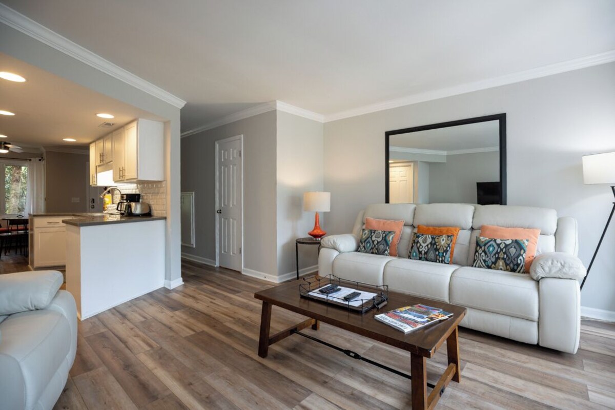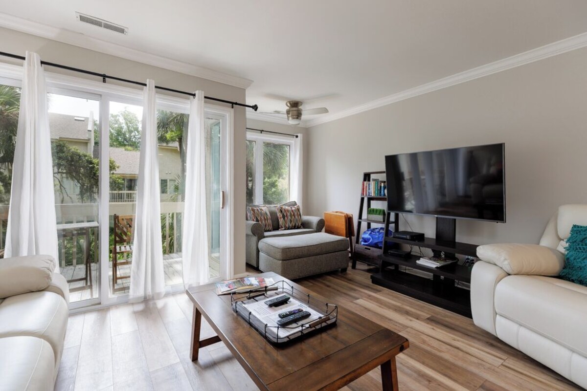 Villa Highlights: • 2 Queen Bedrooms: Enjoy a restful night's sleep in these beautifully appointed bedrooms. • Twin Sleeper Chair: Additional sleeping space for extra guests. • All New Furnishings: Revel in the elegance of brand-new, carefully chosen furnishings. • Cable TV and Secure WiFi: Stay connected and entertained with cable TV and secure, high-speed WiFi. • 4 Free Adult Bicycles: Explore the island at your leisure with four complimentary adult bicycles. • 4 Free Backpack Beach Chairs: Make your beach days even more enjoyable with these provided chairs. • 2 Parking Passes: Conveniently park up to two vehicles during your stay. • 2nd Floor Unit This Beach Arbor villa is a masterpiece of tasteful remodeling. From the moment you step inside, you'll be greeted by all-new flooring and furnishings. The downstairs area unveils a tranquil dining space, just steps from the newly updated kitchen. The living room is a bright and spacious haven, flooded with natural light. The modern and elegant furnishings in the living room create an inviting atmosphere. A convenient half bath and a balcony complete the first level, offering a perfect setting for relaxation. As you ascend to the upper level, you'll discover two queen bedrooms, each with its own full bath. Every bathroom has been meticulously updated to provide a clean and bright atmosphere. The beds in each room feature new mattresses, and the bedroom furniture is all-new. The master bedroom boasts an additional balcony with outdoor seating, perfect for unwinding after a day of island adventures. Beach Arbor is a small, inviting community with a charming central courtyard area and a community pool, providing a serene place to relax and soak in the island atmosphere. Make use of the four bicycles to embark on a short ride to the beach or enjoy quick access to Coligny and the Circle Center shopping center, where you'll find a grocery store, a liquor store, and a variety of restaurants. If you're seeking the perfect location to experience the best of South Forest Beach on Hilton Head Island, look no further. Beach Arbor Villa is your gateway to all the island has to offer. Reserve your stay today and get ready for an unforgettable vacation! • This villa allows up to 2 well behaved dogs with the payment of an additional pet fee. Our prices include all fees. No hidden fees.