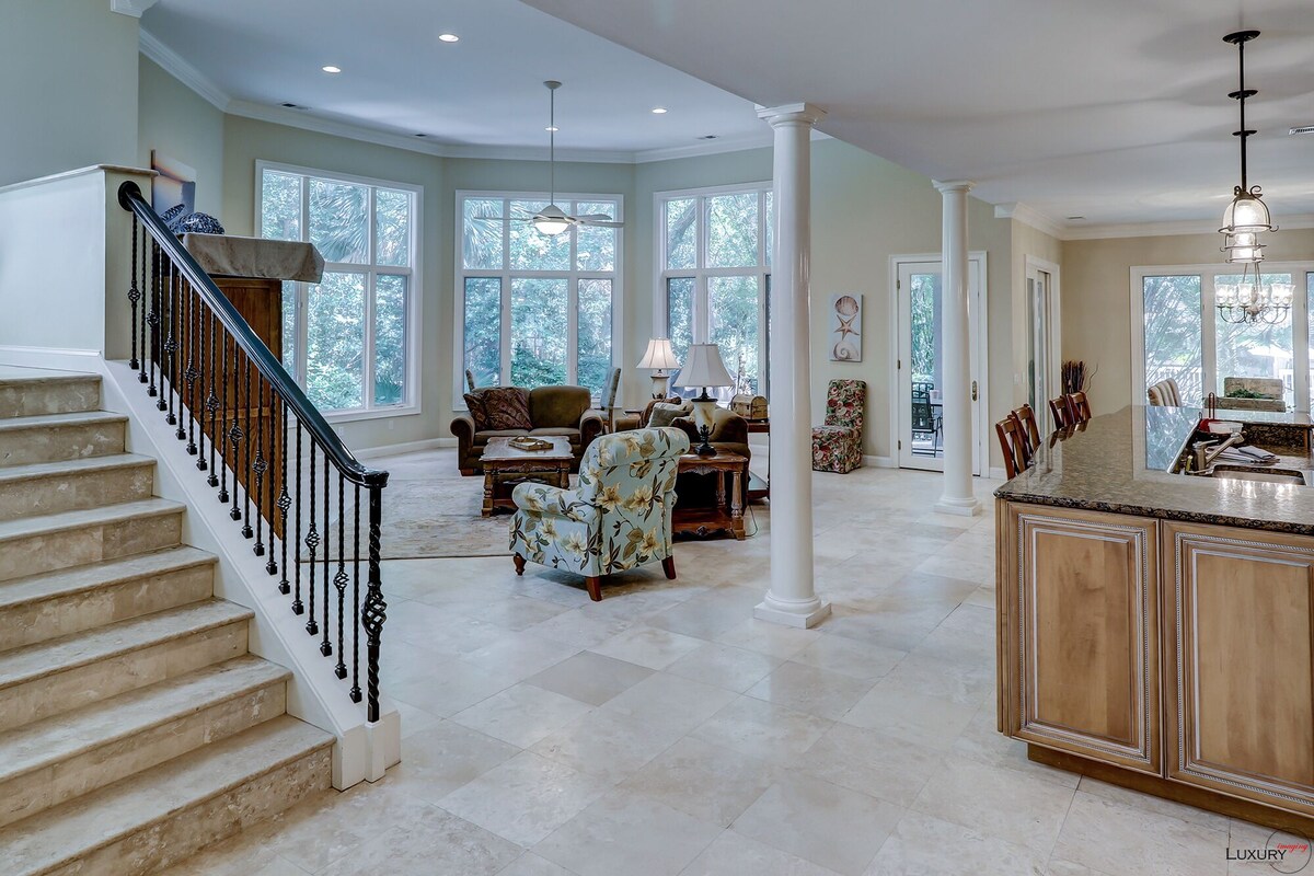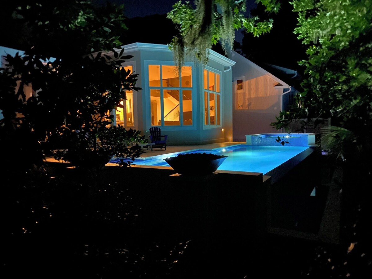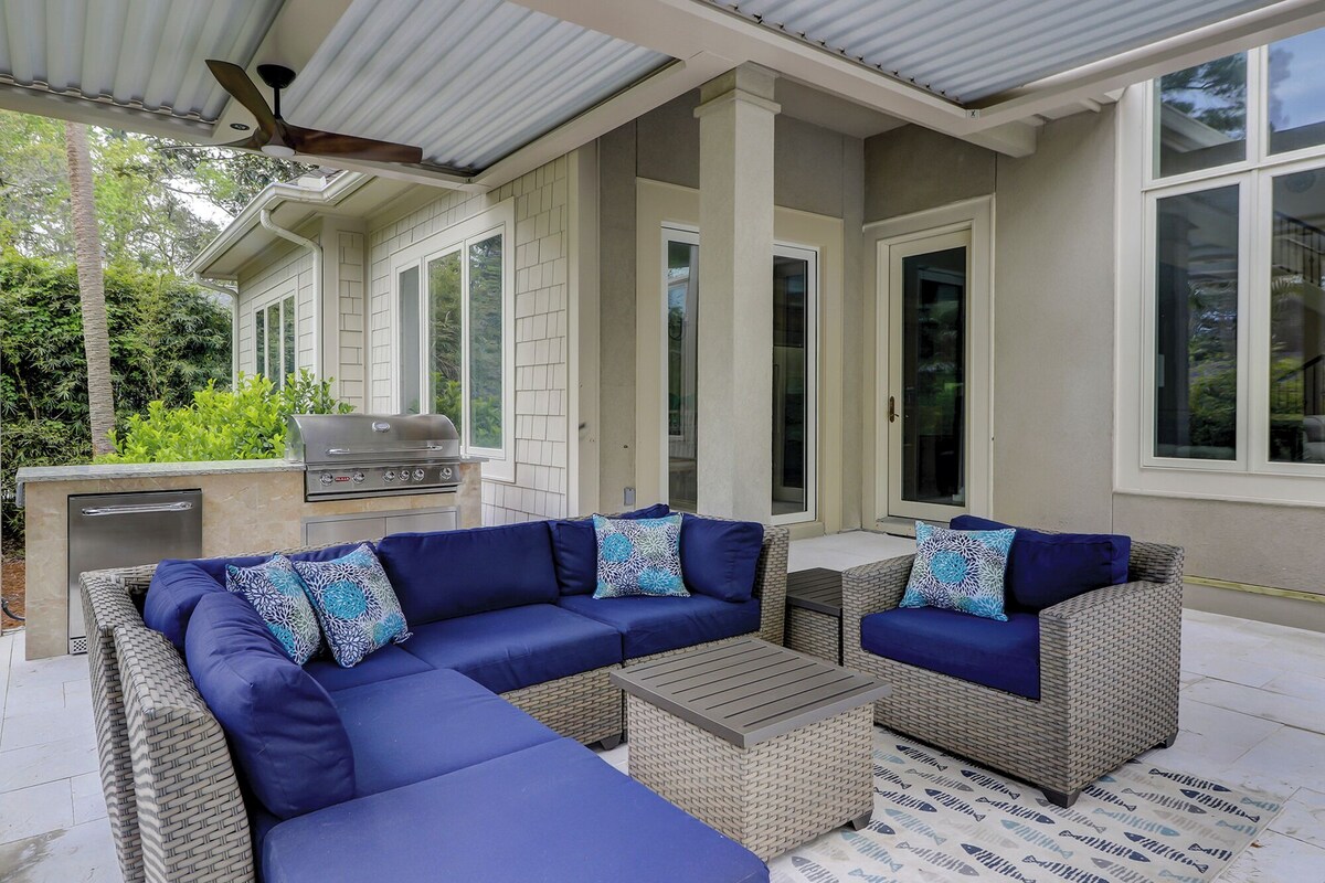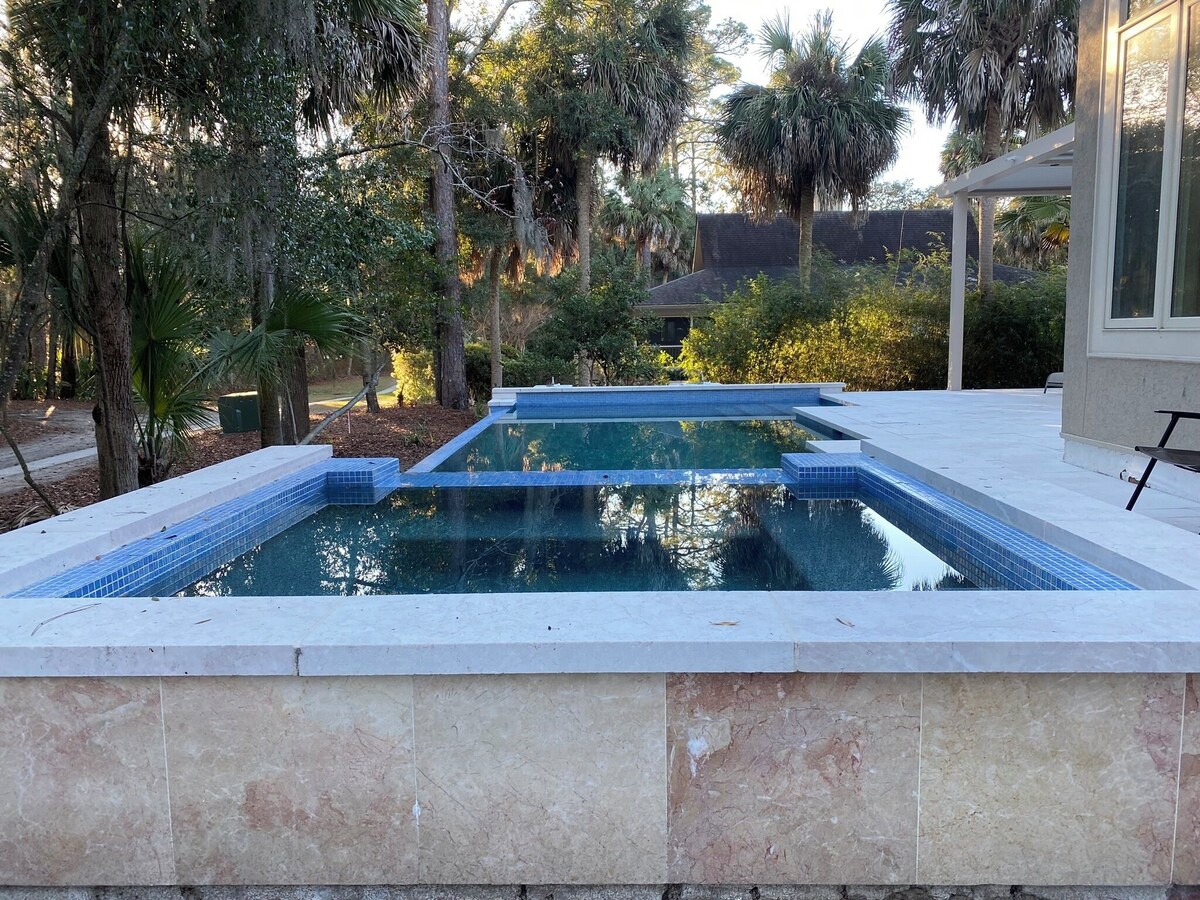 Luxury 6bdrm 6bath home, short beach walk to uncrowded beach (sleeps 18). Heated infinity pool and hot tub (most amazing in HHI). 8 TVs in house. Cable, Roku, AppleTV. Wifi. AC, all the amenities of home. Walking path (no roads to cross) to the beach. Beach is wide, beautiful, (not near public beach access). The Sea Pines Beach Club, bar, restaurant, hangout with live music is only a 10 minute stroll down the beach. Fabulous golf nearby. Try Heron Point, Atlantic Dunes, or the PGA Heritage Classic courses - all within 5 minute drive. 6 bedrooms each with a full bath. 5 king beds, a room with 4 bunk beds, and 2 sofa beds. Hot tub heat is no additional cost, pool heat is an extra $1000/week (or market price of propane). But pool heat is definitely not needed from Apr to Oct. Fully stocked kitchen with double ovens. 2 full new sets of pots and pans. Even a griddle. New coastal feel dining room. There are 2 downstairs bedrooms. The main bedroom and a smaller, very cute turtle room with a king, closet and full bath. All new living room set with 2 pullout couches, 65” tv, new chairs, 2 bar stool seating areas. The HVAC is also upgraded to include an ionizing system which kills bacteria, molds and sanitizes and cleans the air.. Summer is prime time on Hilton Head. But, Spring and Fall are lovely, great for the beach, golf, tennis, and biking simply because it’s not as crowded and not as hot. The restaurants are open but readily available and uncrowded. Many local bars have theme, like Steelers Pizza or Bengals seafood and steaks or the Michigan or Penn State, Clemson, Buckeyes football hangouts. Enjoy all your favorite college or pro football at your teams local bar. This house has been significantly upgraded for 2023. A full new backyard decking and infinity pool and new hot tub. The best back yard in HHI. Outdoor kitchen area pergola, fireplace with Adirondack chair seating area. The dining room Panoramic doors open fully onto the deck making the inside and the outside seamless. Too many upgrades to list. House guidelines ⁃ do not leave children unattended - ⁃ Children in the pool and hot tub must be accompanied by an adult ⁃ Quiet hours between 11pm -7am -Alcoholic Beverages should not be used while swimming and hot tubbing. -Pregnant women are not allowed in hot tub. -People with high blood pressure are not allowed in hot tub -hot tub no more than 20 minutes and not higher than 103 Temperature -all dogs need to be on a leash or voice controlled when outside the house. -do not leave the gas grill unattended while cooking. -children must be supervised when outside at all times. -in the bunk bedroom, children must be supervised getting in and out of beds and up down the ladder. -only age appropriate children should be allowed in bunk bedroom, only children mature enough to sleep and use the bunks safely. -no more than 6 cars in driveway per Sea Pines ordinance. -trash day is Wednesday and Saturday early morning. Put trash out in service area cans by Friday night. -trash cans should be kept in service shed at all times. -per Sea Pines ordinance, trash cans must be returned and not left in driveway or by the curb. Sea pines will assess fines to the renter. -outdoor fans/light remotes are kept outside. If lost, there will be a $100 replacement cost -when leaving outdoor area, please turn off fans/lights and put remotes back in their place. Our prices include all fees. No hidden fees.