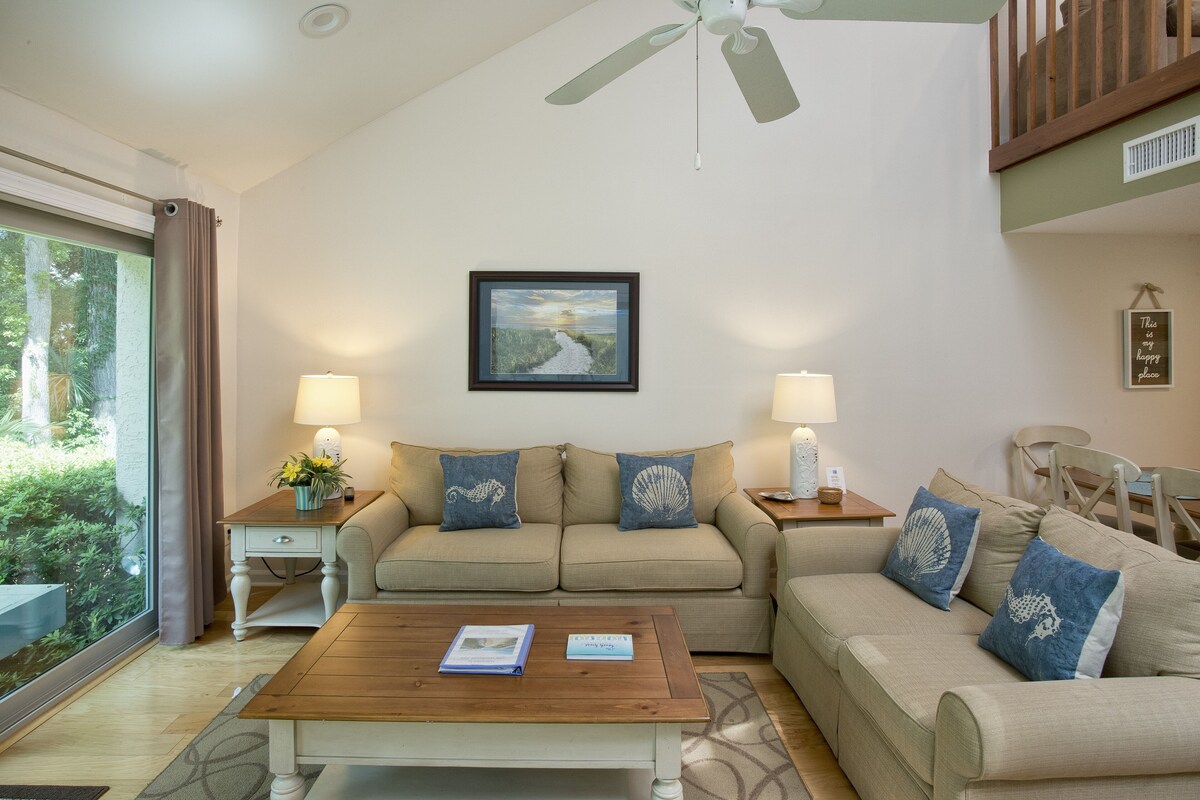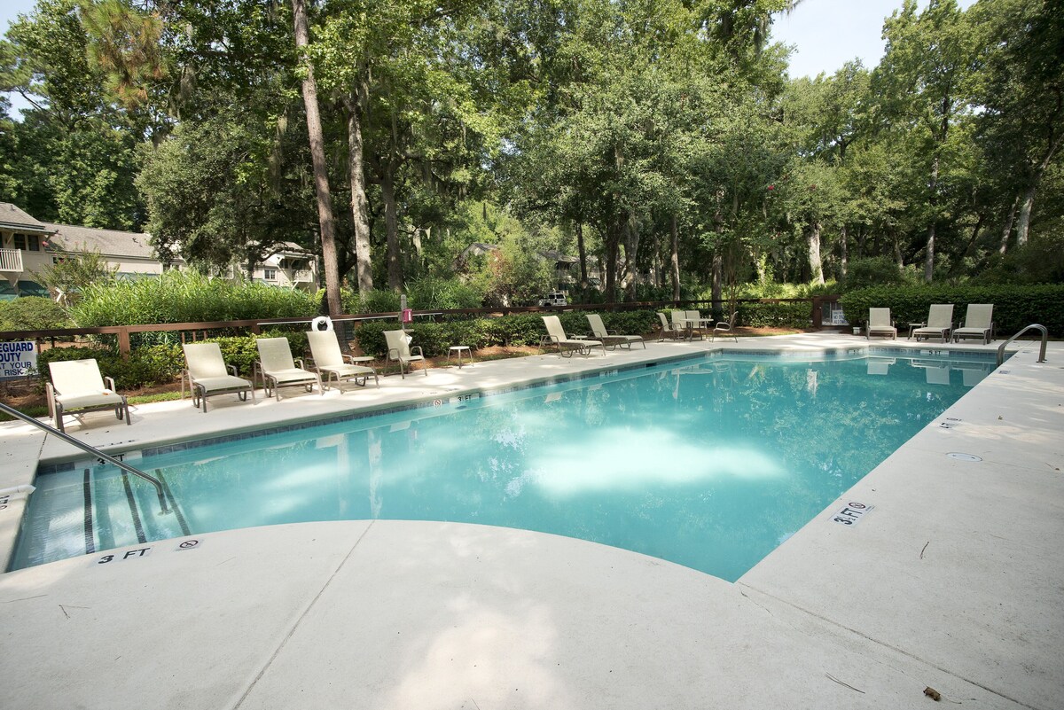 New to VRBO, but with a long list of regular guests, enjoy this sunny home away from home. Immaculately maintained, with many updates, including both bathrooms and the beautiful wood floors, 598 Wildwood is nestled in a private, quiet neighborhood with its own pool and tennis. This beautiful property has an amazing view of the Atlantic Dunes Golf Course from the large deck and is just a short ten minute walk to the Sea Pines Beach Club. As with all of our villas, enjoy two free bikes for exploring the miles and miles of shady bike paths through Sea Pines, free high speed wireless internet, free tennis and a free family fitness pass. 598 Wildwood is well equipped with all linens plus a full kitchen, ready for those nights where you feel like staying in. Beach towels and chairs are included also. Wildwood is a small, private neighborhood with only 15 units. The pool has a shady part every day and is rarely busy. This villa is pet friendly, however please list your pets in the guest list when booking, so that our pet fee will be added to your quote. Thank you! Check in is a breeze as we mail your vehicle pass and door code ahead of your arrival, eliminating the need for a stop at security. Just head straight to the villa, park right in front, and hit the sand! Our prices include all fees. No hidden fees.