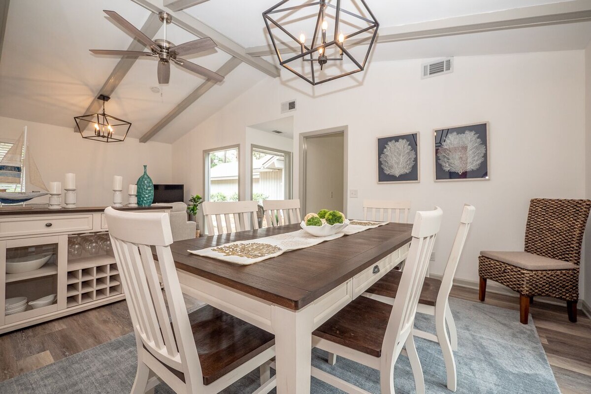 This Home Features: • 3 Bedrooms, 2 Bathrooms • Sleeps 8-10: 1 King, 1 Queen, Full over Full Bunk, Twin Trundle, Full Daybed. • Stylish updated furnishings throughout. • Well equipped kitchen • Laundry room • Amazing, private patio with eating area, Gas grill. • Free Wi-Fi • 4 Free Adult Bicycles from South Beach Cycles at the home. • 4 Beach Chairs at the home. • 1 Free Hour of Tennis Daily at the South Beach Racquet Club • The South Beach Pool (across from the Salty Dog) is available for use on a daily or weekly basis for a fee. This bright and beautiful home is centrally located in the Lawton Woods section of Sea Pines. This home features 3 bedrooms and 2 baths, all recently remodeled and updated. This home allows quick access to all of the amenities of Sea Pines while still providing privacy and serenity for a relaxing stay. You'll find a gas grill and plenty of seating for family cookouts or a perfect place to relax and unwind. Centrally located with easy access to all Sea Pines amenities, including Sea Pines beach club, Sea Pines tennis and golf courses including Harbour Town Golf Links, home to the PGA tour event, RBC Heritage of Golf. The waterfront South Beach Marina Village is only five minutes away by car. Sea Pines Center and Harbour Town, the jewel of Hilton Head Island is not much more than a bike ride away. Here you'll find interesting boutiques and restaurants, beautiful boats and live music. Newly Renovated Sea Pines Beach Club is only minutes away. Everything you need for a fun filled day in one place, food, refreshments and activities for the entire family. Please note: From March thru September, guests must take the free beach shuttle to the beach club. No parking at the beach club is allowed. A shuttle map and guide is included in your welcome folder. This home is pet friendly, up to 2 dogs permitted with additonal pet fee. * Please note. This home only has space for a maximum of 2 vehicles. Parking anywhere besides the driveway is not permitted and vehicles will be fined by the community. Additional vehicles may park at the overflow lot in Sea Pines as long as a valid car pass is purchased. Our prices include all fees. No hidden fees.