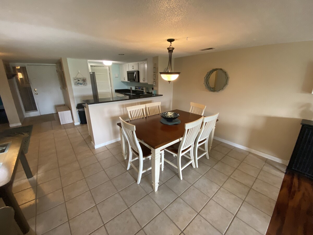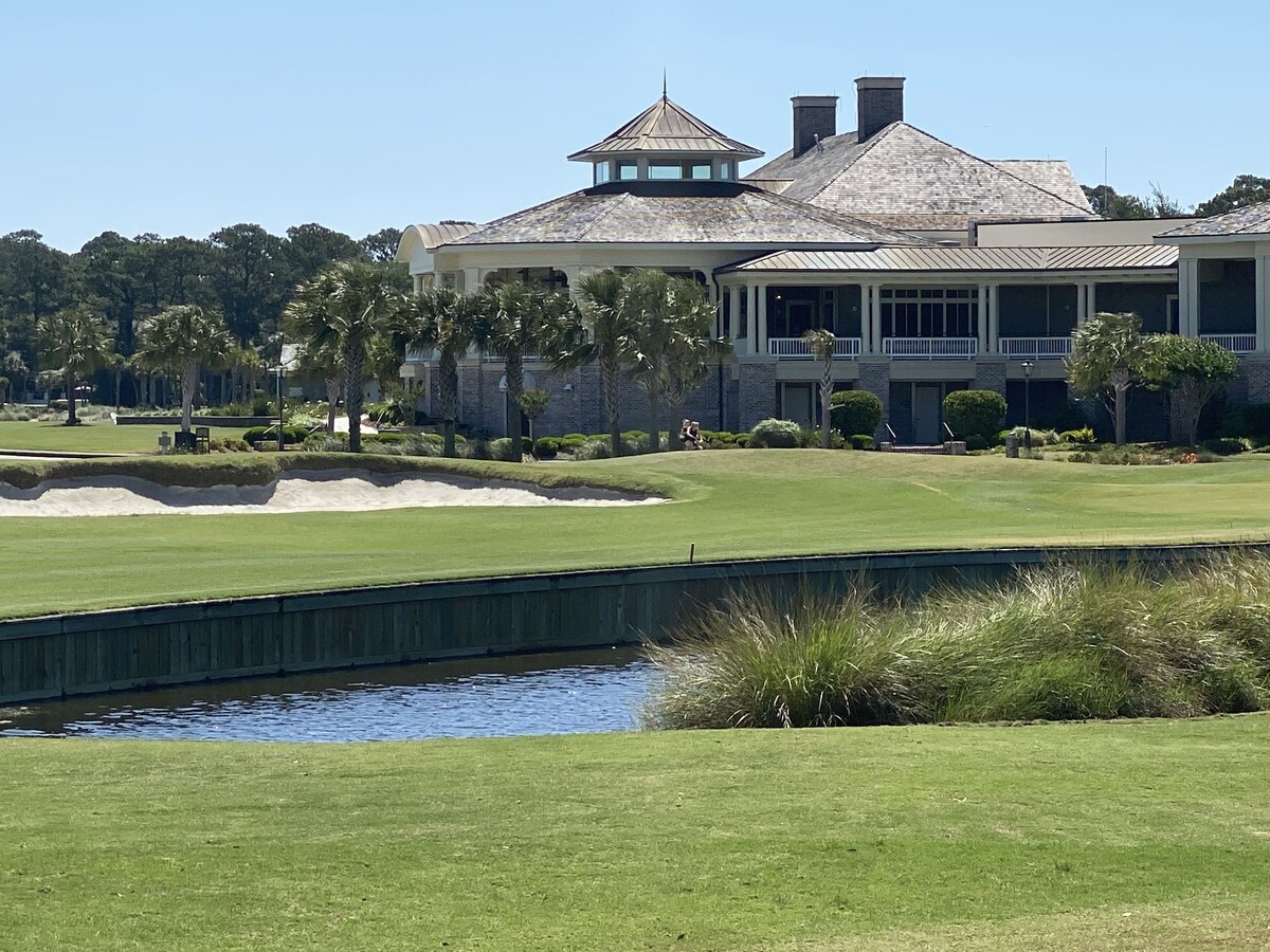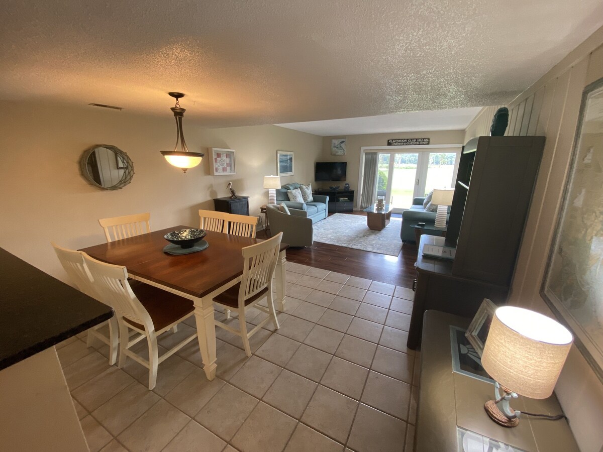 This 2 bedroom, 2 bath ground floor villa in Plantation Club is brand new to the rental market. Located on the 9th fairway of Atlantic Dunes, recently voted golf course of the year, this villa has a gorgeous view of the Plantation Club House. We also manage the unit next door (see VRBO #697435) that sleeps 5-7 people, if you have friends or family that want to join you. View the sunrise from the patio and watch the golfers and bikers head out for the day. The patio has a gas grill that is not available on villas above the ground level. The living room offers ample seating with a wide screen tv with cable and a queen size sleeper sofa. The kitchen was recently renovated, with stainless appliances and black granite countertops. It is fully stocked with everything you need and opens into the dining area and living room. The dining table seats 6 people. The laundry room off the kitchen has a full size washer/dryer. The master bedroom hosts a comfortable king size bed and a flat screen tv. The master bathroom has a private tub/shower/toilet room and a separate sink/dressing area. The second bedroom has 2 full beds and a tv/dvd player and access to the second full bathroom. The Plantation Club Villas has a secure pool just across the parking lot from the villa with plenty of seating, sun and shade. Just outside this villa are bike racks and plenty of parking. You are also about 100 yards from a Sea Pines Trolley stop that will take you to Harbour Town and other Sea Pines attractions. This section of Plantation Club Villas is just a 5 minute walk to the beach and the gorgeous and newly constructed Sea Pines Beach Club. The club hosts a restaurant and bar and outdoor seating overlooking the Atlantic Ocean. You have to see it to believe it! This villa is a step above most other villas in Plantation Club and you are sure to have a wonderful and relaxing vacation at 429 Plantation Club Villas! Our prices include all fees. No hidden fees.