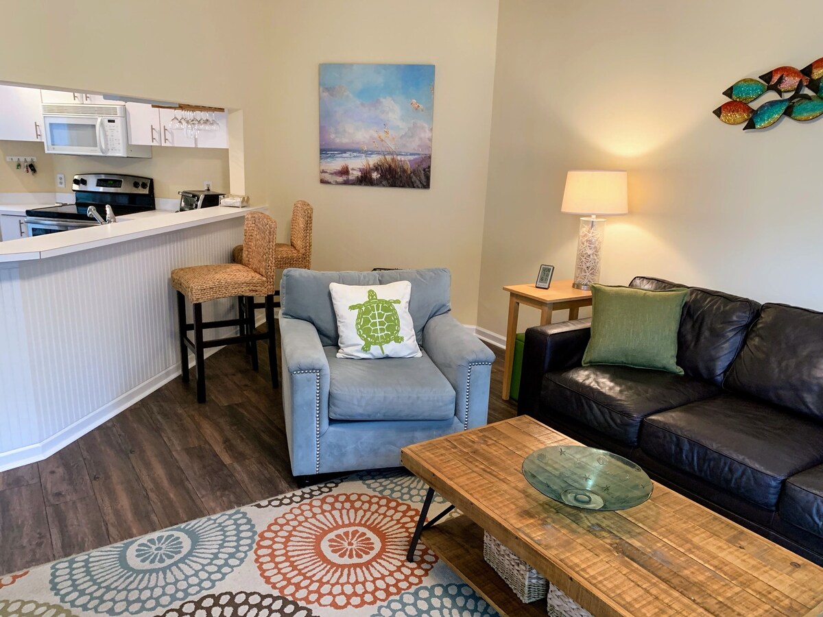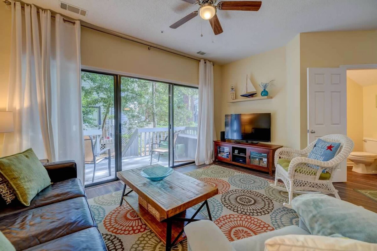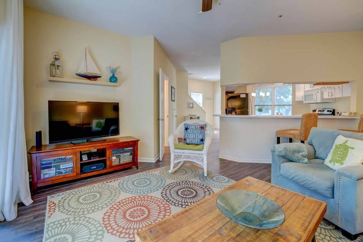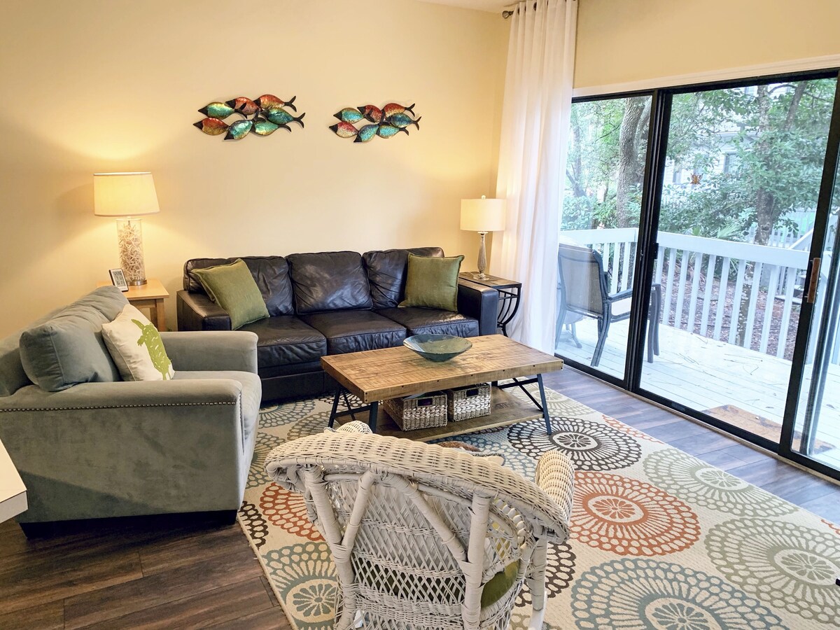 'SEA-esta' is renovated 2 bedroom and 2.5 bathroom 2-story end-unit town home in the Ocean Breeze Villas complex in Hilton Head Island, SC. Sleeps up to 4 adults and 2 kids with a queen size sleeper sofa. Well-behaved house-trained pets welcome. It’s just a short 10-minute stroll to the beach, close to the pool, and Coligny Plaza! The difference is in the details. SEA-esta offers a turn-key vacation experience. The villa has new furnishings, paint, hardwood floors, and tile. There are more features than you can imagine. We’ve tried to supply everything you would possibly need during your stay. All linens are provided as well as beach equipment, baby/children’s gear, entertainment, kitchen supplies, paper goods, and even dog bowls! Just pack your clothes and toiletries- your vacation is waiting for you. Inside you will find all of the amenities of home including a comfortable living area with leather sofa and a flat screen TV, wifi, a fully equipped kitchen, laundry room, large comfortable master bedroom with king bed and a newly renovated private bath, and second bedroom with two twin beds (can be converted to a king) also with a renovated private bath. There are 3 flat screen televisions as well as DVD player, DVDs, books, and games for the kids and their parents. Nature provides the rest...sunshine, sand & surf, and blue skies. What more could you ask for? ** Smoking Is NOT permitted in the townhouse ** PET FRIENDLY ** Well-behaved house-trained dogs under 50 lbs are welcome with $90 fee. It’s cheaper than a kennel! (Sorry, no cats.) Amenities Include... THE VILLA: o 2 Bedrooms, 2-1/2 Baths, End unit- beautifully decorated! o Leather queen sleeper sofa with memory foam topper for added comfort. o Fully equipped kitchen including stainless steel dishwasher & refrigerator, microwave, toaster oven, coffee maker, blender, crock-pot, & large seafood pot. Basic kitchen essentials such as salt & pepper, spices, oil, paper towels, coffee filters, etc. are also supplied. o Laundry room with washer, dryer, iron & ironing board. o 3 flat screen HD Televisions (65” smart TV in living room, NEW 40” flat screen smart HDTV''s in bedrooms), DVD players and DVD library o Wireless internet connection o Master bedroom with pillow-top king bed, LCD TV, DVD player, and newly renovated private bath o Second bedroom with 2 twin beds (can be converted to king bed upon request), LCD TV, DVD, and a newly renovated private bath o Private deck with grill o Child friendly with Pack n' Play, booster seat, sippy cups, plates, baby monitor, outlet covers, cabinet lock, bathroom step stool, bed rails, baby gate & wagon o All linens provided, including lots of beach towels! THE BEACH & ENTERTAINMENT: o Just a short 2 block walk to the beach o Beach Chairs, Umbrella, Toys, Cooler & Beach Cart o Pool is just steps from the Villa o DVDs, Books and Games for kids and their parents o Our personal guide book to help you discover all that HHI has to offer! o Walking distance to Coligny Plaza and the Tiki Bar! PROVIDED BY NATURE: o Sunshine, Sand and Surf, and Blue Skies! All in-season rentals are from Saturday to Saturday. Out-of-season rentals are available for shorter periods of time. Reservations are made on a first-come, first-serve basis. To hold your reservation, a deposit of 50% is required. Balance is due 30 days before arrival. A security deposit in the amount of $300 is also required. This deposit will be fully refunded within 2-3 weeks after your departure, provided there is no loss or damage. State of SC tourism tax is 11% and will be added to your rental fee. We will not rent to anyone under the age of 25 years unless accompanied by an adult guardian or parent for entire rental period. Keywords: Villa, Townhome, Condo Our prices include all fees. No hidden fees.