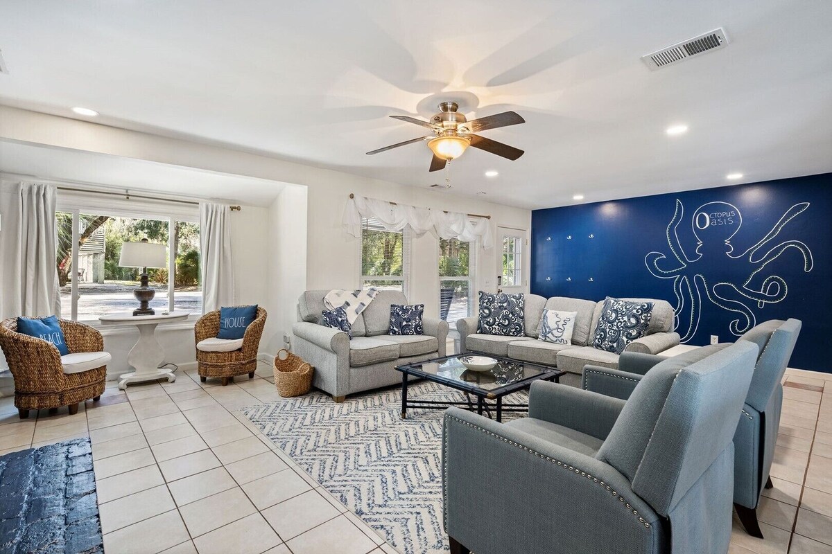 Welcome to Octopus Oasis at 12 Park Road! Upon entering this single-floor home, you are welcomed by a cozy and inviting living room. The living room serves as the central gathering space for the house and is designed for relaxation and socialization. It is likely furnished with comfortable seating, a coffee table, and perhaps a television or fireplace. To the right of the living room, there is an open layout that seamlessly transitions into the dining room and kitchen. The dining room features a table and chairs where meals can be enjoyed with family and friends. The kitchen is designed with modern amenities, including sleek granite countertops and stainless steel appliances. It's an ideal space for preparing and enjoying meals together. The granite countertops not only add elegance but also provide a durable and functional surface for cooking and food preparation. The stainless steel appliances give the kitchen a contemporary and clean look. Tucked in behind the kitchen is the laundry room, which is a convenient and practical addition to the home. This space is equipped with washing and drying machines, storage for laundry supplies, and a sink for various washing needs. To the left of the home, you'll find the three bedrooms. The first bedroom is designed as a children's or guest bedroom and features a bunk bed with a twin bed on top and a full-sized bed on the bottom. Under the full bed, there is an additional twin pull out trundle. This arrangement provides flexibility for accommodating guests or children. The second bedroom is a spacious queen bed that is perfect for guest relaxation and comfort. Next is the master bedroom, which is the largest and most private bedroom in the house. It includes an en-suite bathroom for added convenience. The master bedroom is likely furnished with a comfortable king-sized bed, dressers, and storage for personal belongings. The en-suite bathroom provides the homeowners with a private space for personal care, possibly featuring a shower, bathtub, and double vanity for added luxury. Do not forget to adventure outside, you'll discover a lavish and recently renovated backyard oasis. This outdoor space boasts a pristine pool and an attached hot tub, creating the ideal setting for relaxation and entertainment. Bring your dog with you so they don't miss the fun! 12 Park is the perfect place to enjoy sunny days and evenings under the stars. Bedroom 1: 1 King (private bath) Bedroom 2: 1 Queen (hall bath) Bedroom 3: 1 Bunk (twin over full with twin trundle) Livingroom: Pullout Sofa Additional Features: ~ Square Footage:1,390 ~ Pool size: 40x16 ~ Parking Spaces: 5 ~ Pet Friendly: Yes ~ Pool Heat: Yes, inquire about fee ~ Neighborhood: North Forest Beach - Distances: ~ Beach: 0.2 mi ~ Coligny: 0.8 mi ~ Harbor Town: 5.3 mi ~ South Beach: 6.1 mi ~ Shelter Cove: 5.2 mi Our prices include all fees. No hidden fees.