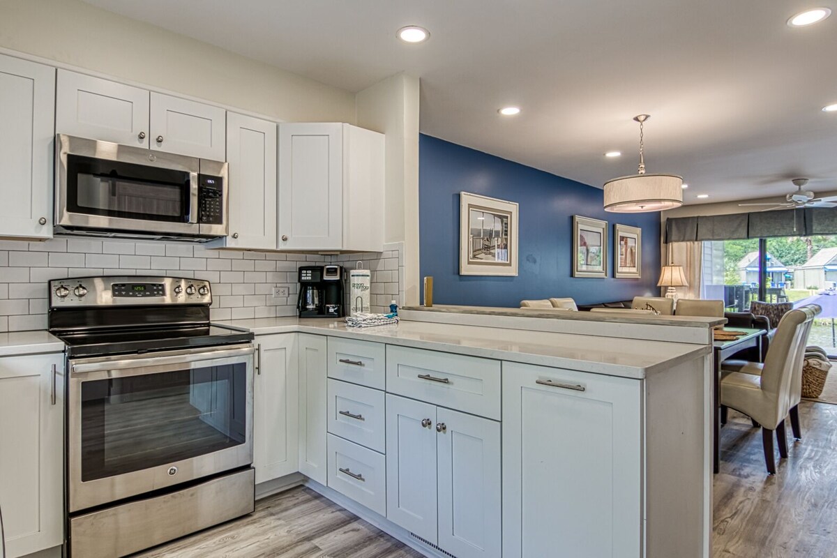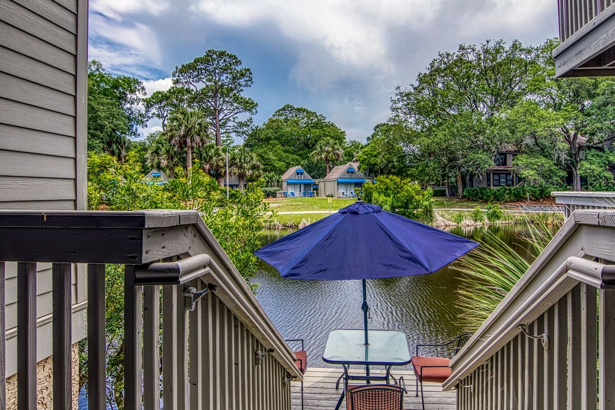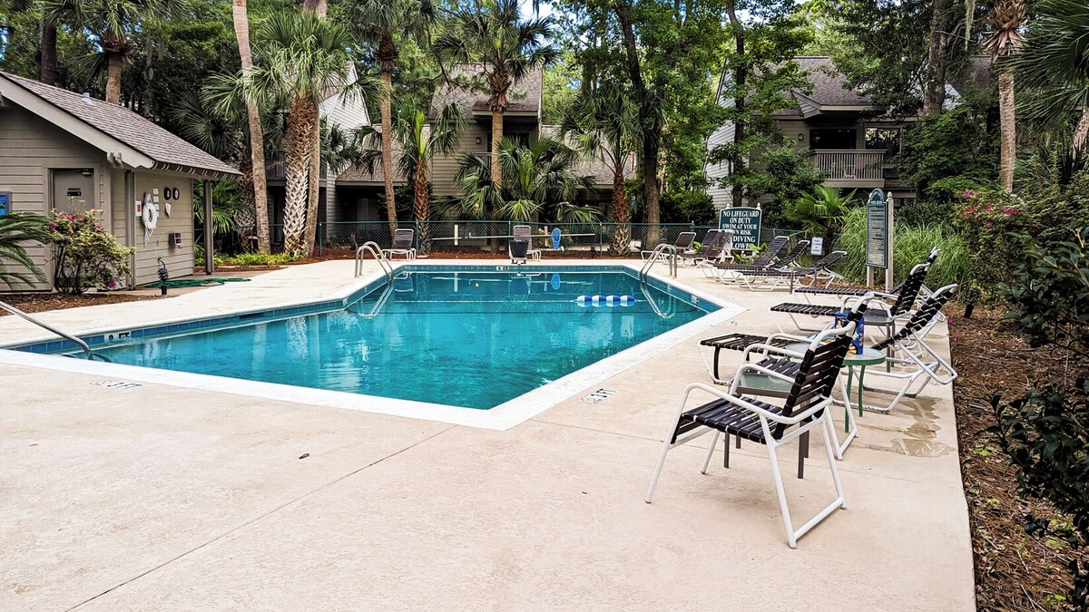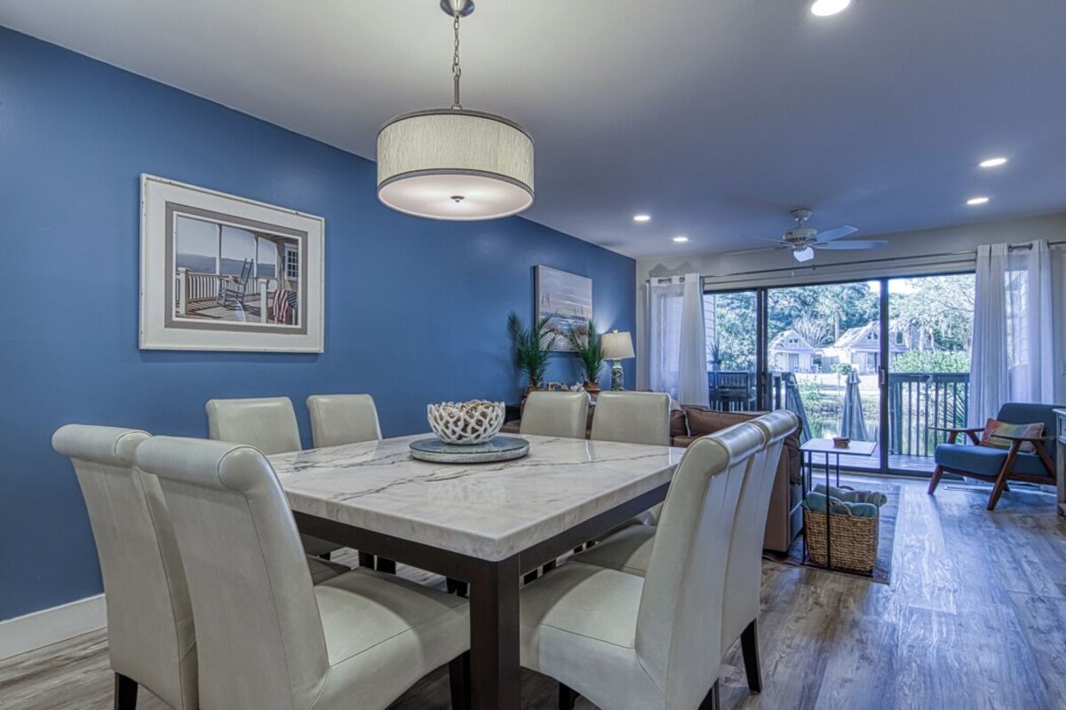 Don't miss this pet-friendly Palmetto Dunes vacation rental on the 11-mile lagoon, close to golf, bike trails pickleball and the beach on Hilton Head Island, ideal for a getaway with family and friends. Brand-new outdoor shower with handheld faucet—perfect for rinsing off after the beach, handy for washing your furry friend! This beautiful 3-bedroom, 3-bath villa in Palmetto Dunes sits right on the 11-mile lagoon and features a first-floor bedroom and bath for easy access. Just a short 5-minute (400-yard) stroll takes you to the beach and the Dunes House, a favorite spot with a beachside restaurant and bar. The General Store is right around the corner, known for its hearty breakfasts and legendary fried chicken at lunch. During the season, enjoy the complimentary Dunes Buggy shuttle to Shelter Cove’s shops, restaurants, and entertainment. Inside, the villa has been freshly updated with an open floorplan, new flooring, lighting, ceiling fans, vanities, upgraded trim, renovated baths, and modern kitchen features. Gather around the new dining table for 8 or unwind in the comfortable living room with brand-new furnishings. The two-level deck sits directly on the lagoon, offering peaceful views of birds and wildlife. Each bedroom has its own bath and a private balcony overlooking the water. The fun bunk room includes two bunks (twin over double) and is perfect for larger groups. A loft office space is available if you need to work remotely. The villa also offers games, puzzles, and books for quiet downtime, and a well-stocked kitchen ideal for family meal Beyond the villa, enjoy the large pool area, two championship golf courses, a top-tier tennis center, and world-class pickleball courts—all within Palmetto Dunes. During the holidays, the villa is fully decorated before Thanksgiving with a lit Christmas tree and festive décor that stays up through New Year’s. Guests love the dock on the lagoon for wildlife watching, the villa’s comfortable and stylish design, and its unbeatable location close to the beach, pool, General Store, and restaurants. Beach toys and cart are included, making your stay even easier. Our prices include all fees. No hidden fees.