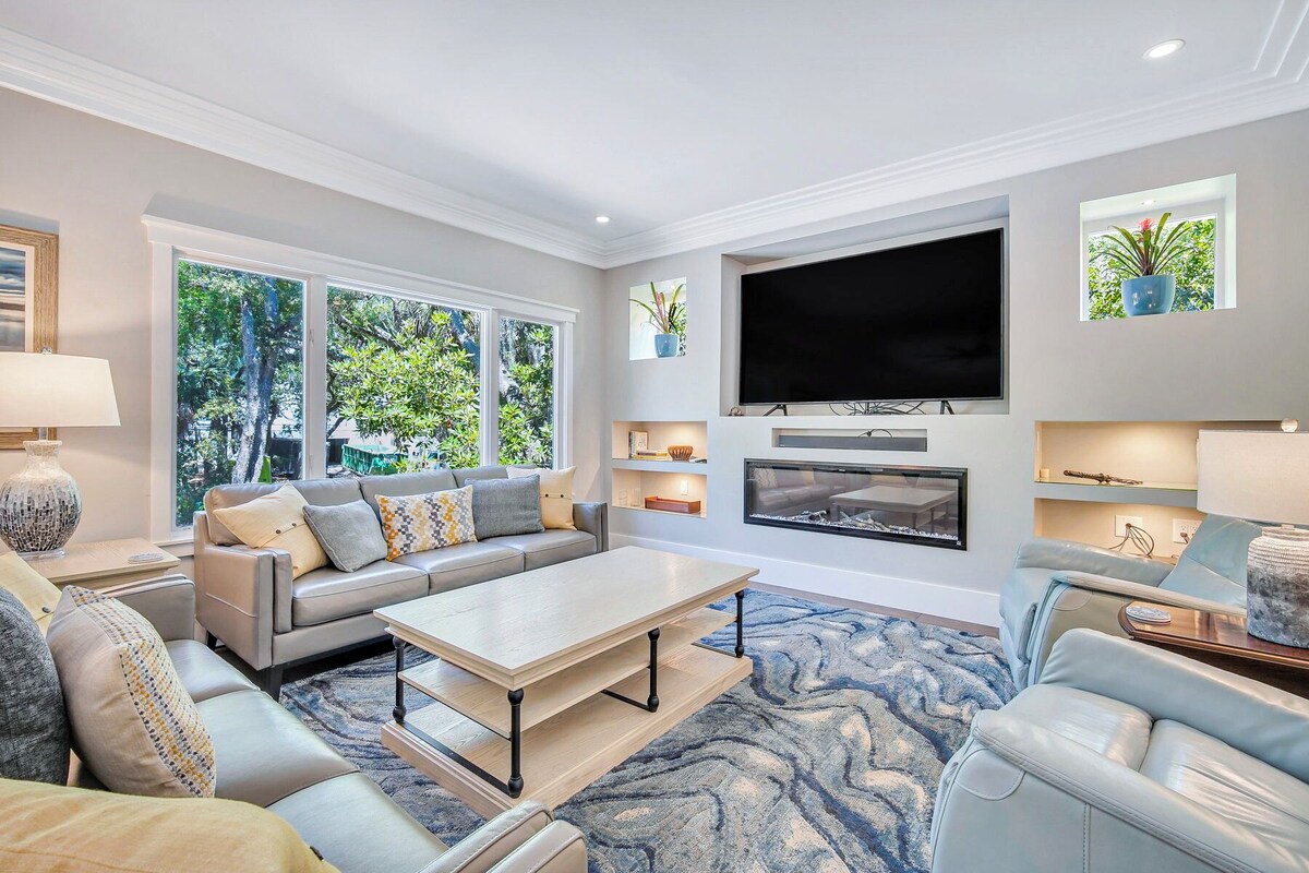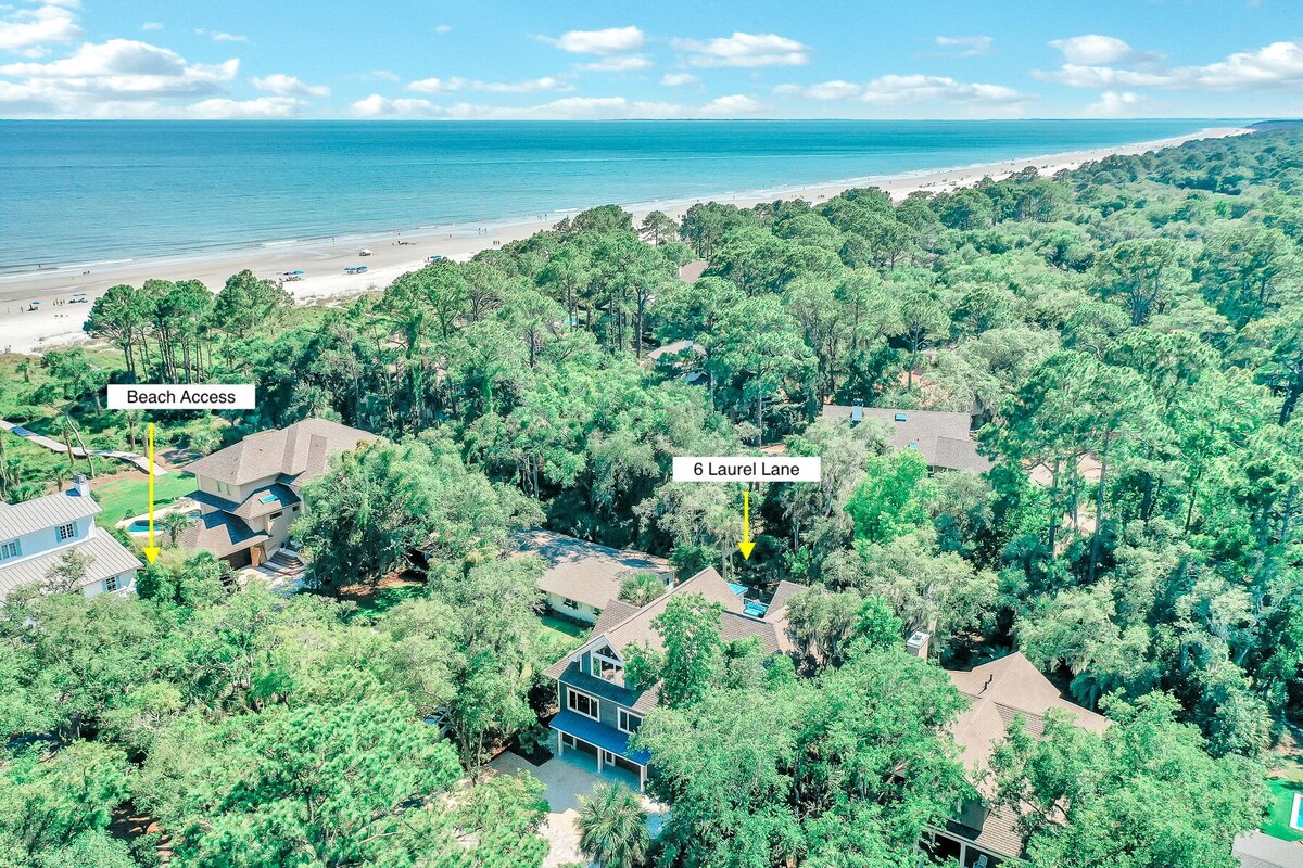 Sleeps 23 | 6-bedrooms | 6.5-bathrooms 3rd Row Ocean Home | Beach Access | Private Pool and Hot Tub | Corn Hole Outdoor Kitchen | Semi-Private Beach Path | Beach Towels Provided | Pet-friendly (Dogs only) 6 Laurel Lane is a stunning 3rd Row Ocean home, sleeping 23 with 6-bedrooms and 6.5 bathrooms! Located in South Forest Beach, this home features a private pool and hot tub, beach access, corn hole, bunk bedroom, 2 sleeping quarters and so much more! Please see a full list of rooms and amenities offered below. This home is perfect for large family gatherings as there are 2 wings of bedrooms offering added privacy. The first wing of bedrooms is located just as guests enter the home with 4-bedrooms and the second wing is located to the left of the kitchen with 2-bedrooms. Bedroom 1 is located to the right of the foyer with a king-sized bed, ensuite with a tiled walk-in shower and private access to the front porch seating area. Heading down the hallway, a half bathroom is conveniently located for guests enjoying the entertainment center of the home. Just past the half bathroom, Bedroom 2 features a king-sized bed, ensuite with double vanity sinks and a walk-in shower, and private access to the pool deck. Heading upstairs, bedroom 3 features 2 double-sized beds and an ensuite with a walk-in shower. The final wing 1-bedroom features 2 twin over double bunk beds, each with a double-sized trundle. This bedroom also has an ensuite with a soaking tub/shower combo and plenty of space for all guests! As guests head to the main entertainment center of the home, they are greeted by an open floor plan to the living, dining, and kitchen area! The dining room makes a statement with an expansive table with seating for up to 14 guests! Additional dining seating for 9 is available just steps away at the kitchen island. This gourmet kitchen features stainless steel appliances, a view of the pool, a full bar, and a TV! Before heading upstairs to the second wing, guests can relax around 2 seating areas with comfortable couches, an electric fireplace and large smart TV. Wing 2 is located just off the kitchen and up the stairs, the loft area features a mini bar for guests' convenience. Bedroom 5 offers a king-sized bed, twin sleeper sofa and ensuite with a walk-in shower. Lastly, bedroom 6 features a queen-sized bed, ensuite with a walk-in shower and private balcony overlooking the pool. As if the inside of this home wasn't enough to entertain guests for days, the backyard makes it even better! The main pool deck features a grilling station, patio, and lounge seating and a private 11x22 ft pool! Just off the main deck, guests can also enjoy the private hot tub or head down to the main level to play corn hole! 6 Laurel Lane offers beach access just off the back of the yard with only a 2-minute walk to the beach. Plus, it is only a 5-minute drive to Coligny Plaza, where guests can find local shops, restaurants, and entertainment, as well as public beach access to Coligny Beach. Save even more when you book 6 Lauren Lane and receive $300 in complimentary daily activities! Your amenities include 2 backpack beach chairs, an umbrella, 2 adult bikes, and admission to dolphin tours. When you're not soaking up the sun at the beach, enjoy daily rounds of golf at 6 local courses with a golf cart included and mini golf for family fun! BEDS 1st Wing – 2 King, 6 Double, 2 Twin 2nd Wing – 1 King, 1 Queen, 1 Twin *Total number of vehicles allowed is 8, with 6 in the driveway and 2 in the garage. *The Pool can be heated for an additional cost of $800/week. Pool heat is NOT included in the original reservation price or room rate provided by VRBO. Pool heat must be requested at least 14 days before your scheduled check-in date. *2 dogs allowed. $250 non-refundable pet fee, per pet. *3-night minimum stay required in off-season. *4-night minimum stay required May 17 - September 6, 2025. *Free daily activities are not available to monthly renters, long-term renters, or stays beyond 27 nights. Our prices include all fees. No hidden fees.