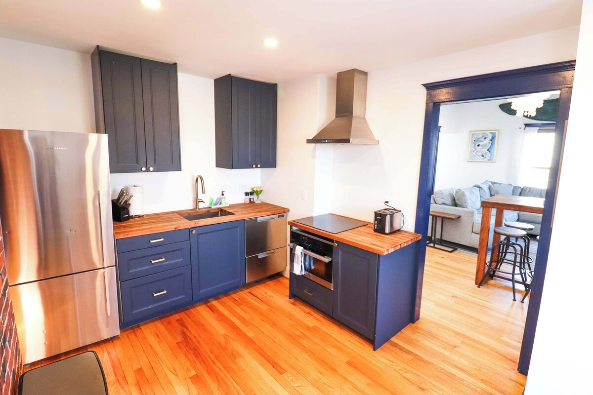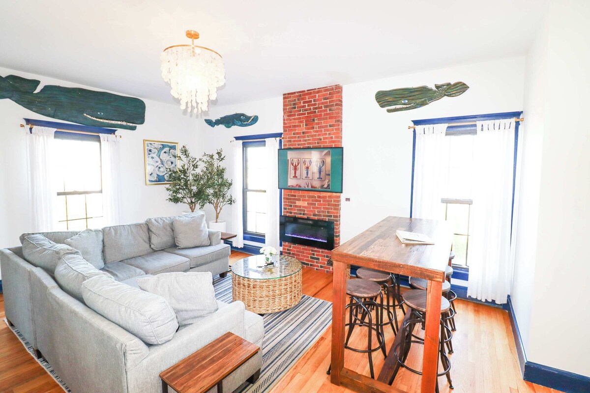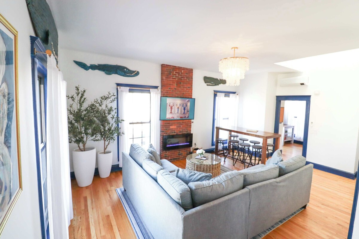 Summary: This large and open space is the perfect home base for a group visit to Portland. 10 minute walk to Old Port with off-street parking. Beautiful in town treetop views and partial harbor views. This spacious penthouse unit is on the 2nd and 3rd floors of the historic 1848 Sea Captain Ingraham mansion. License # STHR 00 4723 2023 The Space: This spacious, two-level unit features rich navy accents, original brick walls, skylights, and wood-beamed ceilings that highlight its historic charm. Spanning the left side of the second floor and the entire third floor, it offers plenty of space for groups or families. The second floor includes a large, comfortable living room with a sectional sofa, a dining bar with seating for eight, and a modern kitchen with high-end appliances. A half bath is conveniently located nearby. Just off the kitchen is a cozy queen bedroom with a sliding barn door for added charm and privacy. Upstairs, you'll find three additional queen bedrooms, each with ample storage and hanging space. The primary bedroom also includes a queen sleeper sofa and an ensuite bathroom featuring a rainhead shower for a luxurious experience. A second full bathroom with dual control shower and washer/dryer serves the remaining bedrooms on this floor. The Neighborhood: Located on Park St in Portland's West End, the property is surrounded by historic homes and brick sidewalks. The Old Port is just 10 minutes away as well as Congress St and the Arts District within a few blocks. Getting Around: You will have dedicated off-street parking for 2 mid-sized cars (tandem). There is free street parking but it can be challenging at certain times of day. The location is very walkable and Uber/Lyft is typically within a few minutes. Our prices include all fees. No hidden fees.