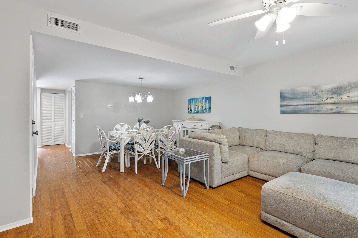 Summary: This pet friendly rental comes with the HH Island Rentals Advantage. Four beach chairs, a beach cart, four beach towels and new kitchen amenities including salt, pepper, cooking spray and seasoning salt. Walk to the Beach! Park the car and put on your flip-flops. This recently updated 3 bedroom 2 and 1/2 bath pet friendly villa is only a short walk to Folly Field Beach. Close to the beach and the pool, you will be able to truly enjoy all that Hilton Head Island has to offer. The Space: Tastefully decorated with that beachy feel, you will feel like you are at your home away from home. The courtyard entry is a great place to gather and rinse off the sand. With a outside shower, you can go right from the beach to the pool or into the unit to relax. You can also grill out in the entry courtyard on the included gas grill. Flat screen TVs are located in all of the bedrooms as well as the living area. The dining area accommodates six while there is plenty of room outside for more. The kitchen features all the items needed to prepare your favorite meals. Microwave, oven, dishwasher and refrigerator. And if you need to do some laundry, the unit includes a full size washer and dryer on the second floor. A wagon and beach chairs are available for use so you don't need to haul that from home. A leisure walking/bike trail is located right across the street for easy access to the beach. This beach rental has it all. Come on down and relax. This home feature 3 bedrooms and 2 and 1/2 baths providing ample room for up to eight guests. The adults can enjoy the king and queen beds in two of the bedrooms while the kids enjoy the bunk room with 4 twin beds. This unit is pet friendly and allows up to two dogs with a maximum weight of 50 lbs. each. The pet fee is $195 per stay and will be billed after you make your reservation. Our prices include all fees. No hidden fees.