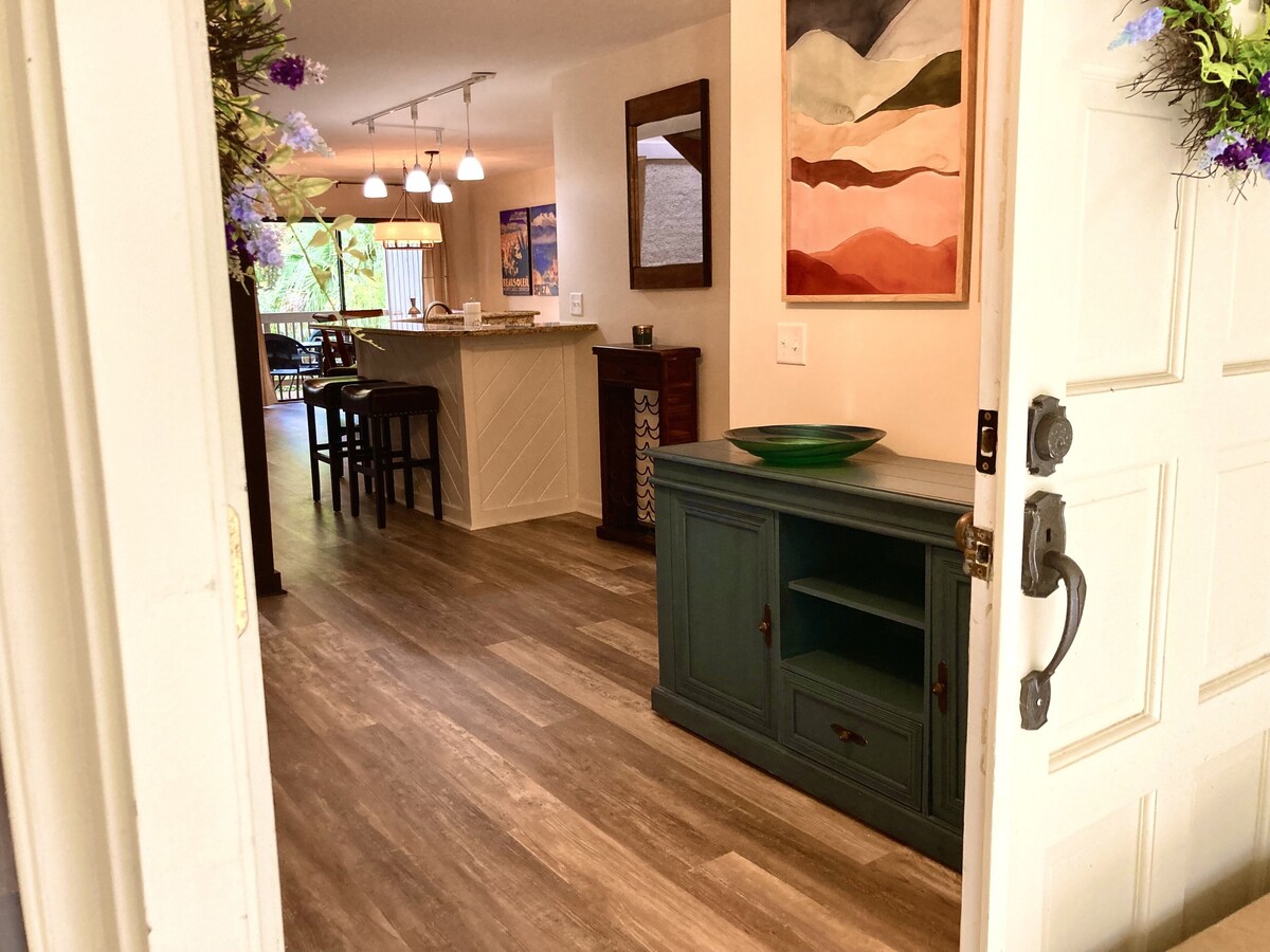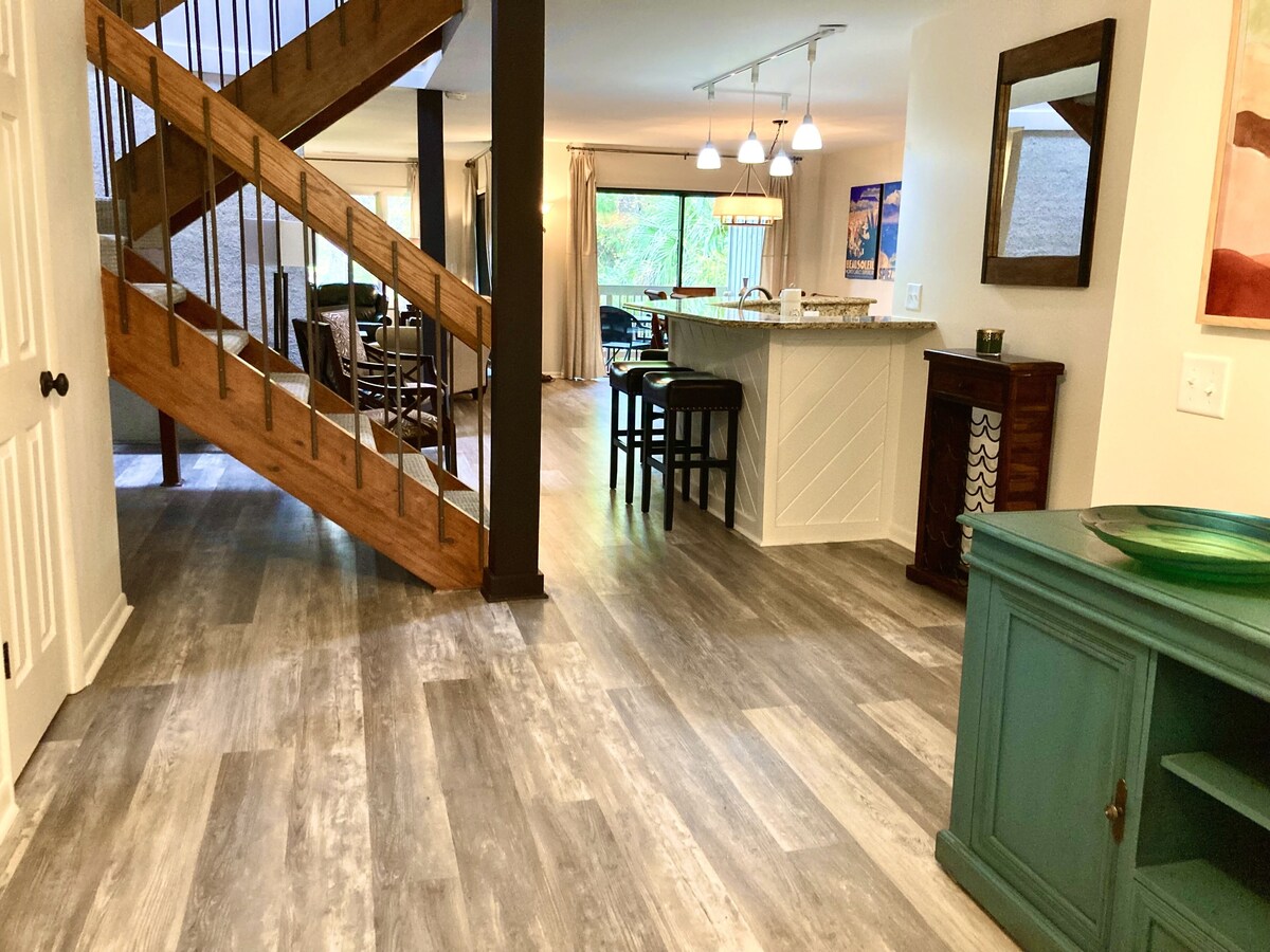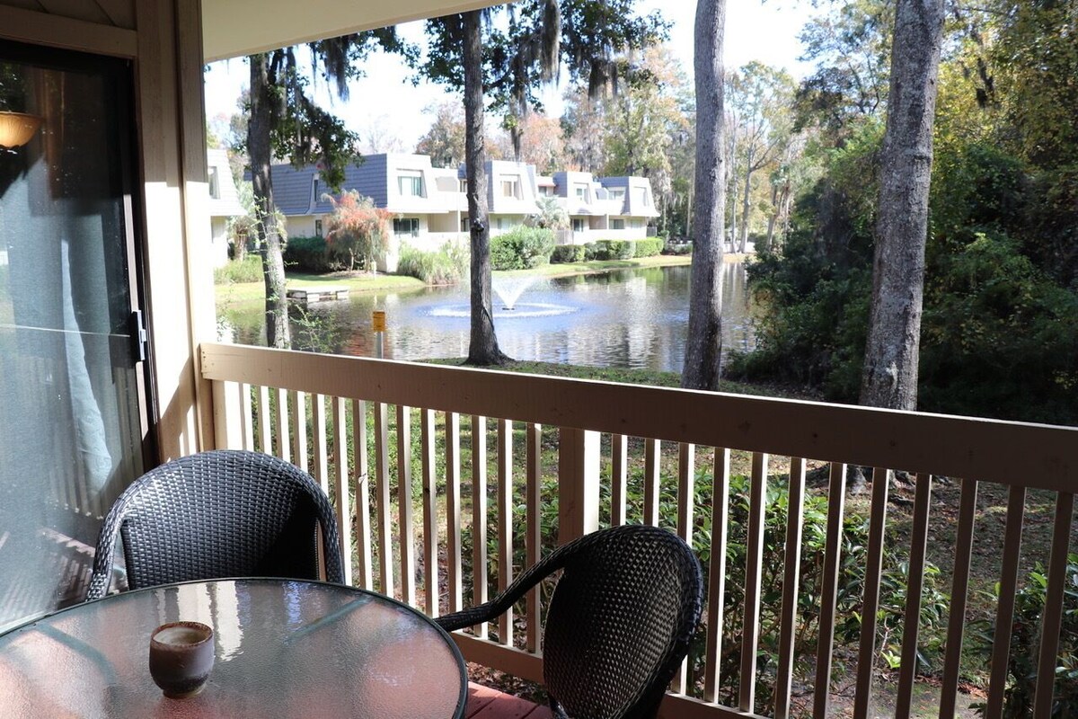 Villa 505 is located in Shipyard Regime near the center of the island -- 5 minutes to the beach, 5 minutes to Coligny Park and Square, 10 minutes to Shelter Cove -- central to the greatest restaurants and shopping the island has to offer. A lovely island home: 505 features open concept architecture with a dramatic entry staircase, beautiful walls of glass, and three spacious king bedrooms with en suite private baths. Every room has been updated, renovated, and improved with up to date appliances and wifi, new LVT floors, paint, mouldings, and high end furnishings. You'll enter the villa through a generously proportioned front veranda into a gracious foyer with a convenient drop zone for sandy chairs and bags of clubs. The open concept main floor is anchored by a spectacular mid-century modern double staircase. This level glows with natural light -- four 8' patio doors and window walls plus a skylight provide light, bright, cheerful illumination throughout. The kitchen features updated appliances, full-size range, microwave, fridge and dishwasher so your meal prep is easy and fun. And the granite counters and bar are surrounded with leather-topped bar stools inviting friends and family to gather and enjoy. Dining is convenient outdoors on the private porch set for 6 overlooking the lagoon and fountain. Or if the weather's inclement, there is a beautiful mahogany dining table that faces the same view. Whether you're catching up with family, watching the ballgame with your friends, or enjoying music and telling big stories, the den is the place to be. Surrounded by the natural views, furnished with luxurious leather sofas and overstuffed chairs, and enhanced by a full-size fireplace, it's comfortable in all seasons and weathers. Upstairs you'll turn right to the front bedroom. This king suite features a patio door and corner window, and clean and comfy furnishings and linens. There's plenty of space to store clothing and personal items in your dresser or 8' closet. Smart TV. And best of all, your patio door leads to your balcony overlooking the natural landscape outside. Your private en suite bath features a large tub/shower combination, new sink with granite top and a comfort height toilet. So nice! But you'll also enjoy plenty of hot water and a shower head that has great water pressure to boot. The hall bedroom is similar: a king suite with new furnishings and floors, generous closet and storage, new bathroom finish/fixtures and comfort height toilet. Your patio door in this room also opens onto a sunset-facing balcony. You'll enjoy either tub or shower bathing, a Smart TV, and a great night's sleep! On to the primary suite. Enjoy gorgeous mornings and relaxing evenings with the lagoon view from your private deck --two walls of this room are glass and you'll be able to see the jungle paradise outside from dawn till dusk. This room has been updated as the other two, and it also features a very large walk-in closet for your convenience. The bath has a double granite topped vanity, its own glass door to the balcony, a newly tiled shower, and the most accommodating soaker tub you've ever enjoyed. Long enough to stretch out in, with, yes, built in arm rests for those of us who like to read in the tub. Yes please! Comfort, luxury, and privacy. Like all well-loved homes, this one has joyful gathering spaces, little get-away nooks, beloved natural neighbors (water birds, deer, and the occasional gator sighting), and plenty of room for adults, kids, friends, and family. Like all practical homes, this one has washer-dryer, updated kitchen appliances, modern functional bathrooms, plenty of pantry storage, and lots of space for vacationing family and friends. Golfmaster Villas provide many amenities: Private beach parking and access through the Shipyard Beach House (included with rental), three 9-hole golf courses adjacent to the complex (call for teetimes and pricing) with a beautiful club that has great food too; tennis courts and pickle ball courts right across the street (included with rental), Golfmaster-only swimming pool (included with rental), and miles of bike and walking trails through the beautiful residential and natural landscape. W also keep 6 nice beach chairs under the stairs so you don't have to pack or purchase these items. A perfect combination of easy access to the island's many attractions, and the quiet privacy of a Golfmaster Villa; 2,000 square feet of well-designed and appointed living space, all King Suites with private baths, and amenities galore. Enjoy your best Hilton Head vacation ever! Our prices include all fees. No hidden fees.