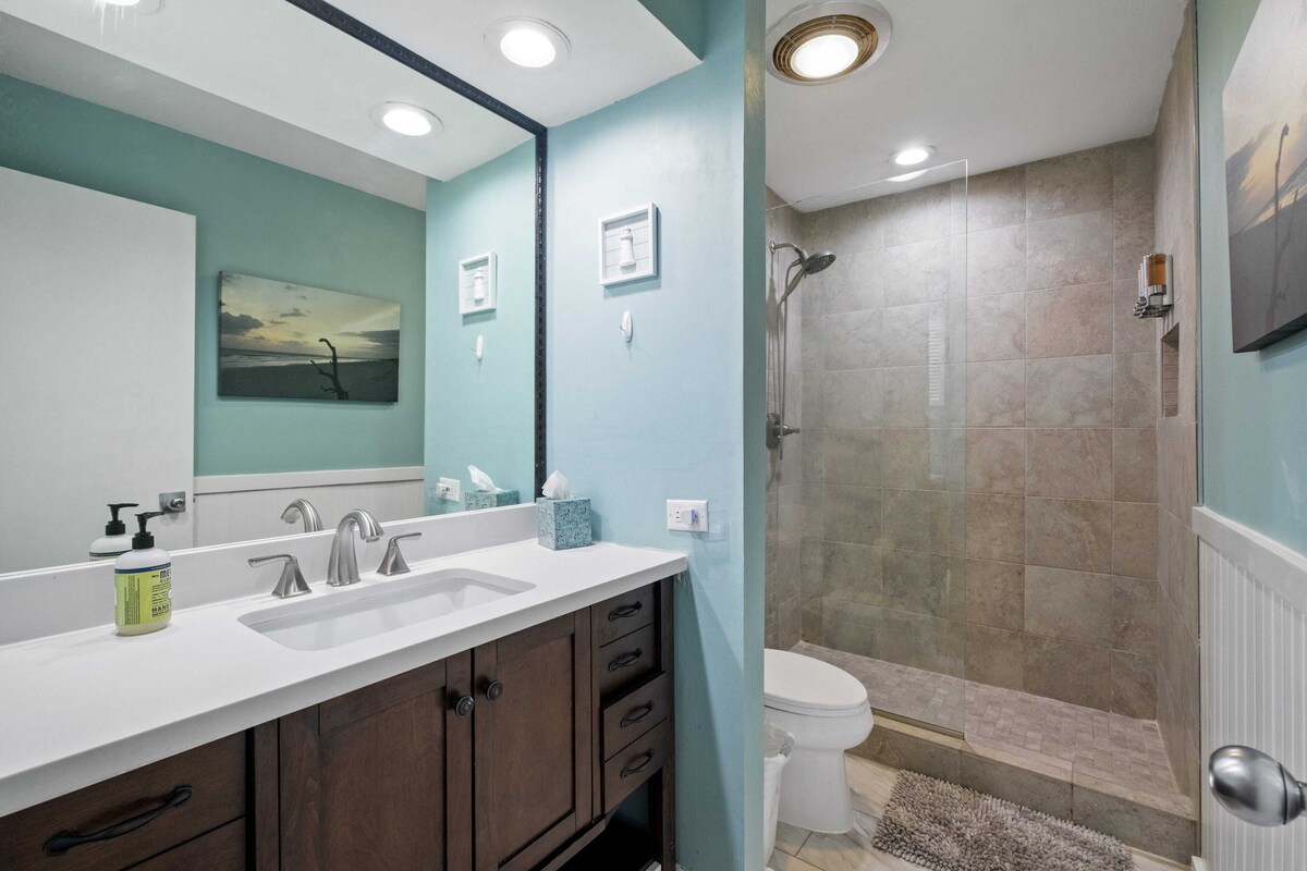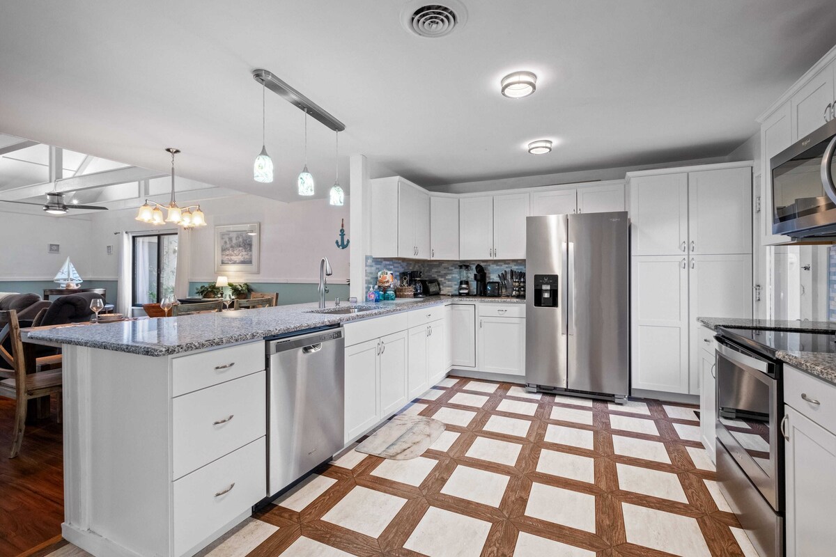 In the fully stocked kitchen, you can whip up delicious meals on the stove and oven, or fire up the grill for an alfresco feast. Savor your culinary creations at the dining table, or step outside and relax on the outdoor furniture with your furry friend while taking in the island breeze.