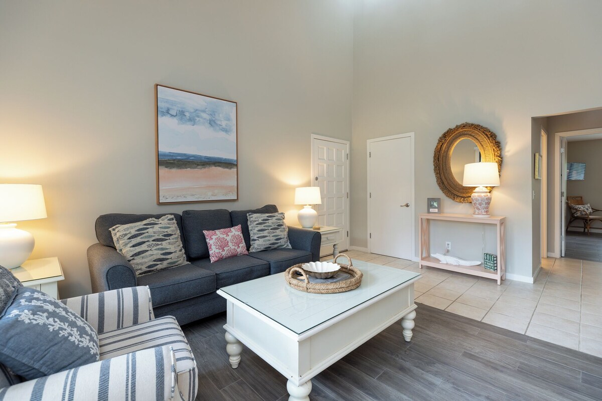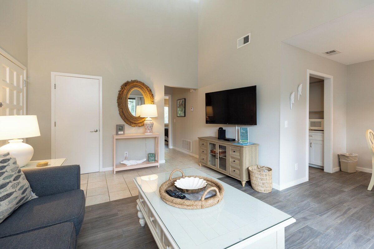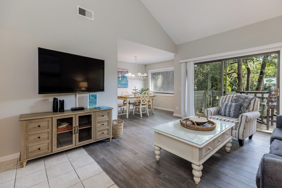 Welcome to \ This unit features: • 1 Bed, 1 Bath • 1 King Bed, 1 Queen Sleeper Sofa • Washer & Dryer • Balcony with golf views • Complimentary WiFi • 4 Beach Chairs • 2 Free Adult Bicycles Discover tranquility and comfort in this second-floor Racquet Club Villa, an ideal sanctuary for a couple or a small family. Bathed in natural light with vaulted ceilings, this one-bedroom retreat feels remarkably spacious. The open floorplan seamlessly connects the living and dining areas, enhanced by a balcony offering captivating golf course views for outdoor relaxation. The living area features a large flat-screen TV, while the well-equipped galley-style kitchen boasts new cooking and dining utensils. In the generously sized bedroom, a wall-mounted flat-screen Roku TV with live streaming cable complements the King bed, providing a cozy haven. The bathroom is appointed with double sinks, a linen closet, and a convenient shower/tub combo. Your stay includes one car pass into Sea Pines, and additional passes can be obtained through management. Two adult beach cruiser bicycles from South Beach Bicycle Rentals are at your disposal, allowing you to explore the scenic surroundings. Racquet Club Villas boast a community pool and clay tennis courts for your enjoyment. Conveniently situated along the trolley route to the beach and within walking distance to Harbour Town, this villa offers proximity to the finest offerings of the Sea Pines Resort. Up to two well-behaved dogs are welcome, subject to an additional pet fee. Immerse yourself in the essence of Sea Pines living at this charming retreat. Our prices include all fees. No hidden fees.