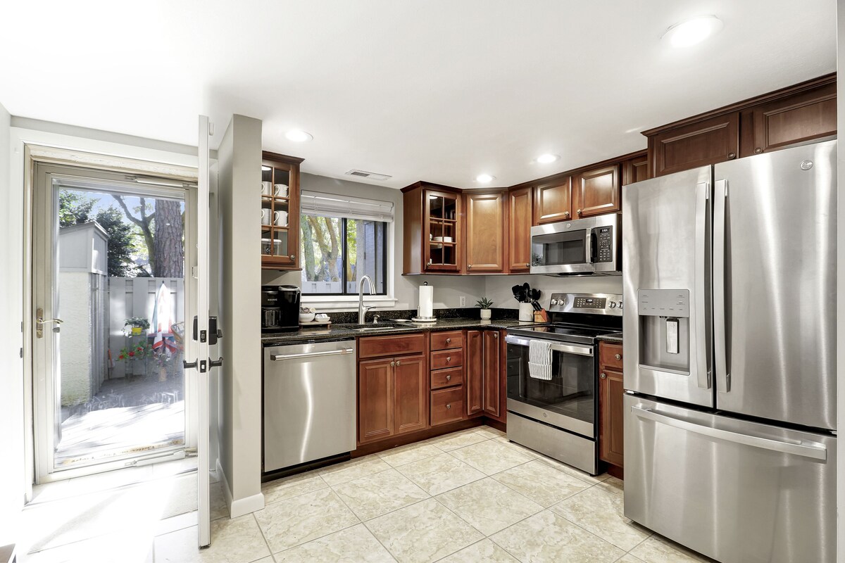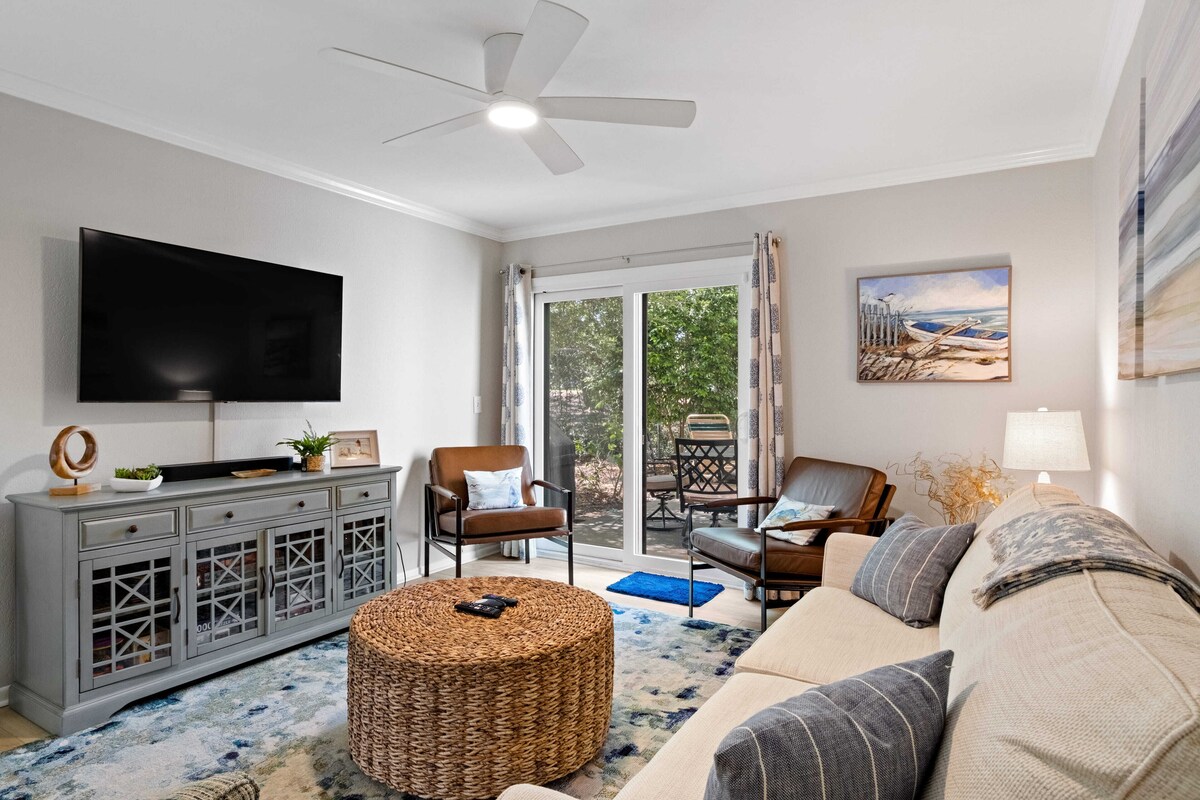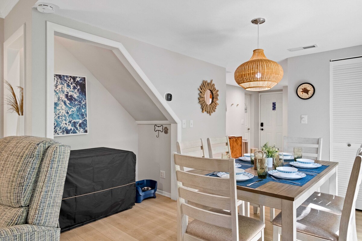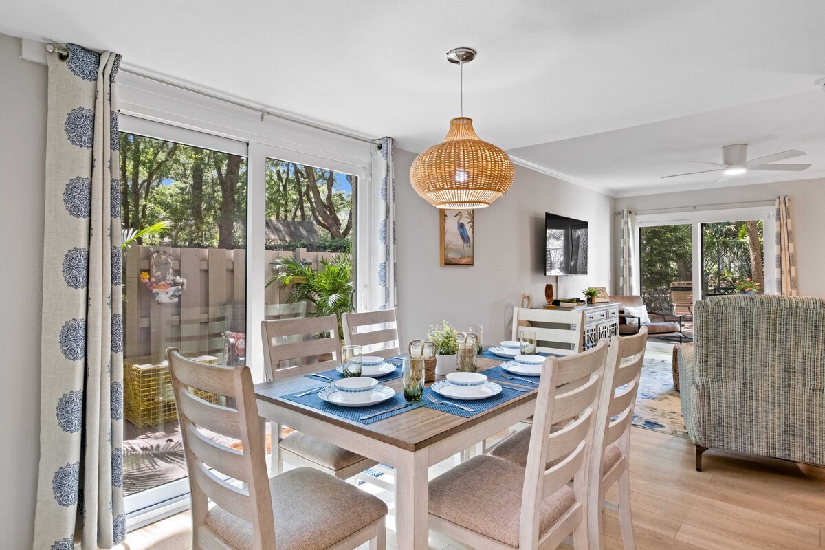 This end-unit townhome is just 0.3 mi from Folly Field Beach Park, is dog-friendly, and has 3 lovely private outdoor shaded spaces to enjoy - one even backs up to a golf course! Sleeps 6: 🛌 King-sized Sleep Number® bed upstairs 🛌 2 twin beds upstairs 🛋️ Queen sleeper sofa in the living room Well-equipped kitchen Includes: * stainless steel appliances * slow cooker * blender * waffle maker * coffee station, Keurig drip and pods * electric kettle * Stainless steel cookware * indoor and outdoor dining for 6 * Gas grill, charcoal available near pool Within Walking Distance: 🌟 Beach - 0.3 mi to Folly Field Beach Park 🌟 Restaurants 🌟 Mini-golf 🌟 Arcade 🌟 Free seasonal Breeze Trolley 🌟 Pathway: 64 miles of bike and walking paths Other Items: 🤩 full-size washer and dryer 🤩 beach-related items such as towels, a wagon, beach chairs, a cooler, an umbrella, and sand toys 🐕🦺 Up to 2 housebroken, well-behaved dogs under 50 lbs are welcome, with a $125 fee. No other animals are allowed. Dogs must be crated when not with you. Excessive barking is not allowed. 🎲 Puzzles, cards, and games 🤫 Hilton Head Island has quiet hours from 10 pm to 7 am. Please help us keep our rental license by following these quiet hours - thank you! Please note: - There is one assigned parking space and we can obtain a guest pass for one additional vehicle. No trailers or branded work vehicles are allowed. - All reservations require a SIGNED RENTAL AGREEMENT and government-issued PHOTO ID to complete the booking. (E-sign document sent after booking, both must be returned within 48 hrs.) - No smoking, vaping, etc on the premises. - No third-party rentals. - Renter must be a minimum of 25 years old. - No glitter, dye, or confetti. *** Note that this home is equipped with a device that monitors - but does not record - the environment inside the property (including noise levels, temperature, and motion (HVAC only)) to ensure guests have a pleasant stay and our neighbors are not disturbed. For your protection, this home has exterior-facing security cameras. These cameras record video and audio only when detecting movement. No tampering with, blocking, or disconnecting sensors, cameras, or wifi is allowed. *** Thank you for taking a look, we look forward to having you as our guest! Our prices include all fees. No hidden fees.