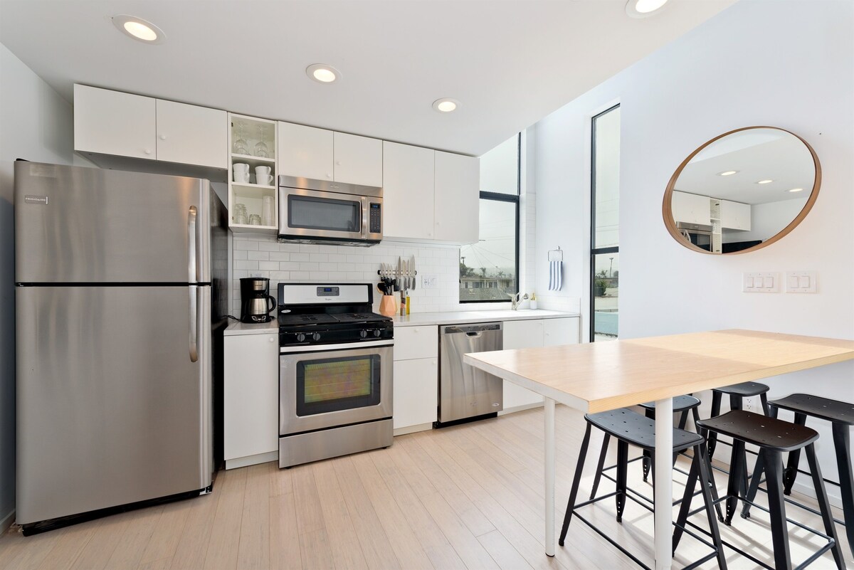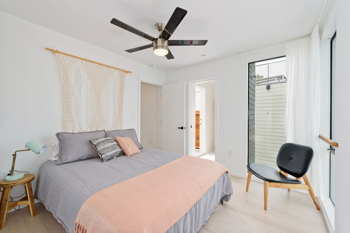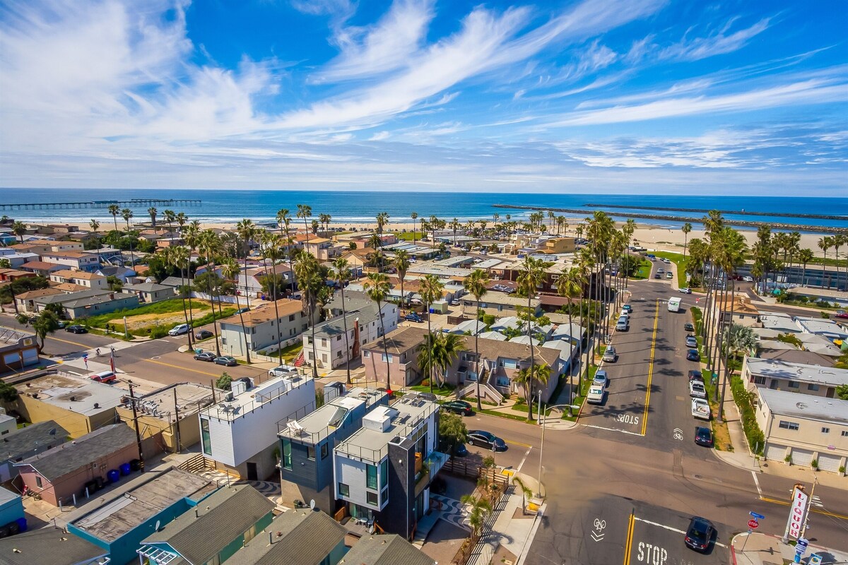 Ocean Beach's newest homes, designed by local designer/developer Pedro Tavares sit only a block from the sand. This new home features a panoramic roof deck with ocean and bay views, high ceilings with large windows for plenty of natural light, quality bedding, and new appliances in a fully equipped kitchen. It's only one block from the beach, and easy walking distance to countless restaurants and tasting rooms. Summary → Walk Score 80 (most errands accomplished on foot) → 650ft² / 60m² panoramic roof deck with ocean views, BBQ, hammock → One block to the beach, walking distance to countless restaurants and tasting rooms → Onsite parking for up to 2 vehicles → Outdoor shower → Fully equipped + stocked kitchen → SmartTV w/ Netflix (no cable) → Extremely safe neighborhood → 11min drive to downtown San Diego → Bike Score 87 (very bikeable) The Space First Bedroom • Queen sofa bed • 2 twin beds in a semi-private sleeping loft • TV • En-suite bathroom Second Bedroom • Queen bed • Bathroom Common Space • Semi-private sleeping loft with a queen bed • Reading nook with a twin mattress • Full size sofa bed • Full bathroom • Kitchen • TV Guest access Entire space plus rooftop deck is included in this rental. Please, make yourself at home. Check-in and check out is simple; an email will be sent a few days before your arrival with detailed instructions. Other things to note Ladder and stairs — The home is three stories and requires use of stairs. The lofts are accessible by an indoor ladder and is not recommended for young children. Parking — This unit parks up to 2 cars depending on size in tandem. One space is covered in a carport. No Smoking - Smoking is not allowed anywhere on the premises. An additional cleaning fee of $100 may be charged for cigarette butts found on the property No Parties - Parties without prior written permission are not welcome here. Please spare our environment. A $100 cleaning fee will be charged for any confetti found. Our prices include all fees. No hidden fees.