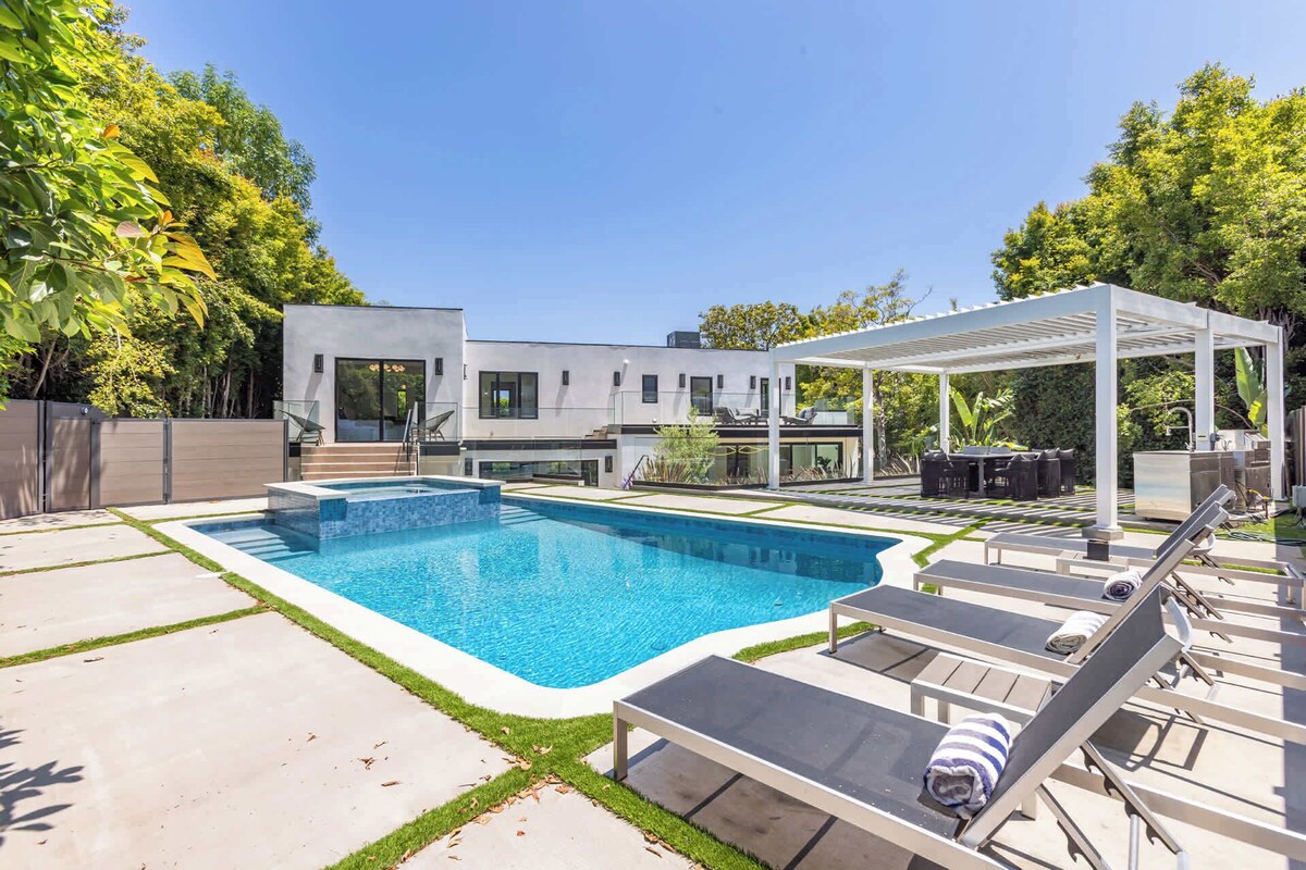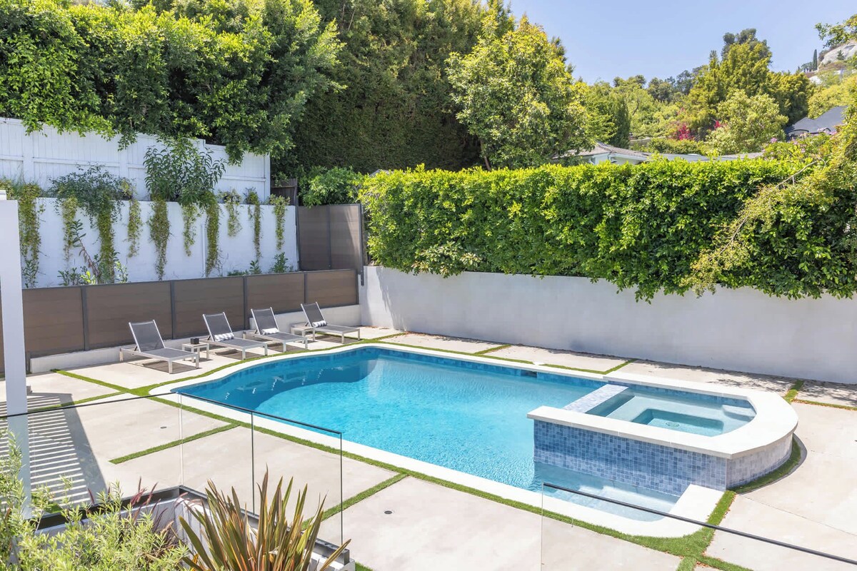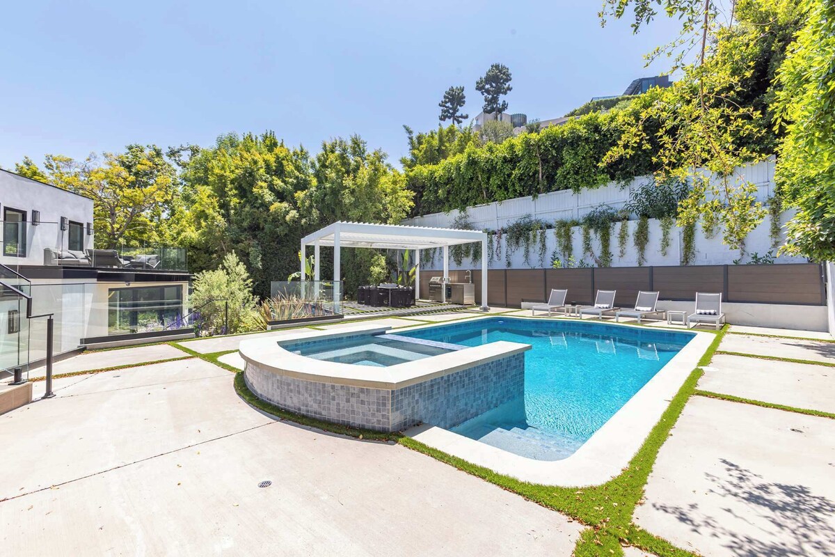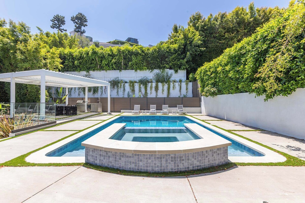 Summary: This gated designer villa above the Sunset Strip blends luxury and style with an open layout, oak floors, and a chef’s kitchen featuring Miele appliances and a marble island. The primary suite offers dual walk-ins, a lounge, and private pool access. Each bedroom has an en-suite bath and patio. Enjoy the pool, spa, fire pit, and alfresco dining under a smart pergola. Gated parking for five and just minutes from Sunset Plaza. The Space: The home features two stylish living areas, a chef’s kitchen, dining space, and one guest bedroom on the main floor. Upstairs, you'll find two additional bedrooms plus a luxurious master suite—each with a private patio and en-suite bathroom. A dedicated office is located on the second floor. Outside, enjoy a large pool, hot tub, fire pit, lounge seating, and sunbeds. The gated driveway accommodates up to five vehicles. Guest Access: Guest will have access to the entire property. The Neighborhood: This home is perfectly situated in the exclusive hills just above the Sunset Strip, offering the ideal blend of privacy and proximity. Enjoy quick access to Sunset Plaza’s vibrant dining, boutique shopping, and nightlife, all just minutes away. Nestled in a quiet, upscale neighborhood, the area is popular with celebrities and creatives, offering sweeping city views, lush surroundings, and a true taste of the iconic Hollywood Hills lifestyle. Other Things to Note: Other Things to Note: NO PARTIES, LOUD MUSIC MAXIMUM OCCUPANCY (8 PPL) MUST BE RESPECTED AT ALL TIMES ANY PARTIES WILL RESULT IN IMMEDIATE EVICTION It's is of utmost importance to note that all noise and music must remain indoors and at a reasonable level by 9-10pm. The neighbors are extremely sensitive, so it's crucial that all activities and noise levels are respectful at all times. We can't have complaints of obtrusive music, guests entertaining, or people hanging out by the pool being loud. It's important to be mindful of this before booking. Any gatherings of more than 8 people are not allowed on the property unless discussed and cleared with the host before check in. Rules of the house: - No parties, loud music or gatherings of more than 8 people allowed in the house - Max occupancy of 8 people must be respected - No use of pool area and rooftop past 10pm - Pool sliding doors must be kept closed after 10pm - Pets allowed on a case by case basis - please check with host before arrival as there will be a pet fee - Smoking prohibited indoors (outdoors ok)- There will be fine for smoking indoors - There will be a charge per towel for any stained/ruined towel - There will be charge per duvet cover for any stained/ruined duvet cover - There will be charge per sheet for any stained/ruined sheet - There will be charge if the house is left excessively messy and requires additional cleaning Guests must be transparent and truthful about the questions asked by the house at booking. It's a very quiet neighborhood and the neighbors have zero tolerance for noise disturbance. There are noise monitoring devices and cameras. Non compliance with the rules cited above or complaints from neighbors will result in immediate eviction. If you wish the pool heated, please request it as there is an extra charge for that service. Our pool maintenance technician comes every Wednesday to maintain the pool. Upon check in, please report any damages to avoid being charged. We understand that sometimes accidents happen! Should you break anything please let us know immediately - if it's minor we usually won't charge. If it's a larger issue, we would like to agree on the cost with you before you leave to avoid any issues later. Thank you! Our prices include all fees. No hidden fees.