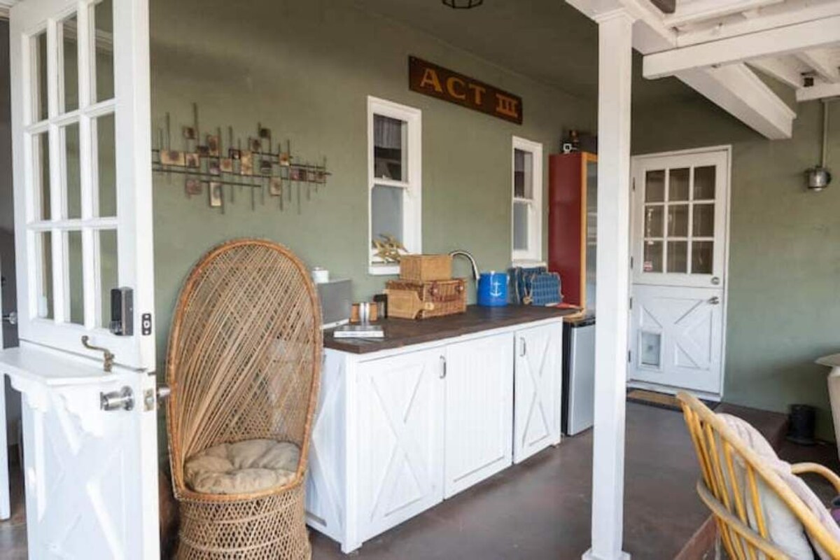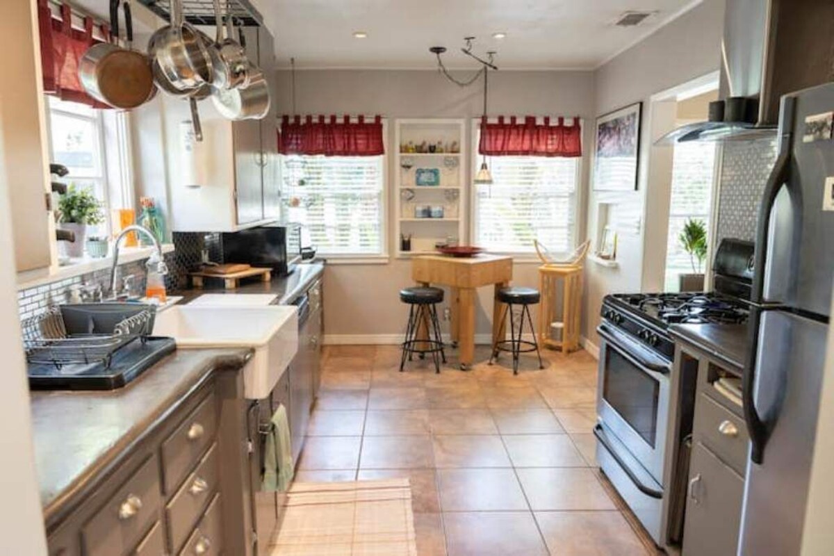 About this space (FIRE RELOCATION DISCOUNT please contact me directly.) Families and friends welcome to this great comfortable place that is centrally located to everything. Close walk to grocery, gym and shops. 8 mi. to Universal City. 11 Mi. to Hollywood Walk of Fame. 17 mi. to the Santa Monica Pier and beach. 18 mi. to Magic Mountain and 45 Mi to Disneyland.. The space You enter to a bright comfortable living room with floor to ceiling picture windows looking out to a greenery-enclosed front yard. The living room has a big soft comfortable couch, white stone fireplace next to a 55 in TV with Sono speaker surround sound throughout the living room. Formal dining room, 2 bedrooms with kingsize and queenside beds. The couch and a blow up mattress are the other sleeping areas. Full kitchen that was actually featured on HGTV's \ (A show from years ago) that installed a farm sink, cement counter tops and Stainless Steel Subway Tiles. But the pride of the house is... (Of course after the surround sound in the living room) is... our latest remodeled white marble and tiled bathroom with big deep soaking bath tub and bidet. That brings us to the last of our illustration. We have a really great comfortable outside space with another big soft couch, dining area, BBQ grill, water fountain and wood burning stove all in a private enclosed yard. Registration number HSR22-002088 Our prices include all fees. No hidden fees.