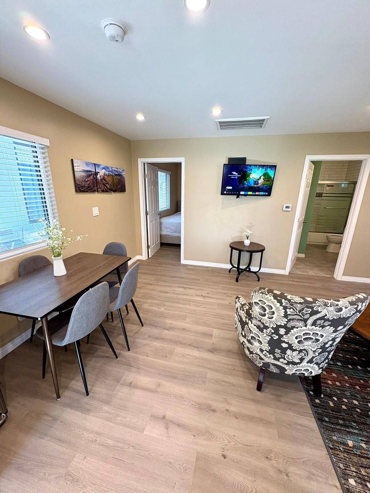 * Dining Area: Gather around the dining room table with seating for four.