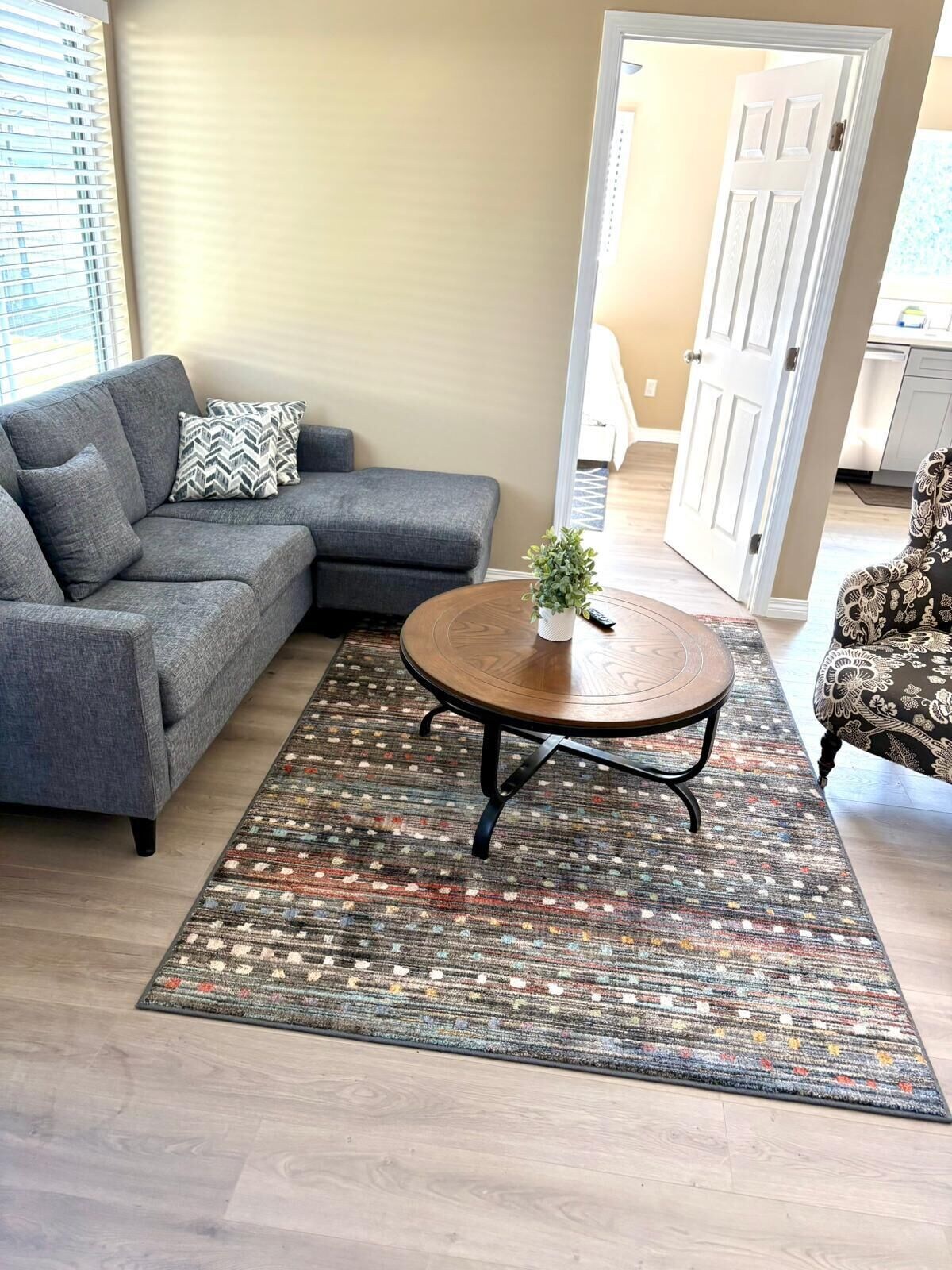 * Interior: 2 bedrooms (1 queen, 1 twin) with TVs, 1 bathroom, and an inviting living room with an L-shaped sofa. Freshly cleaned Bed linens, blankets and Bathroom Towels provided.