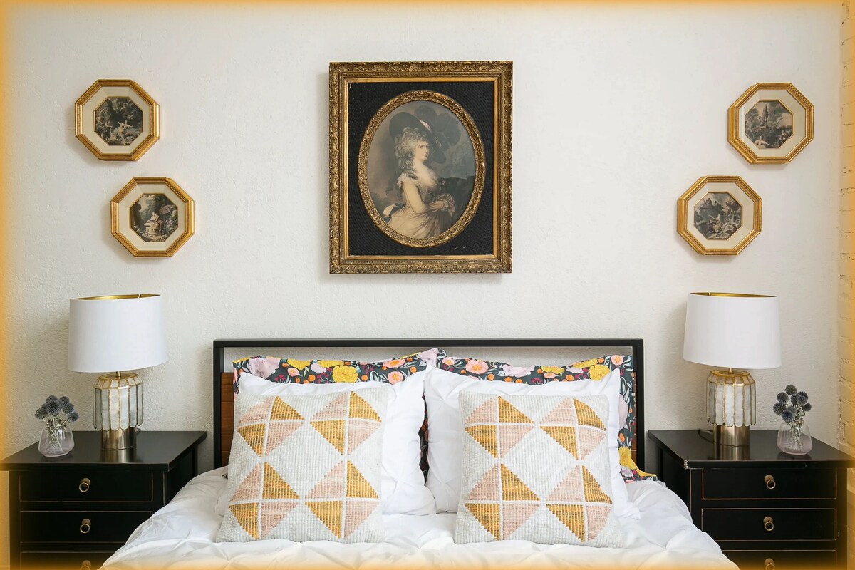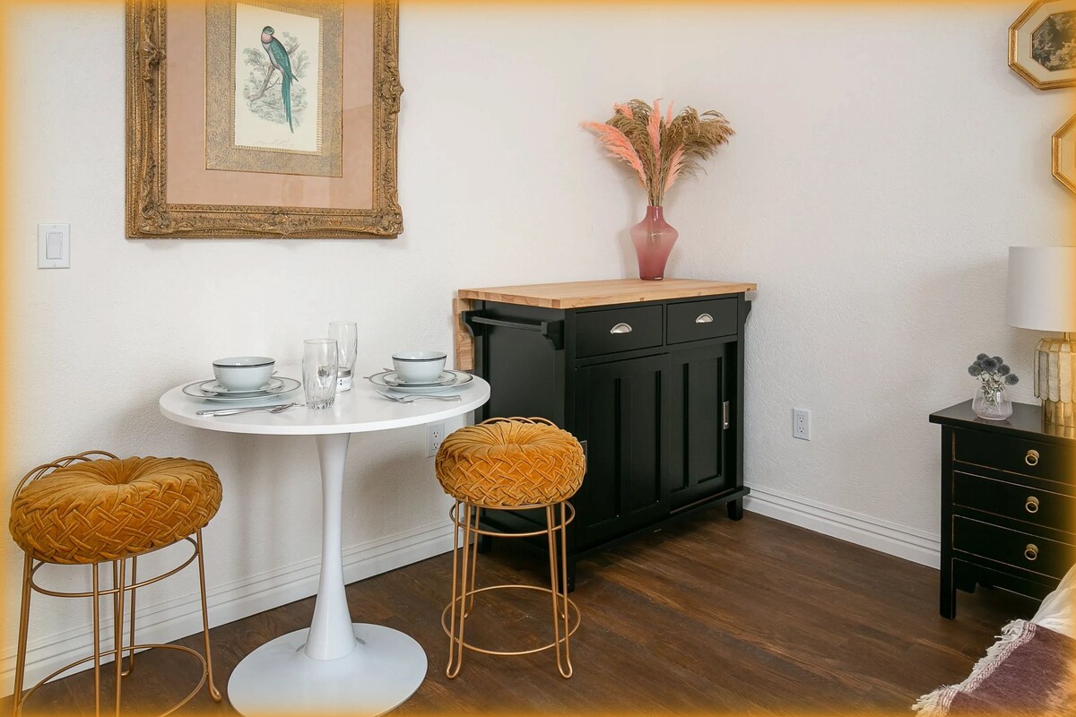 Embrace the charm of this Victorian-inspired unit, where classic elegance meets modern convenience. With tall ceilings, rich wood floors, and thoughtfully curated decor, this space feels both cozy and spacious. Whether you’re here for business or leisure, the comfy bed, WiFi, AC, and TV make it a perfect retreat for one or two guests.