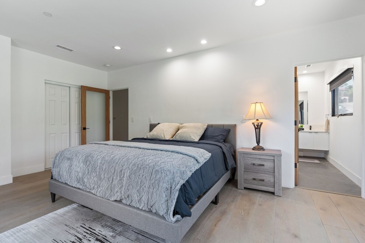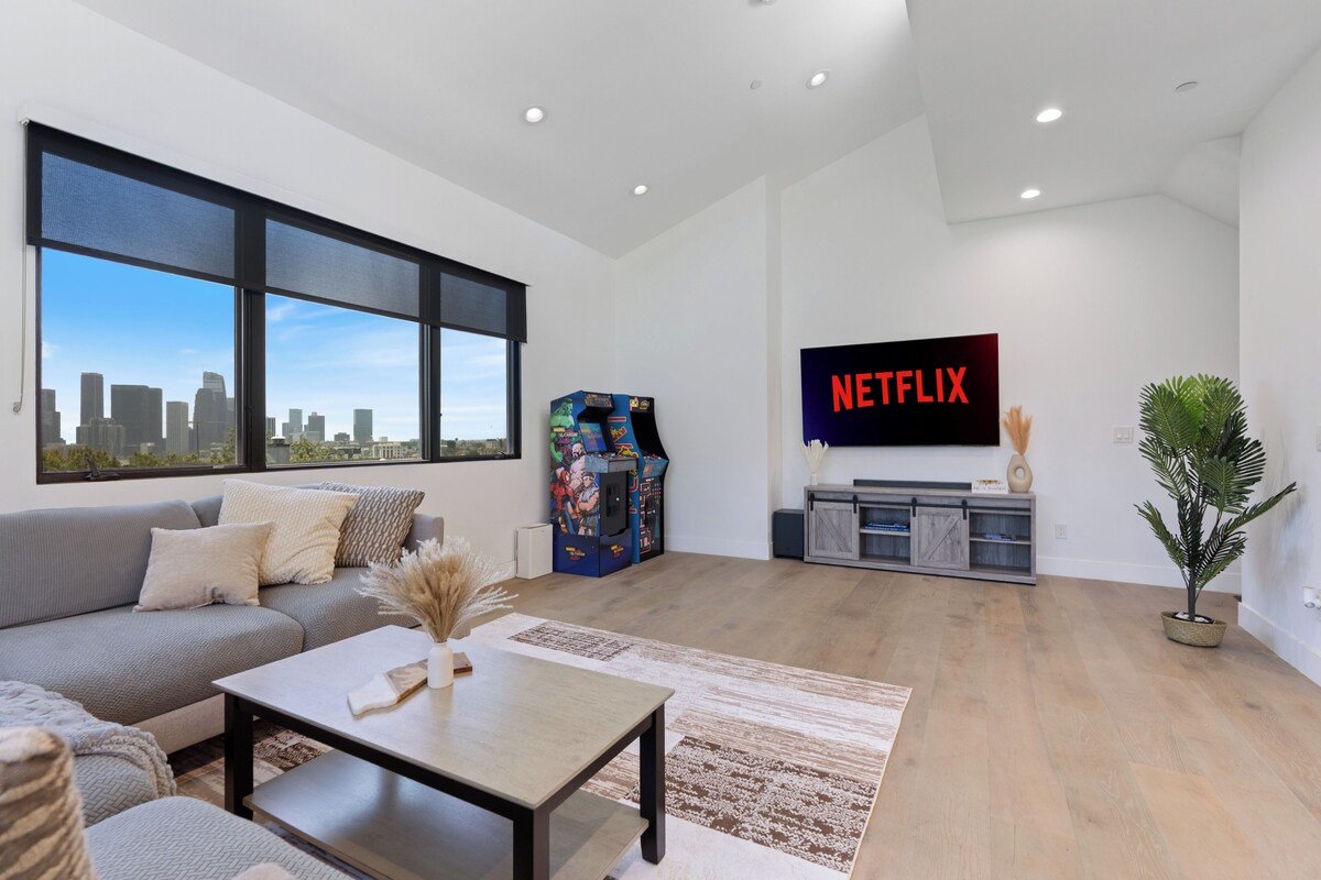 Experience elevated Los Angeles living in this modern single-family home, perched in the Victor Heights section of Echo Park and offering panoramic views of the city skyline. You're just moments away from neighborhood favorites like Guisados, Eightfold Coffee, and Tsubaki, with Everett Park right across the street. The home’s prime location offers seamless access to major freeways and is ideally situated for exploring the city—only a 10-minute drive to Crypto Arena & the Silver Lake Reservoir. The space This beautifully designed modern 2-bedroom, 2.5-bathroom home is nestled in the highly desirable Victor Heights neighborhood of Echo Park and offers sweeping, unobstructed views of the Los Angeles skyline. Located directly across from the serene Everett Park, the home provides a peaceful retreat while being just minutes from major freeways, trendy shops, local markets, and all that Echo Park and Downtown LA have to offer. It’s also within walking distance of Dodger Stadium and just a 15-minute drive from the heart of Hollywood, making it the perfect blend of convenience, comfort, and city living. From the moment you step inside, you’ll be welcomed by walls of floor-to-ceiling glass that flood the interior with natural light and provide breathtaking views of the cityscape. The living room features soaring vaulted ceilings that enhance the sense of space and openness, creating a perfect setting to unwind or entertain. For your entertainment, the living room is equipped with a 70\ ,
