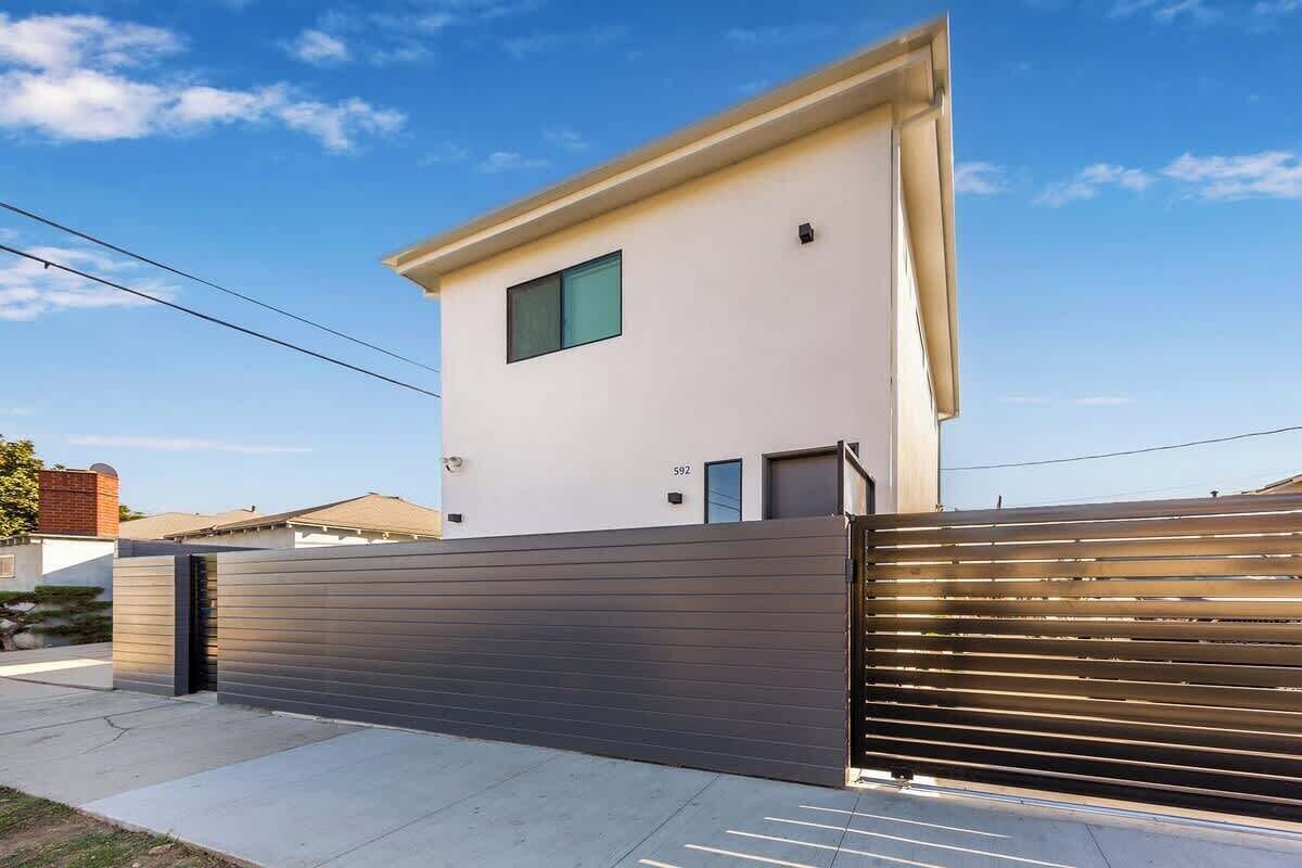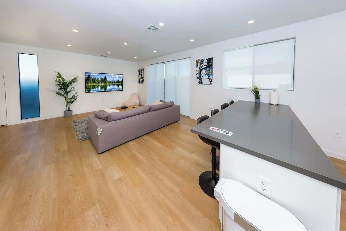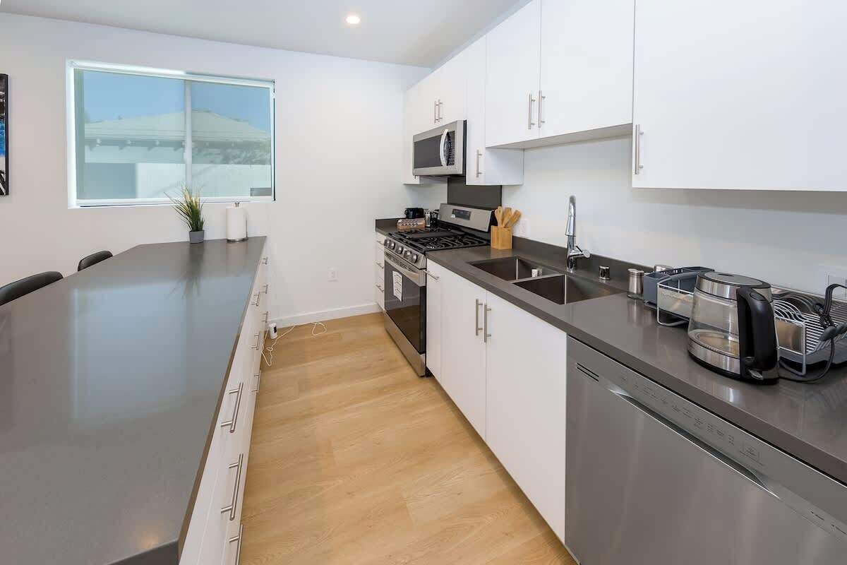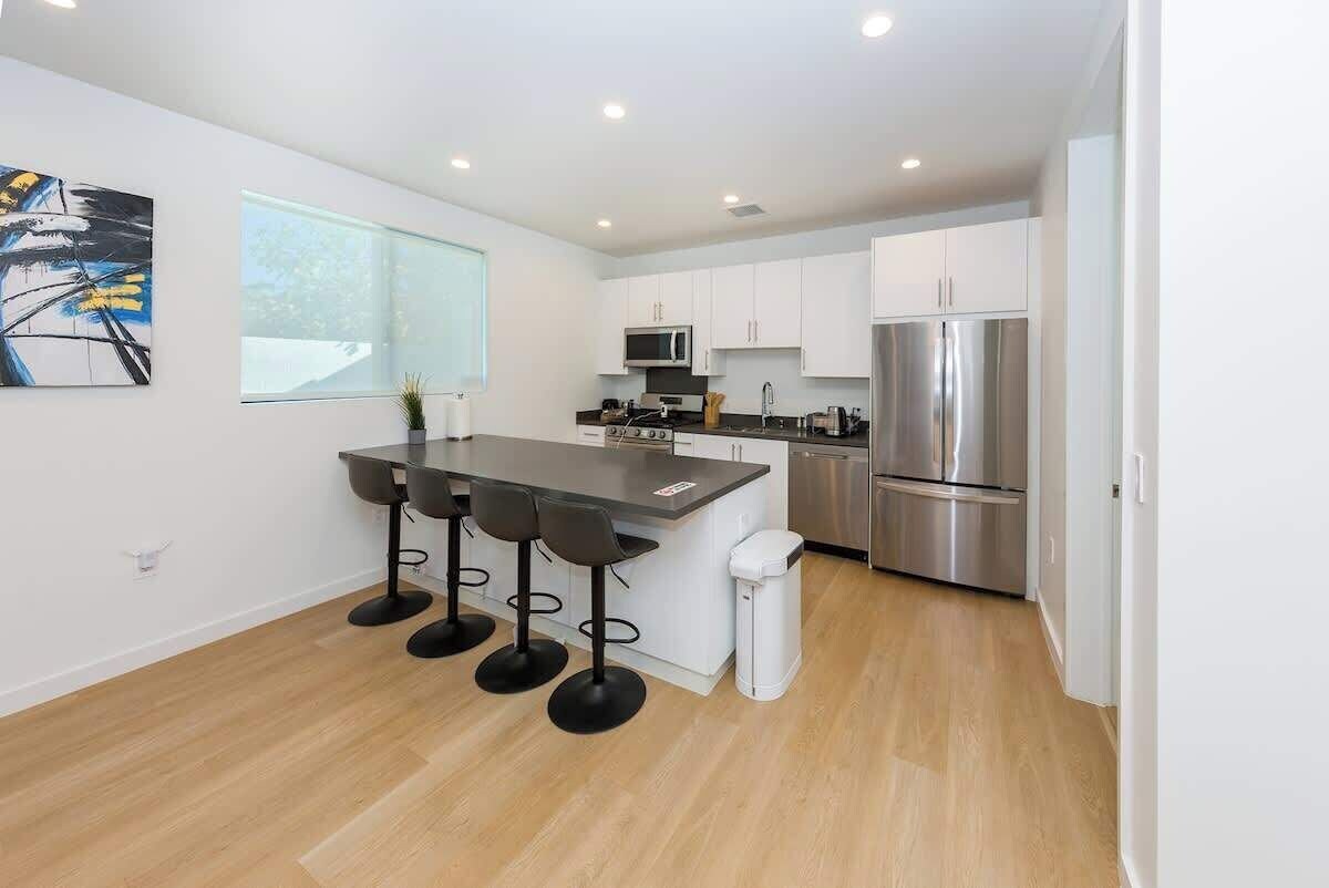 Summary: Enjoy this newly built 2-bedroom, 2.5-bathroom back house located just minutes from top LA attractions. This stylish two-story home features an open-concept layout with a full kitchen, kitchen island, dining and living area with a smart TV. Upstairs, relax in a king bedroom with an en suite bath or a queen bedroom with a separate bathroom. Each bedroom has its own TV. No bedrooms downstairs. Includes all essentials for a comfortable stay. The Space: Welcome to your ideal Los Angeles stay! This brand-new, two-story back house was completed within the last two years and offers a perfect combination of comfort, style, and convenience. On the first floor, you'll find a large open-concept living space with a spacious living room, dining area, and a full kitchen featuring a beautiful kitchen island. A half bathroom with a toilet is also located downstairs for added convenience. Please note that there are no bedrooms on the first floor. Head upstairs to find two well-appointed bedrooms. The primary bedroom features a king-size bed and an en suite bathroom with a bathtub — perfect for soaking and unwinding. The second bedroom includes a queen-size bed and a separate full bathroom with a shower. Each bedroom has its own smart TV, and there's also a large smart TV in the living room. Guests will enjoy all the standard amenities, including shampoo, conditioner, body wash, coffee, sugar, a hot water kettle, drip coffee machine, microwave, refrigerator, stove, oven, cooking essentials, towels, and linens. High-speed WiFi is available throughout the unit. This home is perfect for couples, families, or small groups seeking a clean, comfortable, and stylish place to stay near the best of LA. The Neighborhood: Located in a quiet residential neighborhood, this property is centrally positioned to explore the best of Los Angeles. Just a short drive from Beverly Hills, Culver City, and West Hollywood, you'll have access to world-class dining, shopping, and entertainment. Whether you're visiting local attractions, working remotely, or simply looking to relax in a peaceful setting, this location offers both convenience and tranquility. Other Things to Note: The unit is located at the back of a residential lot and features its own private entrance. Please note: this is a two-story home with no bedrooms on the first floor. Quiet hours are observed to respect our neighbors, and check-ins are not permitted after 10:00 PM. For your safety, exterior security cameras are installed at entryways and common areas only. Check-out time is 11:00 AM. Late check-outs without prior approval will incur a $100 fee per additional hour. We kindly ask all guests to complete a short check-in form before arrival. Once submitted, we’ll send over your check-in instructions. The form will request each guest’s contact info, and a valid ID with a quick selfie. This simple step helps ensure that only registered guests are staying at the property. Your information will always remain private and confidential.. Our prices include all fees. No hidden fees.