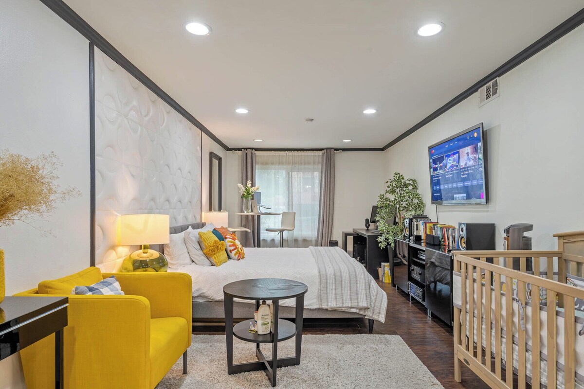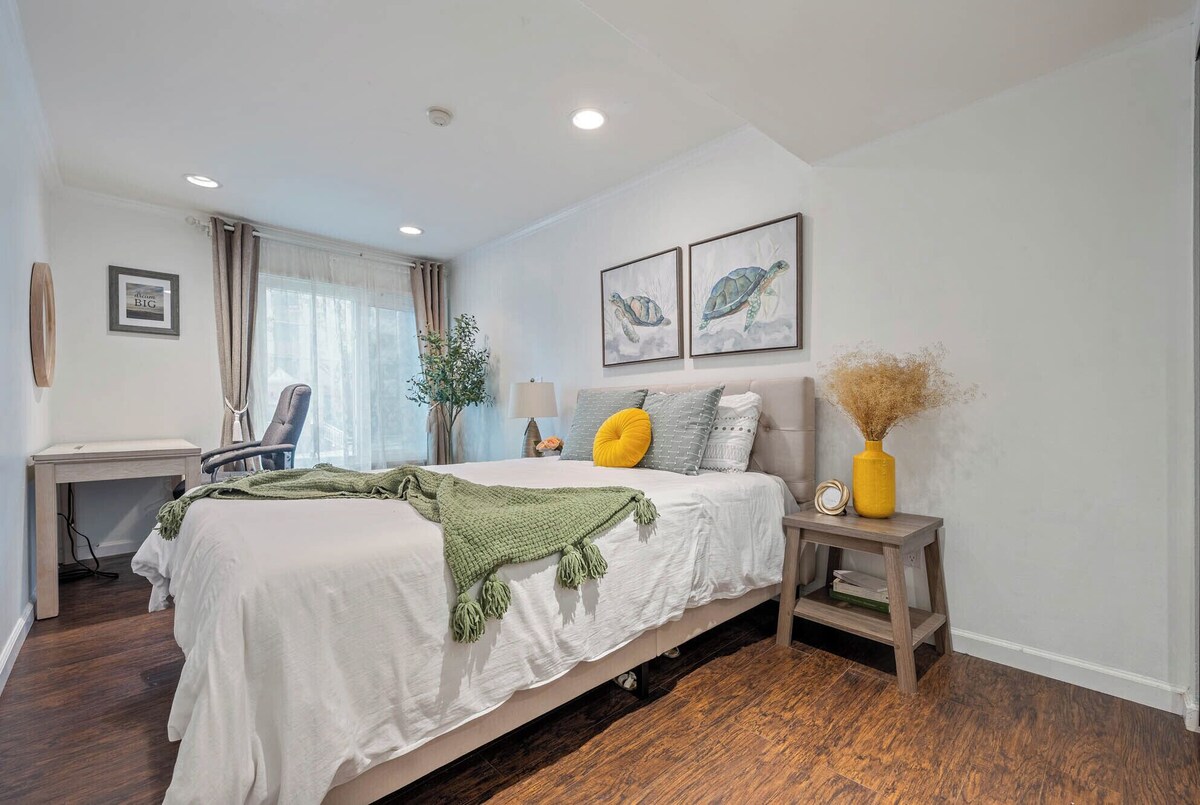 Looking for a place right in the heart of Hollywood? This is your new place. Just a quick walk few minutes 2 Walk of Fame, Hollywood and Highland, TCL Chinese theater, you are right at the center of it all. There are plenty of fine dining, shoppings, night clubs, & entertainment options around here for you. Also just a quick ride to West Hollywood and Beverly Hills makes this place a great location to stay. The complex has a heated pool, a hot tub, gym and sauna. Wonderful place for visiting LA! HIGHLIGHTS: 2 bedroom 2 bathrooms 1200 square feet condo on first floor super convenient very good size 1250 sq ft BED ARRANGEMENTS: Bedroom 1: King bed + ensuite bathroom Bedroom 2: Queen bed Hallway bathroom KITCHEN & DINING: Fully equipped modern kitchen Dining table for 8 AMENITIES: High-speed internet Smart 2 TVs, one in living room, one in master bedroom Stocked essentials for bathing, cooking & sleeping LAUNDRY: In-unit washer & dryer with complimentary detergent PARKING: 2 car tandem parking and guest parking PETS Pet fee: $35 per pet, per night. Flat rate available depending on the number of nights and pets. There is pet designated area next to the unit Our prices include all fees. No hidden fees.
