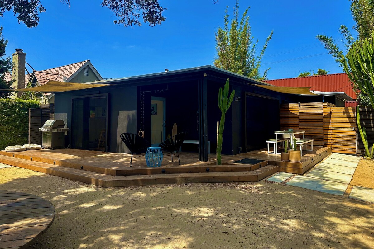 Updated Mid Century 2 bedroom 1 bath entire home with full surround decking in Mar Vista. Experience a Rad Stay with desert beach vibes. Perfectly located less than 2 miles from beach and walking distance only 2 blocks from down town Mar Vista and shops and restaurants. House is fully remodeled with an indoor/outdoor open air aesthetic. Window walls with large sliding glass doors and screens fully open each living space on to outdoor decks and patios. Have dinner inside outside of the living room while watching movies or sports on projector with surround sound. Chill in the front yard around fire pit with 4 independent charging stations for laptops/phones/tablets. Have a romantic soak for two in primary bedroom private patio. Two dog doors that allow dogs in and out on their own to enjoy the large yard. Our prices include all fees. No hidden fees.