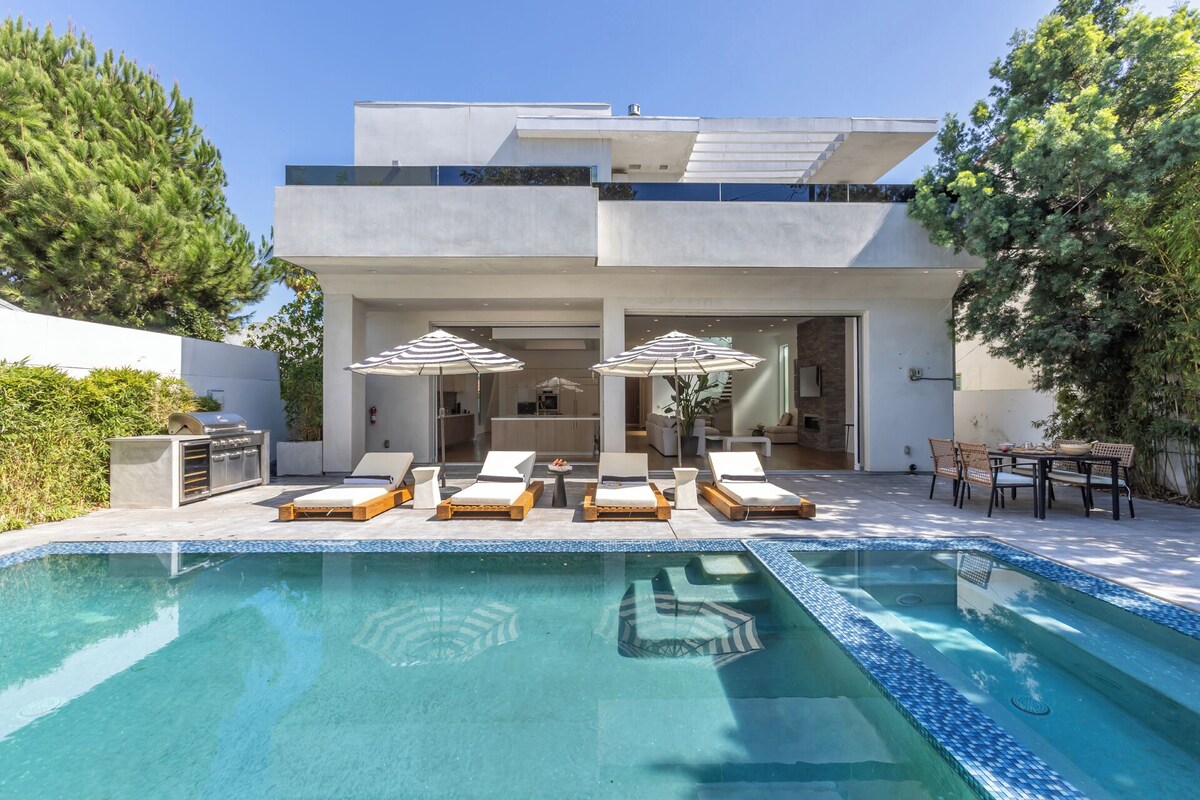 Discover a modern retreat just steps from Melrose & Fairfax, with soaring ceilings, an open layout, and a backyard oasis featuring a heated pool, spa, fire pit, and outdoor kitchen. On a quiet street yet close to shops, dining, and the iconic sunset boulevard. It’s the perfect blend of LA energy and total relaxation. This inviting home in vibrant West Hollywood combines luxurious design with unbeatable comfort. Step inside to soaring ceilings, professional furnished interior, and streams of natural light throughout the spacious open layout. Pocket doors slide away to create a seamless transition between indoors and the expansive private backyard, offering a true California-style indoor-outdoor living. The backyard oasis is perfect for gatherings, featuring a heated pool and spa, built-in outdoor kitchen, dining area, and a cozy firepit lounge. Five spacious bedrooms each offering an ensuite bathroom. The bed setup (2 Kings, 3 Queens) ensures ample space for everyone. The master suite features a private balcony and an oversized bathroom with steam shower, and a luxurious soaking tub. Two additional bedrooms also offer private balconies with stunning views overlooking the Hollywood sign. Chefs will love the fully stocked oversized kitchen with an expansive island, premium Miele appliances, ready for everything from casual breakfasts to gourmet dinners. Guests may park one car in the garage and another in the driveway, with additional unrestricted street parking available. A 240-volt EV charger outlet is also available for guests in the garage. Enjoy fast access to Los Angeles attractions while relaxing in your own private retreat. Experience the best of West Hollywood living in a home designed for luxury, convenience, and relaxation. Proximity to popular destinations in Los Angeles: - LAX Airport: 25 minute drive - Sunset Strip: 5 minute drive - Beverly Hills: 5 minute drive - The Grove Mall: 10 minute walk - Melrose Shopping District: 5 minute walk - Venice Beach and Santa Monica: 20 minute drive - Griffith Observatory: 15 minute drive - Sofi Stadium: 30 minute drive - Intuit Dome: 30 minute drive Other things to note: -Pool heating is available for $100 per day. -Parties are strictly prohibited. Our prices include all fees. No hidden fees.