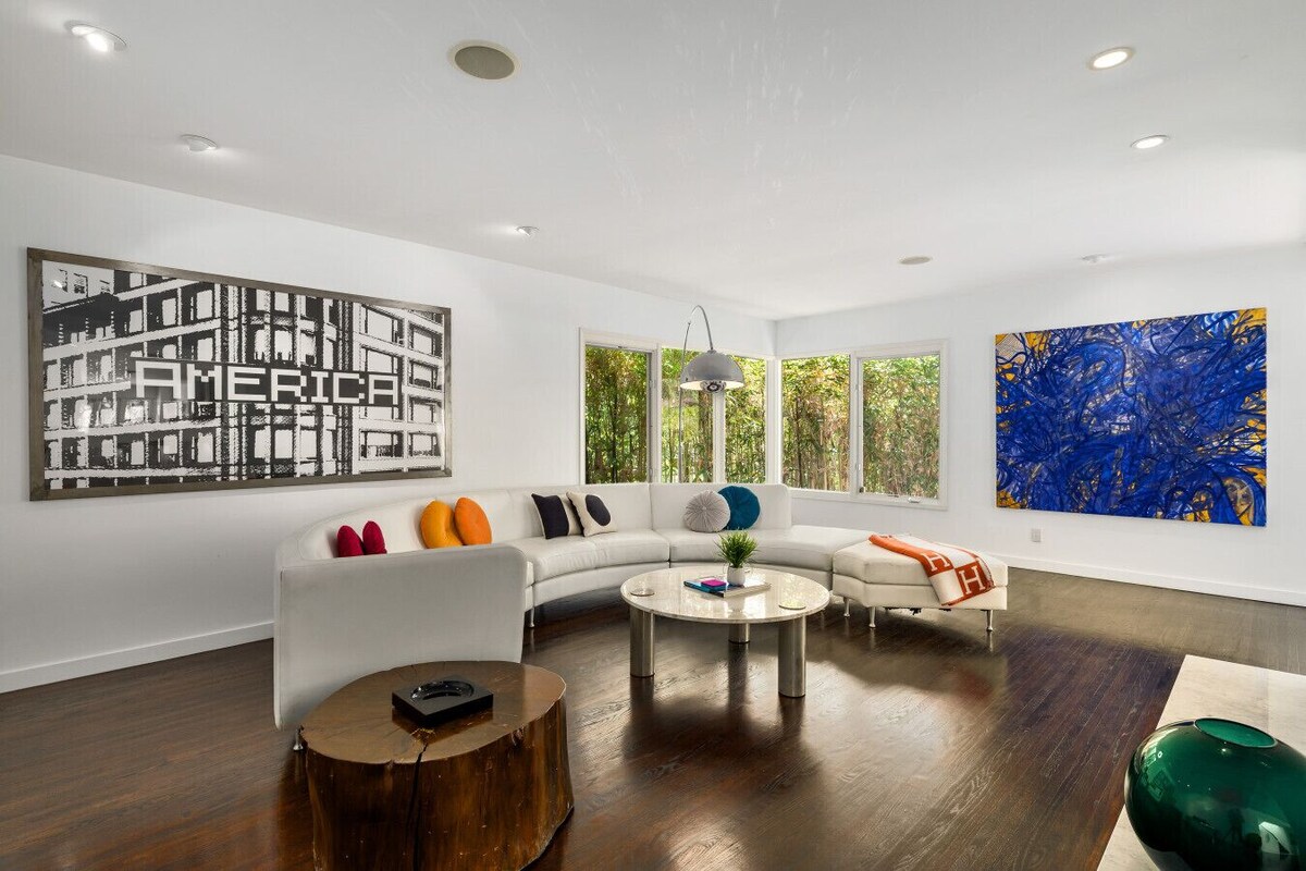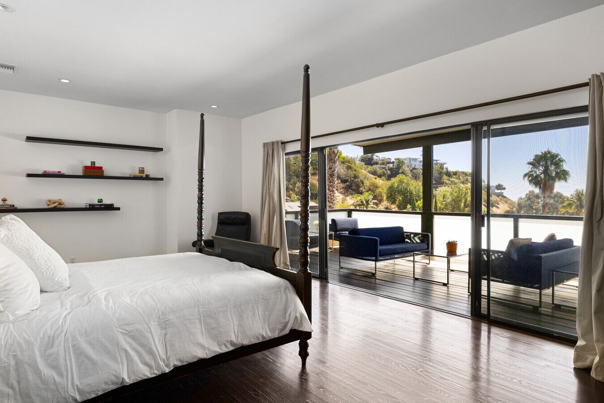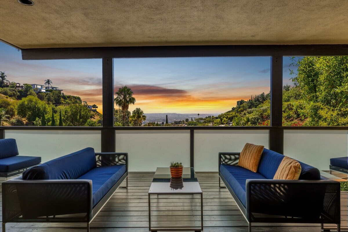 Experience timeless LA living in this 1960s mid-century modern gem set in the coveted Bird Streets. This 2-story home offers a spacious master suite with a private balcony overlooking panoramic city views, and a Palm Springs–inspired backyard with a pool perfect for soaking up the sun. Just moments from the Sunset Strip, this glamorous escape offers seamless indoor-outdoor flow, chic design, and luxurious comfort, perfect for unforgettable stays in the Hollywood Hills. Permit: HSR25-002227 This thoughtfully curated home embraces the clean lines and open flow of classic mid-century modern design. The main level features airy living and dining areas framed by expansive windows that fill the space with natural light and showcase stunning hillside views. The sleek fully equipped kitchen inspires home-cooked meals. Two ensuite bedrooms and a half bathroom are also on this level. Upstairs, the nearly 1,200 sq ft master suite spans the entire floor, complete with a spa-style bathroom featuring a standing tub, two walk-in closets, an office space, and a private balcony, ideal for enjoying morning coffee or sunset drinks while taking in the skyline. Stylish furnishings and curated artwork enhance the home’s authentic 1960s charm. Guests enjoy full private access to the entire two-story home and the backyard surrounded by lush greenery. Lounge by the sparkling pool, unwind on the upstairs balcony with a panoramic city view, or retreat indoors for cozy movie nights. High-speed Wi-Fi, Smart TVs, central A/C, in-home laundry, and gated off-street parking for up to 5 cars, everything you need for a comfortable and luxurious stay. Pool heating available upon request (extra fee: $150 for first day, $100/day thereafter; limited to 84°F). Shallow pool and is not meant for diving. Please, watch your children closely in the pool. Nestled in the sought-after West Hollywood Hills, this home offers tranquility just minutes from the city’s best. Explore the renowned dining, shopping, and nightlife of the Sunset Strip and Melrose Avenue, or hike nearby Runyon Canyon for iconic city views. The neighborhood’s hillside setting offers privacy, serenity, and quick access to Beverly Hills, Hollywood, and beyond, making it the perfect base for a luxurious Los Angeles escape. Our prices include all fees. No hidden fees.