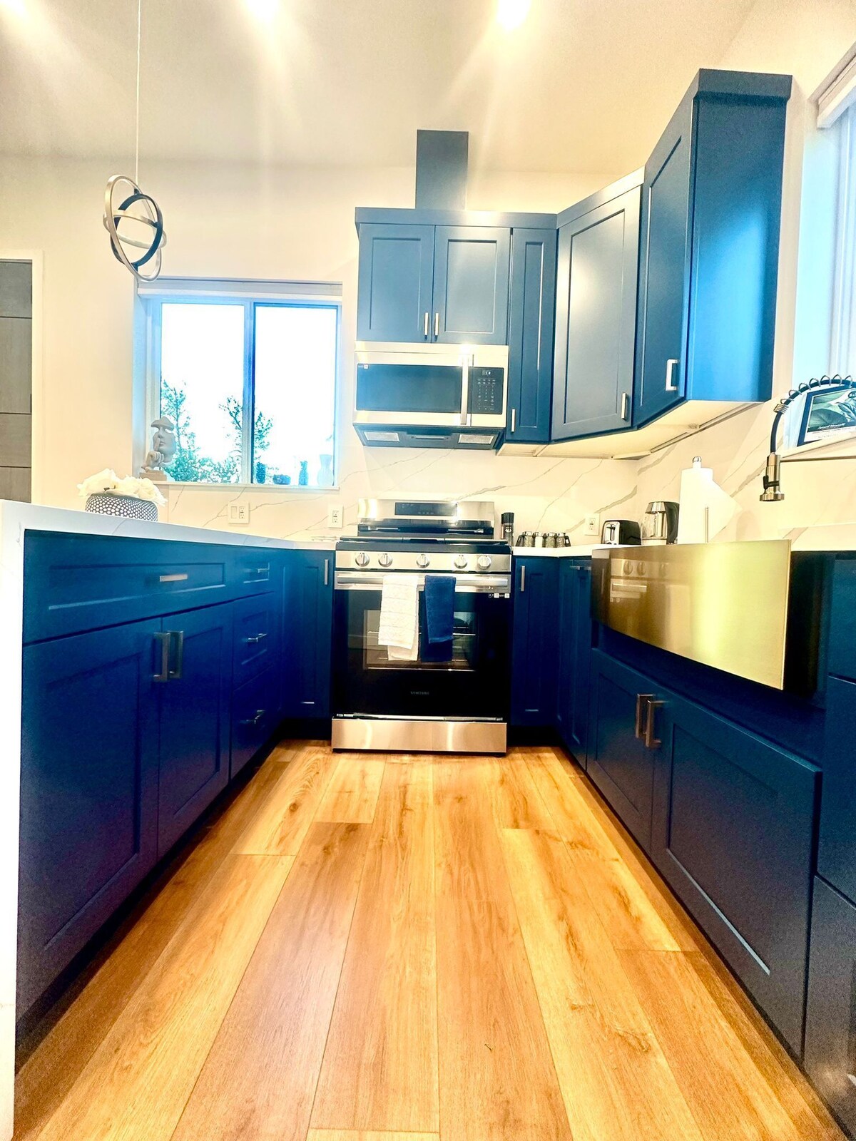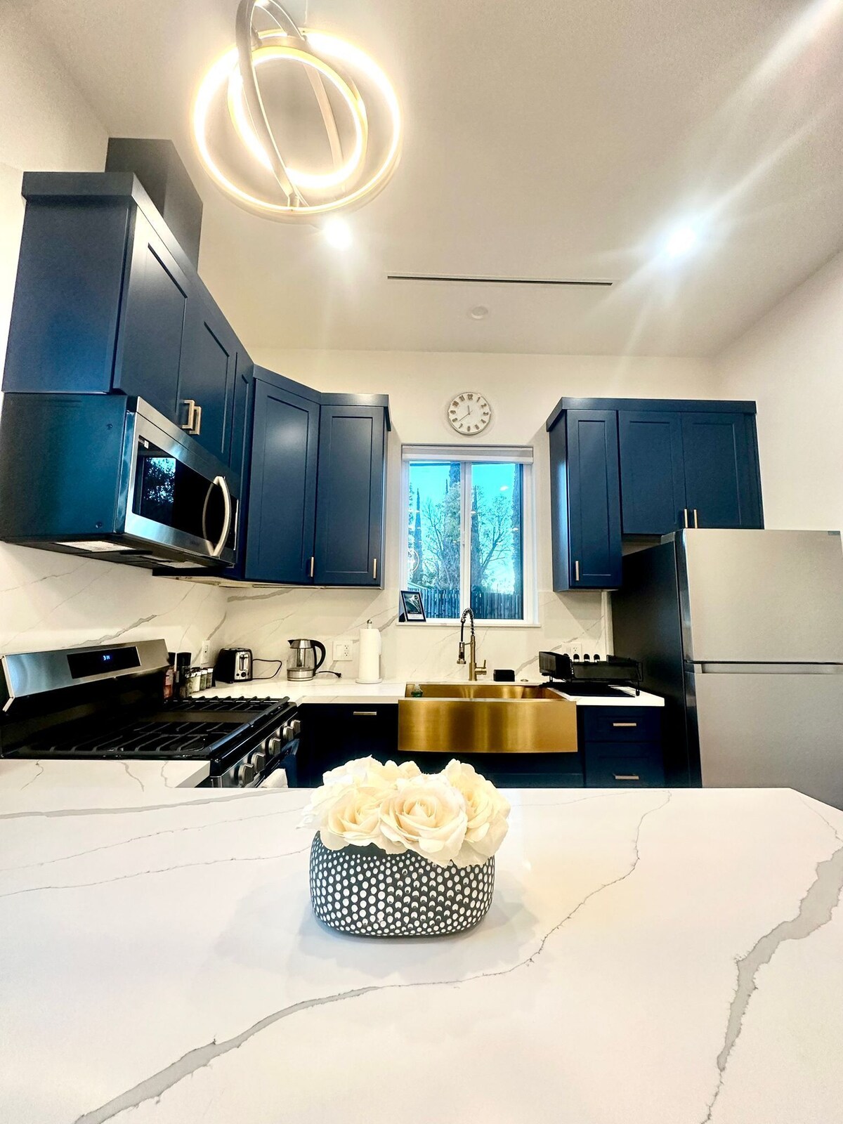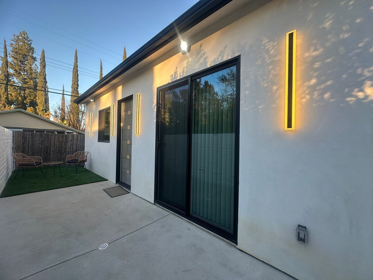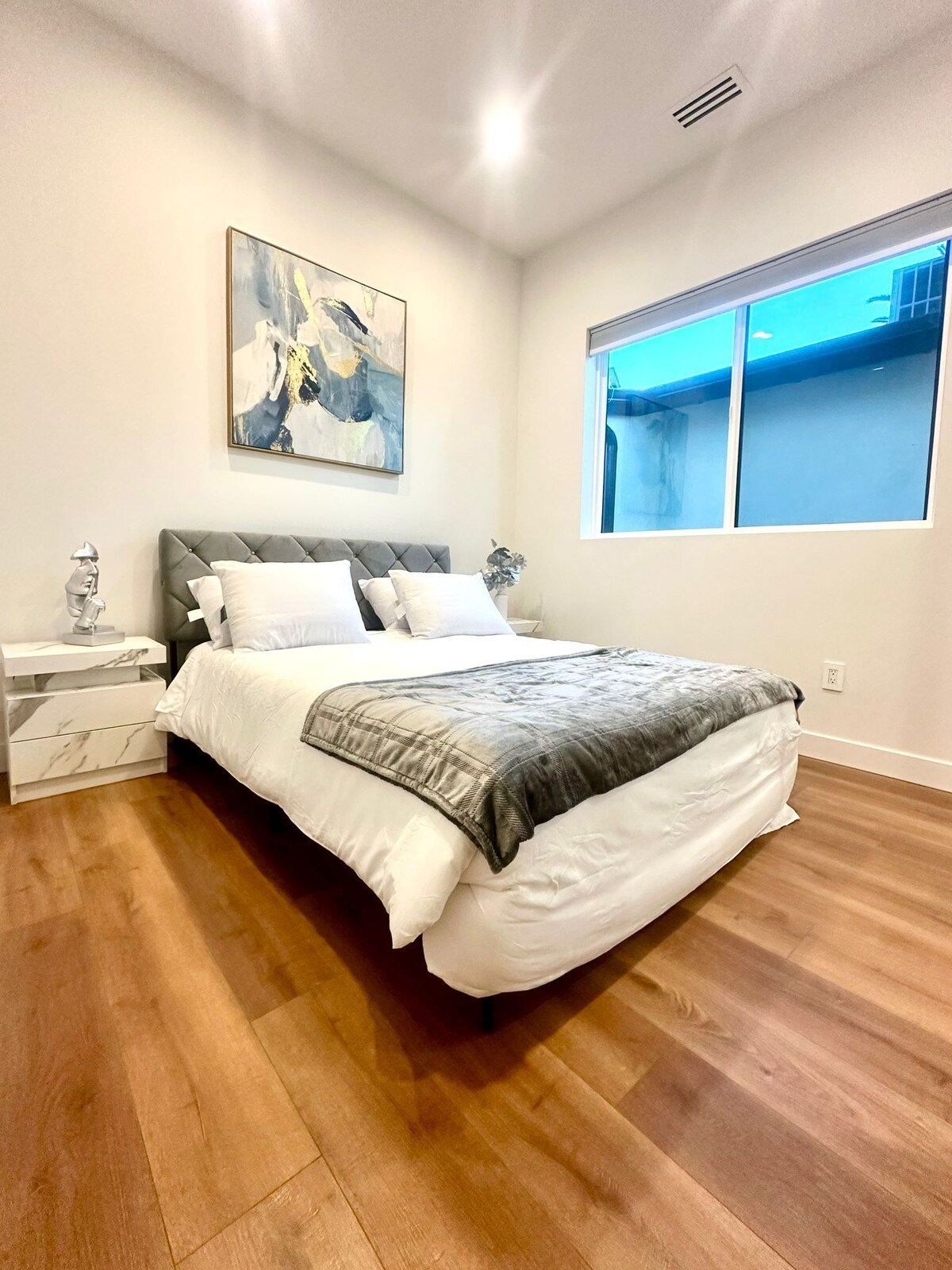 Step into this beautifully designed new guesthouse, featuring two spacious bedrooms and a modern bathroom. The stylish living room is highlighted by a sleek flat-screen TV and large windows that let in plenty of natural light. The kitchen, with its chic navy blue cabinetry and high-end stainless steel appliances, is a true standout. Both bedrooms are furnished with comfortable queen-sized beds, nightstands, and lamps, while ample storage throughout ensures your space stays organized. Outside, a charming patio with a round table and chairs invites you to relax and dine al fresco. This guesthouse offers exceptional value and combines comfort with contemporary design. Our prices include all fees. No hidden fees.