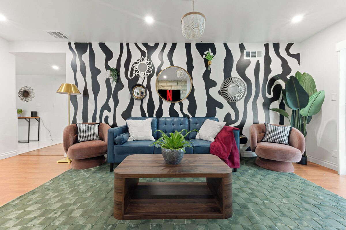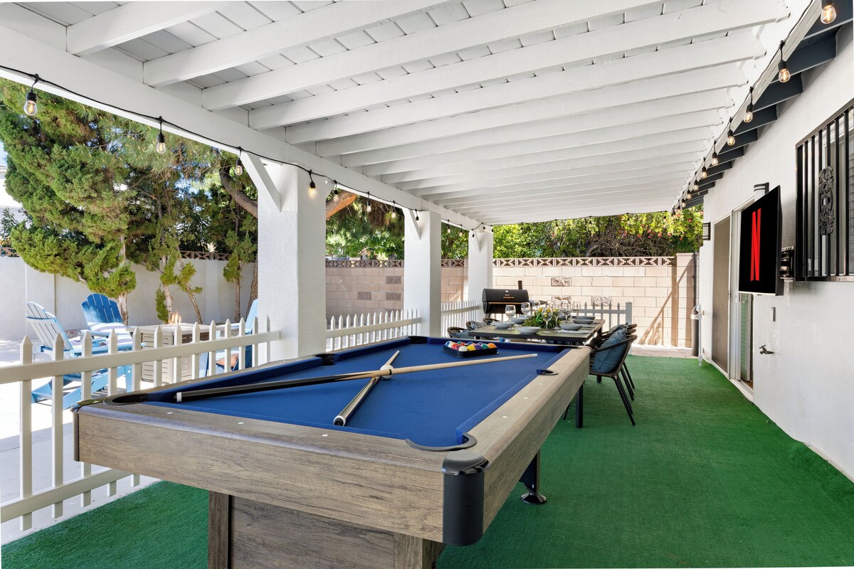 Experience comfort in this remodeled, stylish home designed with a boutique hotel feel. Professionally styled with unique, one-of-a-kind furniture, each bedroom boasts its own TV. Perfect for entertaining, enjoy a large jacuzzi, indoor and outdoor fireplaces, pool table, ping pong table, and ample parking for multiple cars.