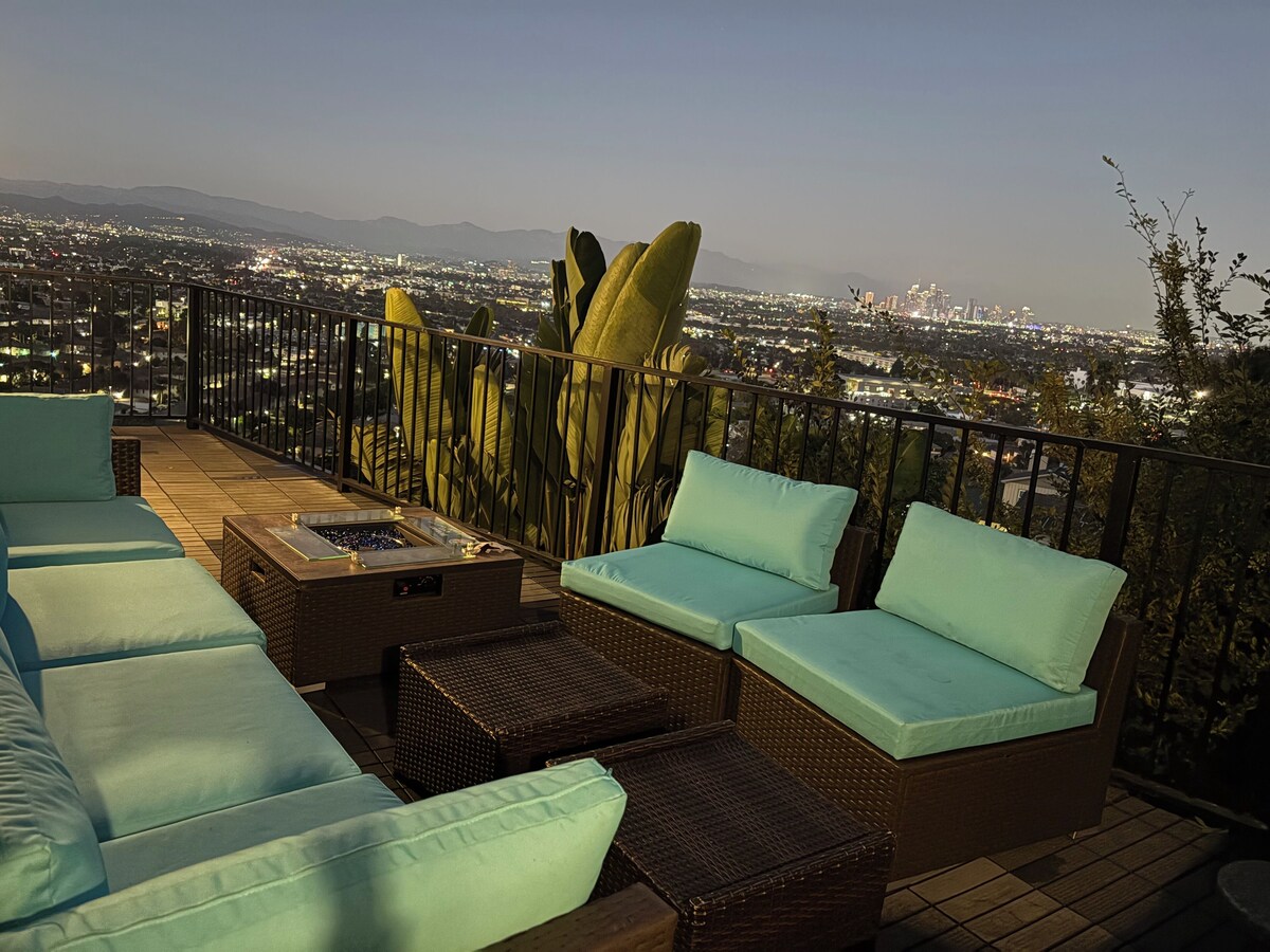Located in Los Angeles, this charming house boasts 4 bedrooms including 3 king beds, 2 twin beds, and 1 bunk bed. With 4 bathrooms featuring luxurious amenities like a bathtub, bidet, and jetted bathtub, guests will feel pampered during their stay. Set on a hillside, this home surrounds you in spectacular vistas of the Downtown LA skyline indoors and out. Wake up to the sound of the birds and the view of the Hollywood sign viewable in almost every room. Drink coffee in the view from showcase windows in both the kitchen and the bathrooms, where tubs overlooks the sweeping city below. Hang out in the upstairs deck or the downstairs patio to enjoy the sunsets and the sweeping views of the city.