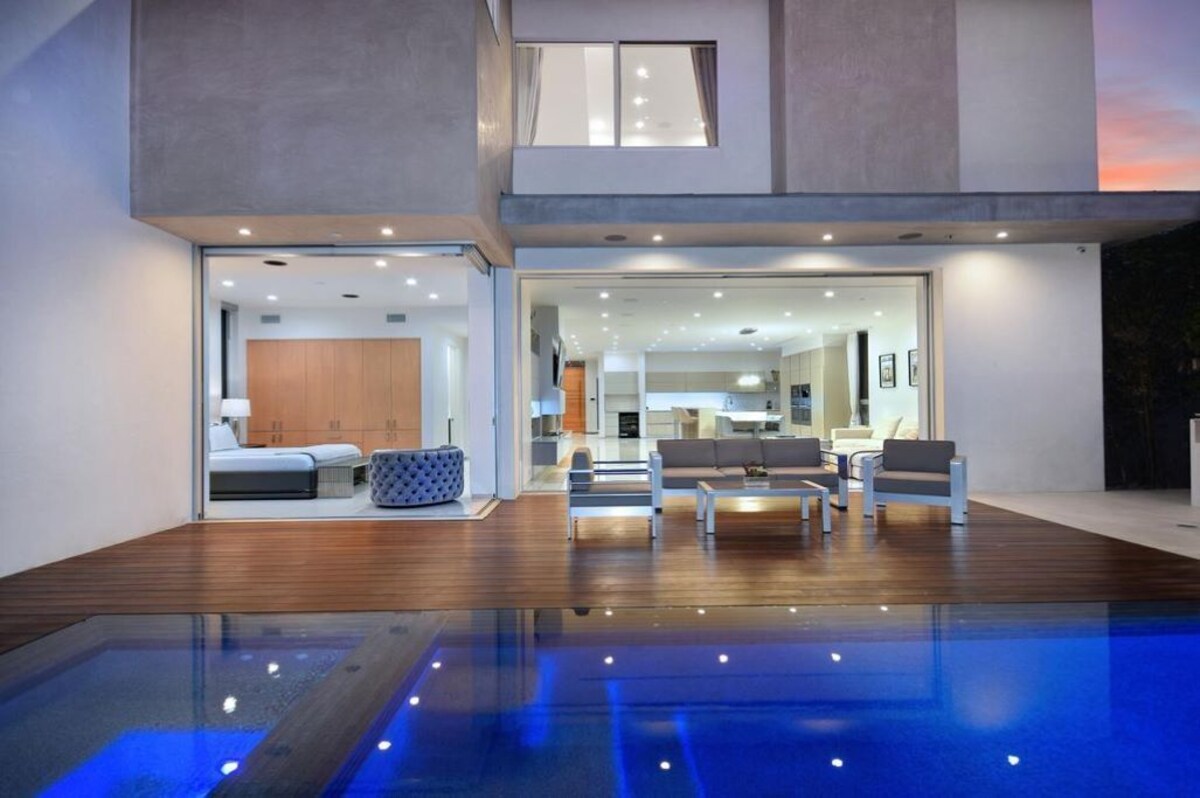 Step into grand entryway of white marble and modern open layout designated for entertaining, with walls of glass, vaulted ceilings, modern furnishings and dramatic pendant lights. The fully equipped chef’s kitchen feature large center island breakfast corner, wine cooler, Miele appliances and world famous Kangen alkaline Water. An open stairway leads up to an open balcony style hallway and two distinctively private master bedroom retreats with king beds, outdoor loggias and expansive walk in closets. Two additional en suite guest bedrooms provide ample sleeping to up to 8 guests. The rear of the home boast a sculptures resort like backyard with lounge seating, fire pit and built in LYNX grill featuring both traditional Gas and kabab style charcoal grills. Inspirational glass tiled pool and spa feature color changing lights and sit beneath a tranquil waterfalls. The whole family will experience and enjoy the Glamorous LA lifestyle at this property. DESIGNED TO HOST VIP FAMILIES AND GROUPS HIGH TECH SMART HOME KANGEN ALKALINE WATER SYSTEM HEATED POOL AND SPA FULLY EQUIPPED OUTDOOR KITCHEN HIGH CEILINGS QUIET, ELEGANT NEIGHBORHOOD STEPS AWAY FROM MELROSE, SUNSET STRIP, BEVERLY HILLS AND HOLLYWOOD STUDIOS SURROUNDED BY TALL TREES FOR PRIVACY 4 FREE PARKING SPACES - 2 CAR GARAGE and DRIVEWAY FULLY EQUIPPED LAUNDRY ROOM Our prices include all fees. No hidden fees.