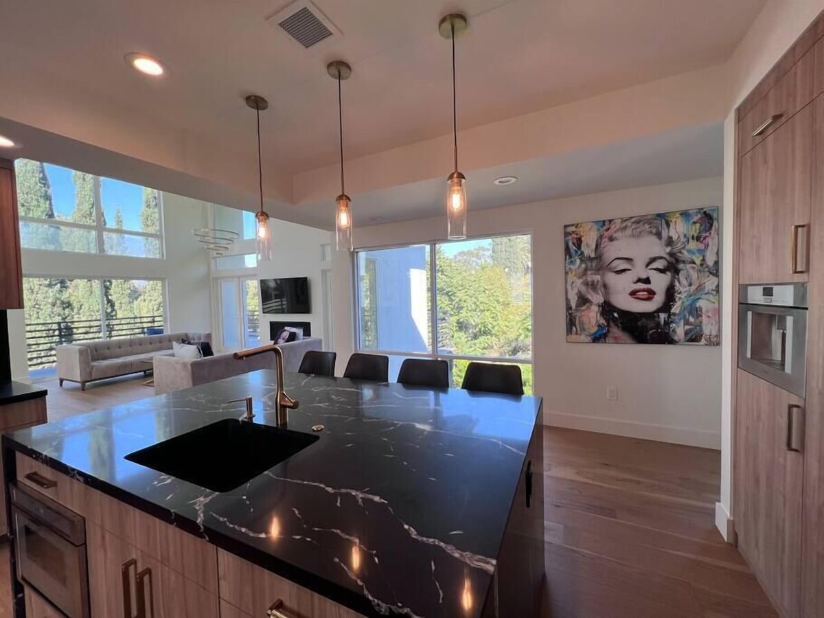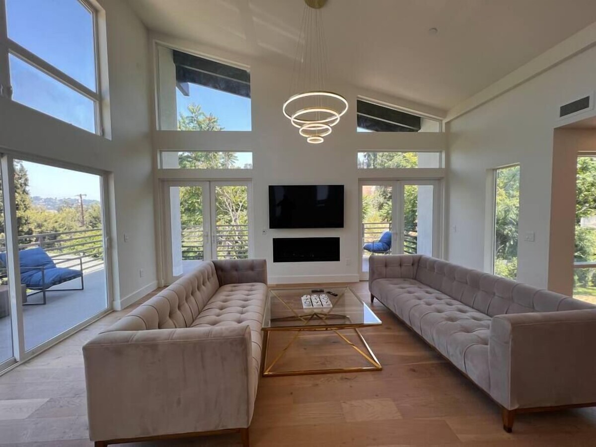 Gorgeous brand new 5 bedrooms 5 baths modern compound in Silverlake Hills with swimming pool and views! The main 2-story house features an inviting open floor plan with vaulted ceilings in the living room, a fully stocked kitchen with top of the line Thermador appliances, a large center island perfect for entertaining, high end finishes throughout, a huge wrap around terrace off the 2nd floor with views and a large grassy yard with gorgeous swimming pool, a BBQ grill and fire pit perfect for entertaining and relaxation. The separate Guest house is facing the pool area and has its own kitchen and full bath. All bedrooms & living areas are equipped with Smart flat screen TVs and Wi-Fi throughout. The Property is private & gated. Swimming pool can be heated at guests’ option for $125/day extra charge. Located within minutes to all the trendy Silver Lake restaurants, Dodgers Stadium, Griffith Park and a 10 minutes drive to Downtown LA. Our prices include all fees. No hidden fees.