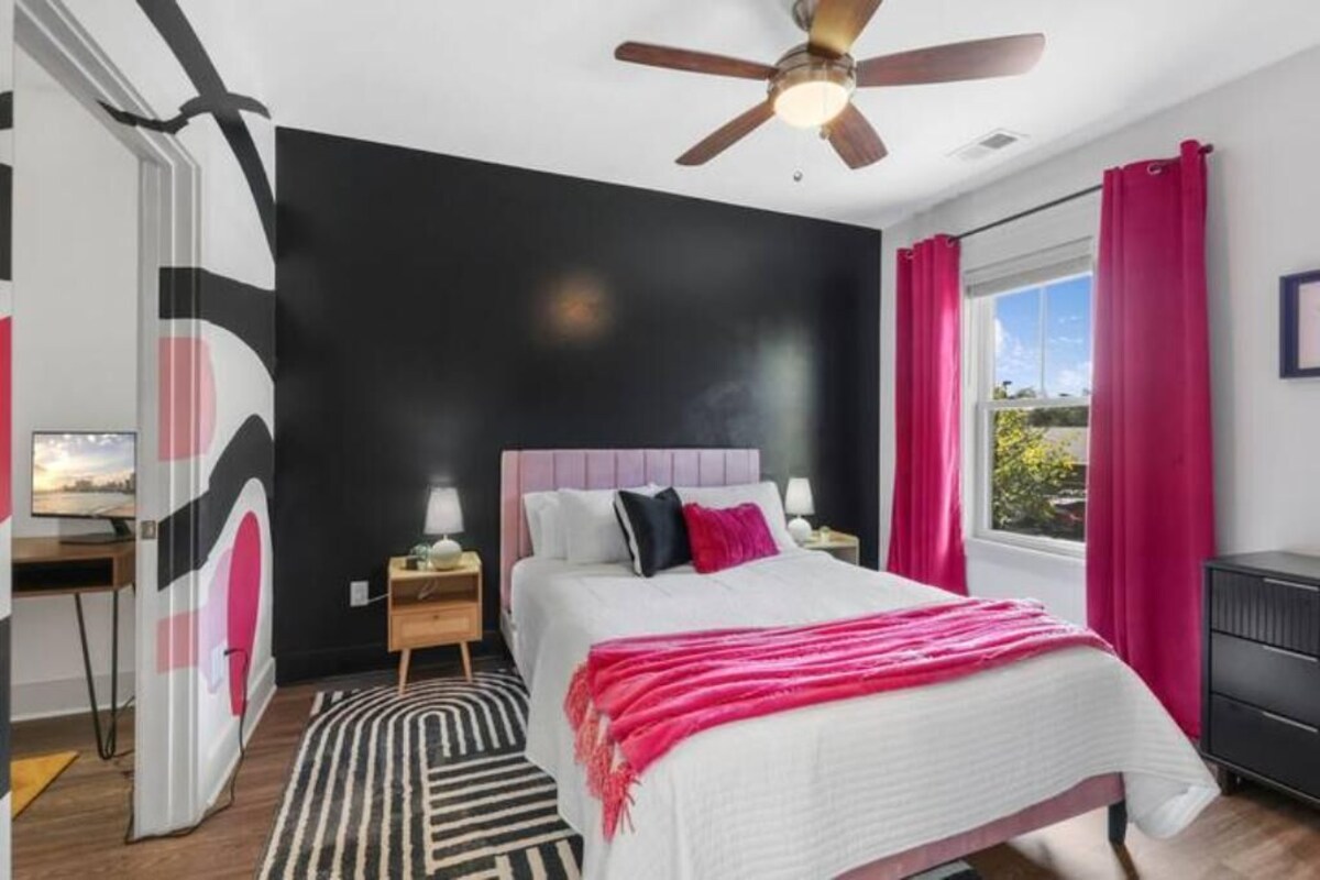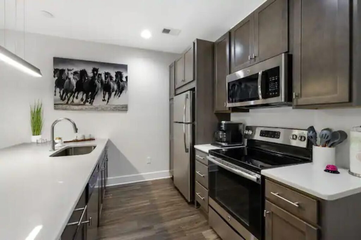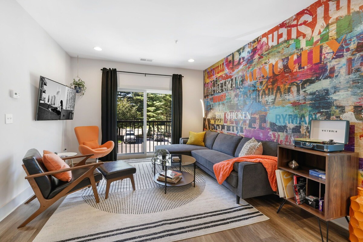 Time to let your horses run! Enjoy a stylish and fun experience at this centrally-located condo, close to Opryland and Broadway. Perfect base to explore all that Nashville has to offer, any time of the year. Settle in to your comfy but funky condo with plenty of room for everyone. Enjoy the custom painted murals in the bedrooms and the custom living room mural. Everything you need is here, including a well stocked kitchen, smart TV's, comfy beds and linens and blackout curtains so you can sleep. No worries, you can leave your car in the free parking lot when you take a quick Uber to downtown. This condo is the perfect home away from home! DISTANCES TO SOME LOCAL ATTRACTIONS. • Country Music Hall of Fame and Museum • Distance: 7.5 miles • Time: ~15 minutes • Description: Iconic museum showcasing country music history, artifacts, and exhibits. • Grand Ole Opry • Distance: 6.8 miles • Time: ~12 minutes • Description: Legendary venue for live country music performances and tours. • Ryman Auditorium • Distance: 7.3 miles • Time: ~14 minutes • Description: Historic music hall, original home of the Grand Ole Opry. • The Parthenon • Distance: 9.2 miles • Time: ~18 minutes • Description: Full-scale replica of Athens’ Parthenon with art gallery inside. • Shelby Bottoms Nature Center • Distance: 3.8 miles • Time: ~8 minutes • Description: Scenic park with trails, wildlife, and environmental education programs. • Tennessee State Capitol • Distance: 7.1 miles • Time: ~14 minutes • Description: Historic government building with guided tours and scenic views. • Bicentennial Capitol Mall State Park • Distance: 7.6 miles • Time: ~15 minutes • Description: Urban park with history exhibits, fountains, and green spaces. Distances and times are approximate, based on typical driving conditions from this condo, sourced from mapping services like Google Maps. Traffic may affect travel times. Our prices include all fees. No hidden fees.