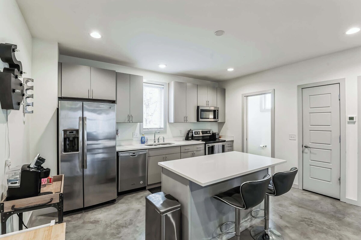 Summary: Whether you’re here for the music, the food, or the unforgettable atmosphere, Nashville offers an authentic taste of the one-of-a-kind Southern lifestyle that makes this city so special. With a stay at the trendy 3-bedroom of Haven on Cleo, you can explore a neighborhood where creativity thrives, flavors delight, and every street has a story to tell. With an industrial-chic style uniquely its own, your incredible Nashville adventure starts right here! The Space: Only 3 miles from the city center, you’re just a short drive or ride share away from all the restaurants, shopping, bars, and nightlife that make this city come alive, with musical concerts and historic exhibits in abundance. Whether you're catching a concert downtown, enjoying a night out on Broadway, or shopping to your heart’s content in the Gulch, everything you need is within easy reach. A dynamic culinary scene ranges from finger-lickin' barbecue joints that will work up your appetite at the mere scent of hickory smoke, to trendy farm-to-table bistros where Southern comfort meets innovation. The home’s bright and breezy interior features tall ceilings and a desirable open floorplan conducive for gathering with friends and family as you unwind between adventures in the city. The living room offers plush sofa seating and a smart TV for keeping up with all your favorite shows and movies. Step out the door and onto the balcony, the perfect spot for diving into a new read or enjoying a happy hour cocktail. Back indoors, natural light illuminates a stylish kitchen showcasing stainless steel appliances, smooth stone counters, and sleek cabinetry stocked with all the cookware and dining ware you need to whip up family style meals in the comfort of home. Gather around the chic bench-style dining table for all your meals or head up to the 3rd floor balcony to dine al fresco while soaking in the fresh air and surrounding city vistas. This home comfortably sleeps 8 guests between 3 private bedrooms and a queen size murphy bed in the living room. Bedroom #1 includes a queen size bed, smart TV, and ensuite bathroom with a pedestal sink and shower/tub combo. Bedroom #2 includes a king size bed, smart TV, and ensuite bathroom with a dual vanity and glass walk-in shower. Bedroom #3 includes a king size bed and smart TV. The home also includes a half bathroom as well as an additional full guest bathroom with a single vanity and shower/tub combo. THINGS TO NOTE: • Washer and dryer in home. • Garage parking available for 2 vehicles. Street parking also available on a first come, first served basis. • Pet friendly! Maximum 2 pets allowed. A flat Pet Fee of $150 will be required in addition to your final booking cost. To pay your Pet Fee, please contact the Customer Care Team after booking. To avoid fines, please pick up after your pet. This home is located just 3 miles from downtown Nashville, in a desirable location with major attractions within minutes of the property. If you’re in town to catch a game or concert, the Bridgestone Arena is a short drive away, plus the Bicentennial State Park, Germantown, and Capitol Building are all easily accessible. Jump in an Uber/Lyft to enjoy Nashville’s unparalleled music scene and nightlife. From Music Row to historic landmarks and amazing southern food, all the best of Nashville is at your fingertips! Our prices include all fees. No hidden fees.