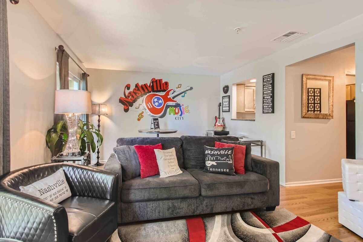 Music & Entertainment: * The Grand Ole Opry is celebrating its 100th anniversary all year with special events and performances * Walking distance to the legendary Ryman Auditorium and historic Tootsie's Orchid Lounge * Easy access to The Bluebird Cafe and The Listening Room where songwriters perform original live music * Close to the Johnny Cash Museum and other musical museums downtown Sports & Events: * Short walk to Nissan Stadium (Tennessee Titans) and Bridgestone Arena (Nashville Predators) * Geodis Park features FIFA World Cup matches and has the largest soccer-specific stadium in the U.S. and Canada * Easy access to the Nashville Sounds baseball stadium with its iconic guitar-shaped scoreboard Dining & Culture: * Experience authentic Nashville hot chicken at famous spots like Prince's Hot Chicken and Hattie B's * Explore the trendy 12South neighborhood and its boutique shops * Visit Fifth + Broadway and the Food Assembly Hall for shopping and dining * Goo Goo Clusters factory tours where you can make your own chocolate creation Nearby Neighborhoods: * Germantown area featuring excellent restaurants and entertainment * Nashville Farmers Market offering fresh produce, flowers, and local goods * Historic Printer's Alley for nightlife and entertainment * Beautiful Cumberland River views * Fully equipped kitchen and living space * Daily bike rental options available * Easy access to Old Town Trolley tours and General Jackson Showboat river cruises Historic & Cultural Landmarks: * Walk to the iconic Country Music Hall of Fame and Museum * John Seigenthaler Pedestrian Bridge offers spectacular downtown Nashville skyline views - one of the longest pedestrian bridges in the world at 3,150 feet * Easy access to the Parthenon and Bicentennial Capitol Mall * Explore historic Printer's Alley for nightlife and entertainment Trendy Neighborhoods & Shopping: * The Gulch - Nashville's upscale district with boutique hotels, cool shops, craft breweries, and diverse restaurants * Famous angel wings mural and colorful street art perfect for photos * Broadway Historic District and Music Row within walking distance Museums & Unique Attractions: * Madame Tussauds Nashville - interact with lifelike wax figures of music celebrities * Adventure Science Center with state-of-the-art 63-foot dome theater * Riverfront Park for outdoor recreation along the Cumberland River Entertainment & Sports: * Walking distance to Germantown's dining and entertainment scene * Tennessee State Capitol tours * Easy access to Nissan Stadium (Tennessee Titans) * Nashville Sounds baseball stadium with guitar-shaped scoreboard * TopGolf for interactive entertainment Our prices include all fees. No hidden fees.