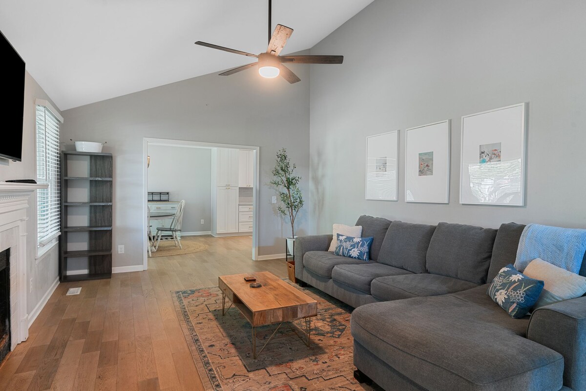 Welcome to Blackwood Haven — a bright and inviting Nashville retreat designed for comfort and productivity. This 2-bedroom, 2-bath home features a dedicated office with French doors, perfect for remote work. The open-concept living area offers vaulted ceilings, a cozy fireplace, and natural light throughout. Enjoy a fully renovated kitchen with modern cabinetry, brass fixtures, and ample storage. Each bedroom is thoughtfully furnished with quality linens and blackout shades for restful nights. Step outside to the private backyard space, ideal for morning coffee or evening unwinds. Located in a quiet residential area just minutes from downtown Nashville, the airport, and Donelson's growing restaurant scene, this home offers convenience and calm — ideal for corporate guests, relocations, and extended stays. Our prices include all fees. No hidden fees.