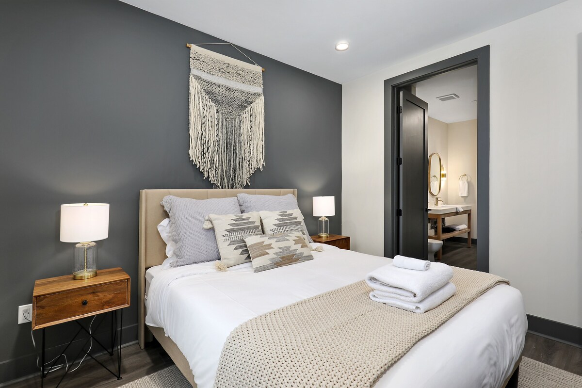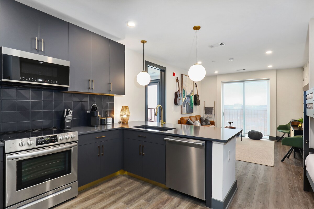 Muse 505 Our calendar is updated in real-time & our nightly rates are accurately displayed. Simply enter your desired dates and click 'Book Now!' This sleek and stylish Nashville condo will make the perfect home base for vacationers wanting to explore all the city has to offer. After a full day out and about, come home to a comfortable leather sofa and TV. Take advantage of the full kitchen, as it’s well-equipped for cooking up a meal at home or reheating leftovers from one of the many delicious local restaurants you’re sure to try during your stay. Enjoy your balcony views from the living area or primary bedroom. A bunk bed in the entryway offers an additional sleeping option. Additional amenities include central air-conditioning, a dishwasher and complimentary board games. MUSE AMENITIES -Rooftop lounge -Fitness center -Cornhole court -Elevator in the building THINGS TO KNOW Streaming is available using your own accounts. This property is managed by Vacasa Tennessee LLC. A shared laundry room is available on-site. The Drip Bar, located next door, is now an official Bounce luggage drop location for guest convenience. If you are bringing a dog on your trip, the pet fee is already included in your quote when selecting ‘Yes’ to pets. If you would like to add more dogs, please contact us. Parking notes: No parking available. This rental is located on floor 5. Please note: this home resides in a noise-sensitive area and the owners participate in our Good Neighbor protection program. Our smart home technology will alert our team if excessive decibel or occupancy levels are detected, allowing us to reach out directly with a reminder of maximum occupancy and quiet hours. This technology is privacy compliant, and only monitors the presence of decibels and devices-not any personal conversation or information. Thank you for supporting our efforts to be good neighbors! Damage waiver: The total cost of your reservation for this Property includes a nightly damage waiver fee, plus tax if applicable (the “Damage Waiver”). (A discount may be applied for stays of 28 nights or longer, if permitted.) The Damage Waiver covers you for up to $3,000 of accidental damage to the Property or its contents (such as furniture, fixtures, and appliances) as long as you report the incident to the host prior to checking out. The Damage Waiver fee eliminates the need for a traditional security deposit. More information can be downloaded from the \ on the checkout page. Due to local laws or HOA requirements, guests must be at least 21 years of age to book. Guests under 21 must be accompanied by a parent or legal guardian for the duration of the reservation. Our prices include all fees. No hidden fees.