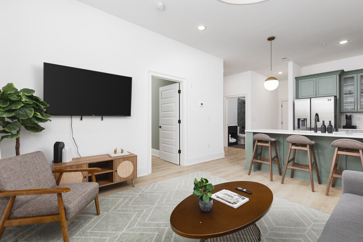 Enjoy a stylish experience at this spacious and conveniently-located condo with 4 Beds, 2 Bedrooms & 2 Full Baths! Located in a new, professionally designed condo building in hip & trendy East Nashville. Walk to local coffee, restaurants & a brewery. Only 10 minutes to Downtown Broadway bars and 13 min to the Grand Ole Opry! Hair salon in the building if you need a quick cut! Fully equipped kitchen, Smart TVs in both bedrooms + living room. Condo is on the 1st floor with no stairs. HIGHLIGHTS: ★ If you are coming with a group and need more than 1 condo, let us know! We own all the condos in this building ★ Sleeps 7 people ★ 4 Beds - 1 King, 1 Queen, 1 Full Sofa Bed, and 1 Twin rollaway bed ★ 2 Bedrooms ★ 2 Full-size spacious bathrooms - one connected to a bedroom & one in the hallway ★ Smart TVs in the living room and bedroom #1 ★ Seating for 4 at the kitchen island ★ Fully-equipped kitchen with high-end appliances for all your cooking needs ★ FREE parking ★ Walk to restaurants, coffee, a local brewery & more ★ Full length mirrors in both bedrooms ★ Only 10 min drive to Downtown Broadway Bars ★ Only 13 min drive to the Grand Ole Opry ★ In-unit washer/dryer (free to use) ★ High-speed internet ★ Plenty of storage space for your clothes ★ Hair dryers, shampoo, conditioner and body wash provided ★ Adjustable thermostat ★ Hassle-free check-in with no keys, just codes ★ Keurig Coffee Maker & K-Cups ★ Located on the 1st floor - no stairs to climb ★ Walking distance to All People Coffee, Southern Grist Brewery, Redheaded Stranger, Folk, Audrey, & more! ★ Two Grocery stores nearby - Publix and Kroger BEDS: Bedroom 1: 1 King Bedroom 2: 1 Queen Living Room: Full-Size Sleeper Sofa and 1 Twin size Rollaway Bed with a memory foam mattress BATHROOMS: Bathroom 1: Full size with stand up shower connected to bedroom #1 Bathroom 2: Full size with shower/tub combo in a hallway next to bedroom #2 After a fun day out exploring Nashville, come back to relax in this spacious and inviting condo. The space provides the perfect mix of style + comfort. All aspects of the home have been thoughtfully designed with ease + convenience in mind. Our neighborhood is very safe and charming with many beloved spots in this flourishing local area of East Nashville. The airport is only about 15 minutes away. There are plenty of Ubers, Lyft and taxis available if you choose not to bring a car. Our condo is in a great location to enjoy all the things that Nashville has to offer! Nearby Spots (alphabetical order): ★ All People Coffee ★ Attaboy ★ Bartaco ★ Basement East (music venue) ★ Board & Brush Creative Studio ★ Dino’s Bar ★ Edley’s BBQ ★ Emmy Squared ★ Flora + Fauna (coffee and brunch) ★ Five Points Pizza ★ Folk ★ Golden Pony cocktail bar ★ Hola Yoga ★ Kisser (Japanese) ★ Lil Cee’s Soul Food ★ Once Upon a Time in France ★ Pelican & Pig ★ Pearl Diver ★ Pharmacy Burger Parlor & Beer Garden ★ Redheaded Stranger ★ Shed Group Fitness East Nashville ★ Starbucks ★ Southern Grist Brewing Company - East ★ The Underdog ★ The Urban Juicer ★ Tower Market & Deli ★ Wilburn Street Tavern ★ Xiao Bao You will have the entire condo to yourself! Please reach out through this booking platform with any questions. Please note that all cancellations within the cancellation timeline will be charged a 7% processing fee if cancelled. **Please note that a required $300 damage deposit hold will be placed on your card prior to check in. Only the number of guests listed with the reservation are allowed at the property at ALL times. This is monitored with outside cameras. Please do not request an early check in time through the app. Early check in times selected through the app are not applicable, even if the booking is \ . If you would like early check in, you must message us. Standard check in time is anytime after 4pm. ALL Pets must be approved in advance of booking. We have a $75 pet fee and do not allow animals to go on the furniture or beds. Please be respectful of the decor and the space itself. We've put a lot of time and energy into making and keeping this home beautiful, if you ruin something or break our house rules we will keep your security deposit. No loud noise at nighttime. This is a residential building, please respect the neighbors! NO Smoking of any kind NO Parties Once you've booked with us, we ask that you keep all communication within the platform. That's the best way to keep in touch and keep all the details in one place. Thank you! We look forward to hosting you! Our prices include all fees. No hidden fees.