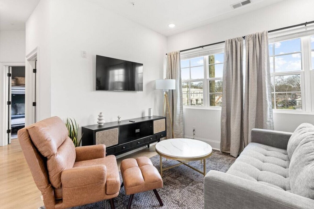 Welcome to our inviting & conveniently-located condo with 5 Beds, 2 Bedrooms & 2 Full Baths! Located in a new, professionally designed condo building in hip & trendy East Nashville. Walkable to local coffee, restaurants & a brewery. FREE Parking, washer/dryer + elevator. Only 10 minutes to Downtown Broadway bars and 13 min to the Grand Ole Opry! Hair salon in the building if you need a quick cut! Fully equipped kitchen, Smart TVs, blackout shades & everything else you need for wonderful stay. HIGHLIGHTS: ★ If you are coming with a group and need more than 1 condo, let us know! We own all the condos in this building ★ Sleeps 9 people ★ 5 Beds - 1 King, Queen-over-Queen Bunk Beds, 1 Queen Sleeper Sofa, and 1 Twin Rollaway Bed ★ 2 Bedrooms ★ 2 spacious Full-size bathrooms - one connected to bedroom #1 & one in the hallway next to bedroom #2 ★ Room-darkening curtains in the living room & both bedrooms ★ Elevator in the building ★ Smart TVs in the living room and primary bedroom with all the streaming apps ★ Fully-equipped kitchen with high-end appliances for all your cooking needs ★ FREE parking ★ Iron & ironing board ★ Walk to restaurants, coffee, a local brewery & more ★ Only 10 min drive to Downtown Broadway Bars ★ Only 13 min drive to the Grand Ole Opry ★ In-unit washer/dryer (free to use) ★ High-speed internet ★ Plenty of storage space for your clothes ★ Folding luggage racks ★ Hair dryers, shampoo, conditioner and body wash provided ★ Adjustable thermostat ★ Hassle-free check-in with no keys, just codes ★ Keurig Coffee Maker & K-Cups ★ Walking distance to All People Coffee, Southern Grist Brewery, Redheaded Stranger, Folk, Audrey, & more! ★ Two Grocery stores nearby - Publix and Kroger BEDS: Bedroom 1: King Bedroom 2: Queen-over-Queen Bunk Beds Living Room: Queen Sleeper Sofa + Twin Rollaway Bed BATHROOMS: Bathroom 1: Full-size bathroom with stand up shower connected to bedroom #1 Bathroom 2: Full-size bathroom with tub/shower combo in the hallway next to bedroom #2 After a fun day out exploring Nashville, come back to relax in this upscale, spacious condo. Our bedrooms were designed with your comfort in mind, featuring comfortable beds, soft linens, ample storage space for your belongings, and room-darkening curtains. Our neighborhood is very safe and charming with many beloved spots in this flourishing local area of East Nashville. The airport is only about 15 minutes away. There are plenty of Ubers, Lyft and taxis available if you choose not to bring a car. This condo is in a great location to enjoy all the things that Nashville has to offer! Nearby Spots (alphabetical order): ★ All People Coffee ★ Attaboy ★ Bartaco ★ Basement East (music venue) ★ Board & Brush Creative Studio ★ Dino’s Bar ★ Edley’s BBQ ★ Emmy Squared ★ Flora + Fauna (coffee and brunch) ★ Five Points Pizza ★ Folk ★ Golden Pony cocktail bar ★ Hola Yoga ★ Kisser (Japanese) ★ Lil Cee’s Soul Food ★ Once Upon a Time in France ★ Pelican & Pig ★ Pearl Diver ★ Pharmacy Burger Parlor & Beer Garden ★ Redheaded Stranger ★ Shed Group Fitness East Nashville ★ Starbucks ★ Southern Grist Brewing Company - East ★ The Underdog ★ The Urban Juicer ★ Tower Market & Deli ★ Wilburn Street Tavern ★ Xiao Bao You will have the entire condo to yourself! Please reach out through this booking platform with any questions. Please note that all cancellations within the cancellation timeline will be charged a 7% processing fee if cancelled. Only the number of guests listed with the reservation are allowed at the property at ALL times. Please do not request an early check in time through the app. Early check in times selected through the app are not applicable, even if the booking is \ . If you would like early check in, you must message us. Standard check in time is anytime after 4pm. ALL Pets must be approved in advance of booking. We have a $75 pet fee and do not allow animals to go on the furniture or beds. Please be respectful of the decor and the space itself. We've put a lot of time and energy into making and keeping this home beautiful, if you ruin something or break our house rules we will keep your security deposit. No loud noise at nighttime. This is a residential building, please respect the neighbors! NO Smoking of any kind NO Parties Once you've booked with us, we ask that you keep all communication within the platform. That's the best way to keep in touch and keep all the details in one place. Thank you! We look forward to hosting you! Our prices include all fees. No hidden fees.