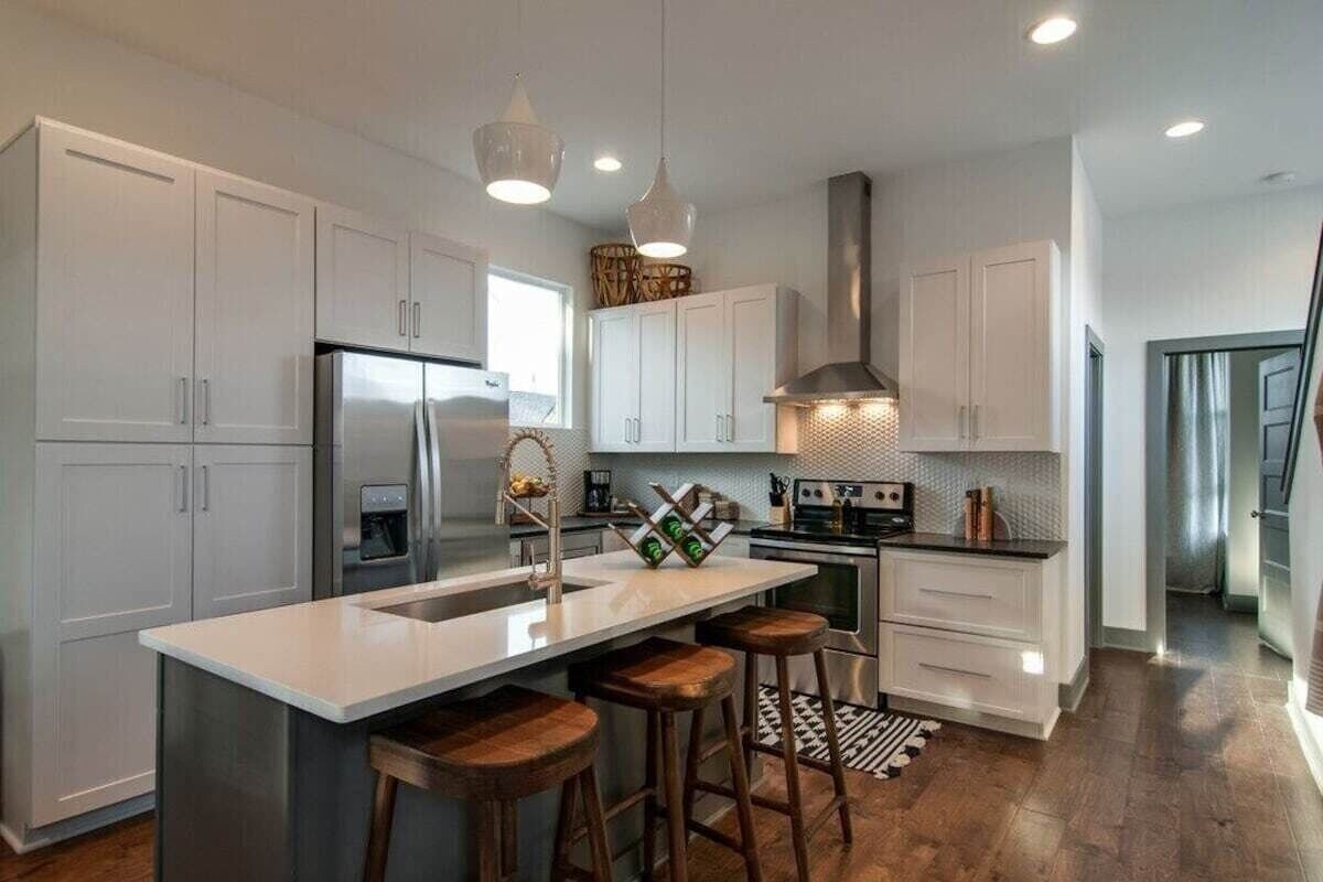Urban Luxury Retreat: Experience upscale urban living in a stunning 3-bed, 2.5-bath residence that sleeps 8! Bedroom Choices: Choose from *King *Queen *Bunk bedroom, all designed for comfort and relaxation. Spectacular Views: Enjoy captivating downtown views from the 2nd-floor balcony, immersing you in the city's energy. Elegant Design: Discover sleek elegance with hanging glass fixtures, hardwood floors, and stainless steel appliances. Prime Location: Just 2 miles from Broadway, the house offers easy access to Downtown, Germantown, and more. Vibrant Neighborhood: Explore galleries, bars, and restaurants in the walkable area, adding to the community's allure. Nearby Excursions: Conveniently visit the Farmer's Market, Germantown, and other hotspots like the Gulch and Midtown. Upscale Lifestyle: Embrace city life while enjoying the comfort of a sophisticated, modern Nashville retreat. Our prices include all fees. No hidden fees.