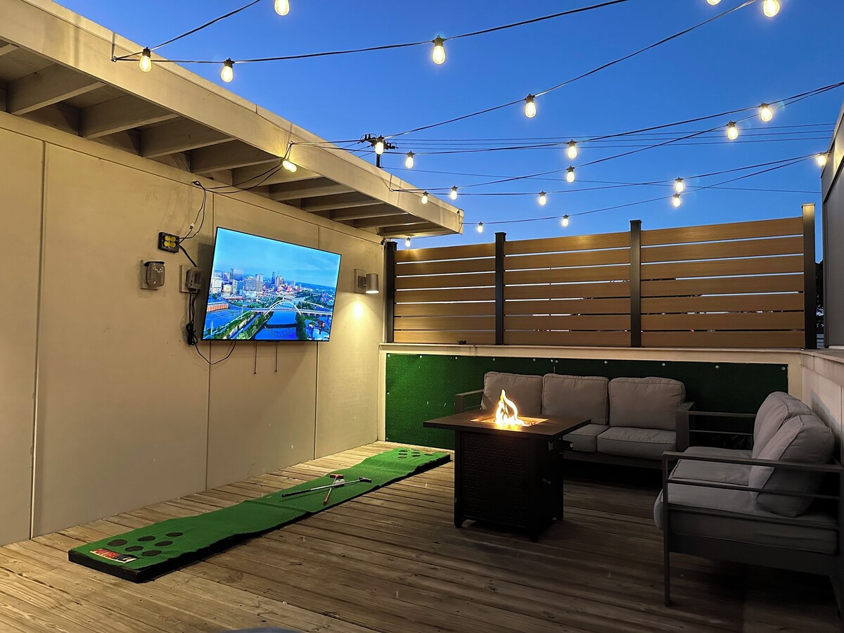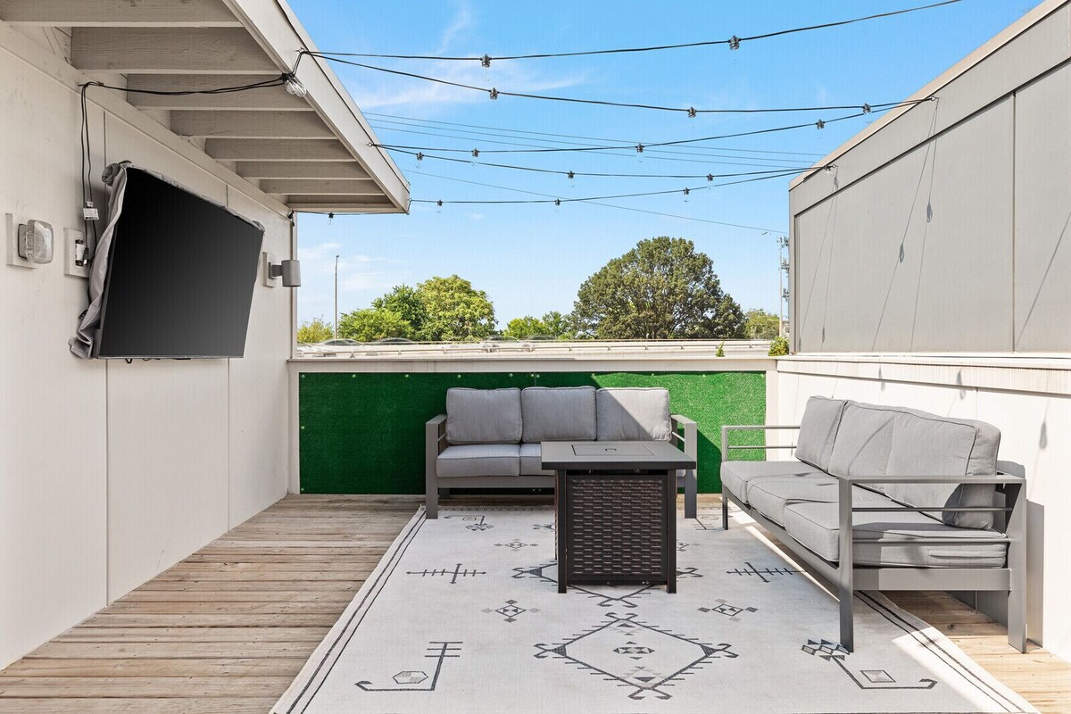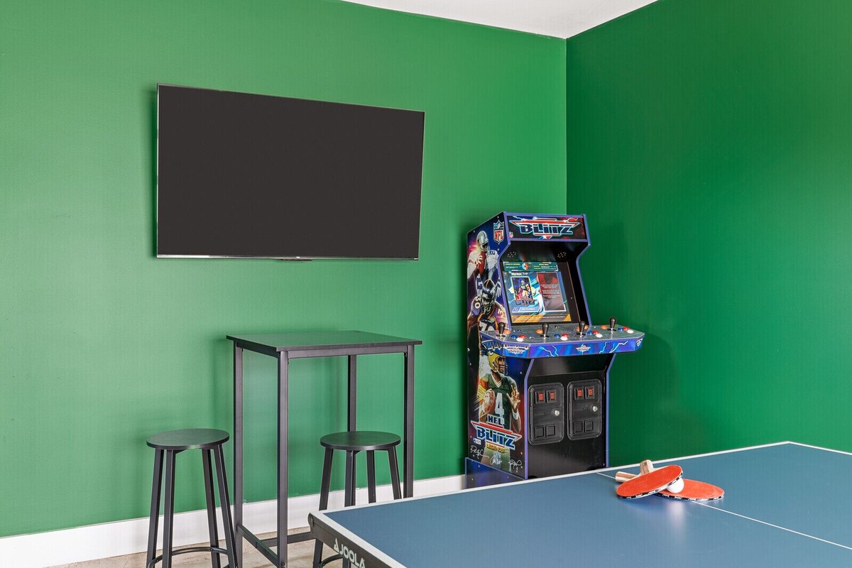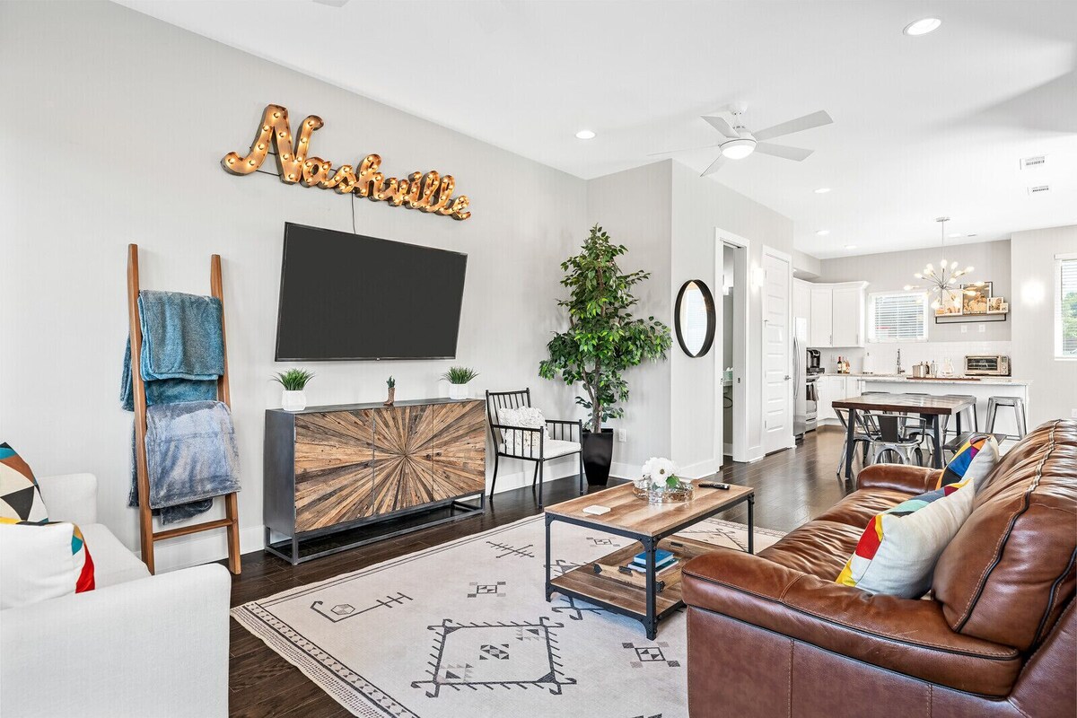 Beautiful and stylish townhouse with tons of natural light. Thoughtfully designed by a hospitality expert to make your group's stay in Nashville an unforgettable experience. *Downtown - Less than 10 mins *Nissan Stadium – 10 mins *Bridgestone Arena – 10 mins *GEODIS Park (Nashville FC Soccer Stadium) - 12 mins *Airport – 16 mins *Publix, Kroger, or Walgreens - 5 mins *Nashville Farmers Market - 5 mins *Top Golf - 7 mins THE SPACE - ROOFTOP with a TV and a fire pit. - 2 other balconies, one with a grill. - GAME ROOM with a ping pong table, darts, NFL Blitz arcade game, ring toss and more. - 5 queen beds, 2 twin beds, and a full size pullout sofa. - 1st floor bedroom: Queen bed, walk-in closet, and private bath. - 2nd floor: An open concept living area with a fully appointed kitchen. Create craft cocktails with our high end bar tools, while sampling our record collection. The dining room offers plenty of space for family/friends dinner. After a night out, unwind with a plush blanket while watching a show under the Nashville lights. - 3rd floor: The primary sleeping space. One bedroom offers queen bunk beds, twin bunk beds, the primary bath, a large walk-in closet, and a dedicated water closet. The 2nd bedroom offers 2 queen beds and a private bathroom. Our prices include all fees. No hidden fees.