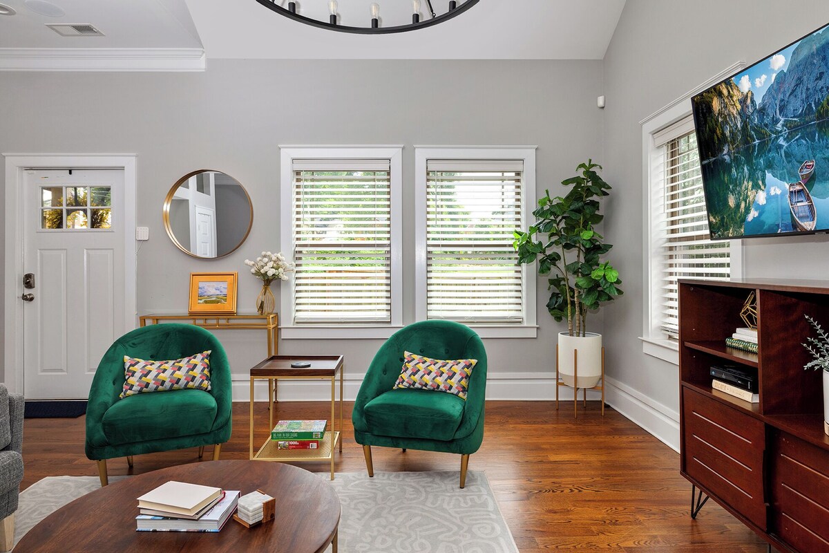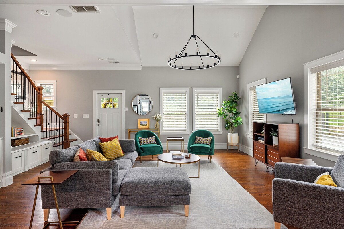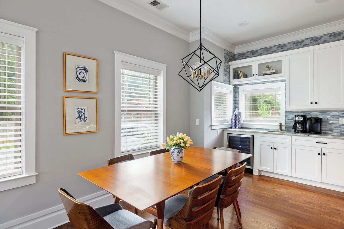 Located in Wesley Heights, a neighborhood next to Uptown Charlotte, our home is in a perfect location to get to everything Uptown has to offer (walkable!), a <10 minute drive to NoDa, Plaza Midwood, South End and Dilworth, and a 1 minute drive to hop on I-77 to get to the suburbs. It's a unicorn property because of it's proximity to Uptown CLT, the ability to host 9 people with a great outdoor space. The house is 5 minutes from a Greenway that has a miles long trail. Bank of America Stadium is 1 mile (~20 minute walk) from the house by way of the beautiful Greenway. Each bedroom is very spacious, and the two large full bathrooms for the 4 bedrooms upstairs make it a great spot for large groups. You'll have extra blankets and pillows to make sure you're comfortable during your stay. The primary bedroom is on the first floor with a private bathroom with a huge shower and spacious closet. There are two rooms with queen beds and one room with a twin on the second floor, and a room with a double bed on the third floor. There's plenty of space between the rooms to give you some privacy. The gorgeous kitchen is well appointed and a great space to cook for a group. The kitchen table can seat 6 and there is a leaf that can be inserted to add two more seats. The island can seat 4. The deck is in the back of the home and has a 4-person table, 4 adirondack chairs and a bench for your group to hang out. Turn on the overhead twinkle lights, fire up the grill for dinner and then enjoy a fire to make s'mores with the Solo Stove. As your hosts, we are very responsive and ready to make sure your stay is perfect. Sarah is a former Superhost of other properties in CLT, including this home a couple years ago, so feel confident that we'll take great care of you! Our prices include all fees. No hidden fees.