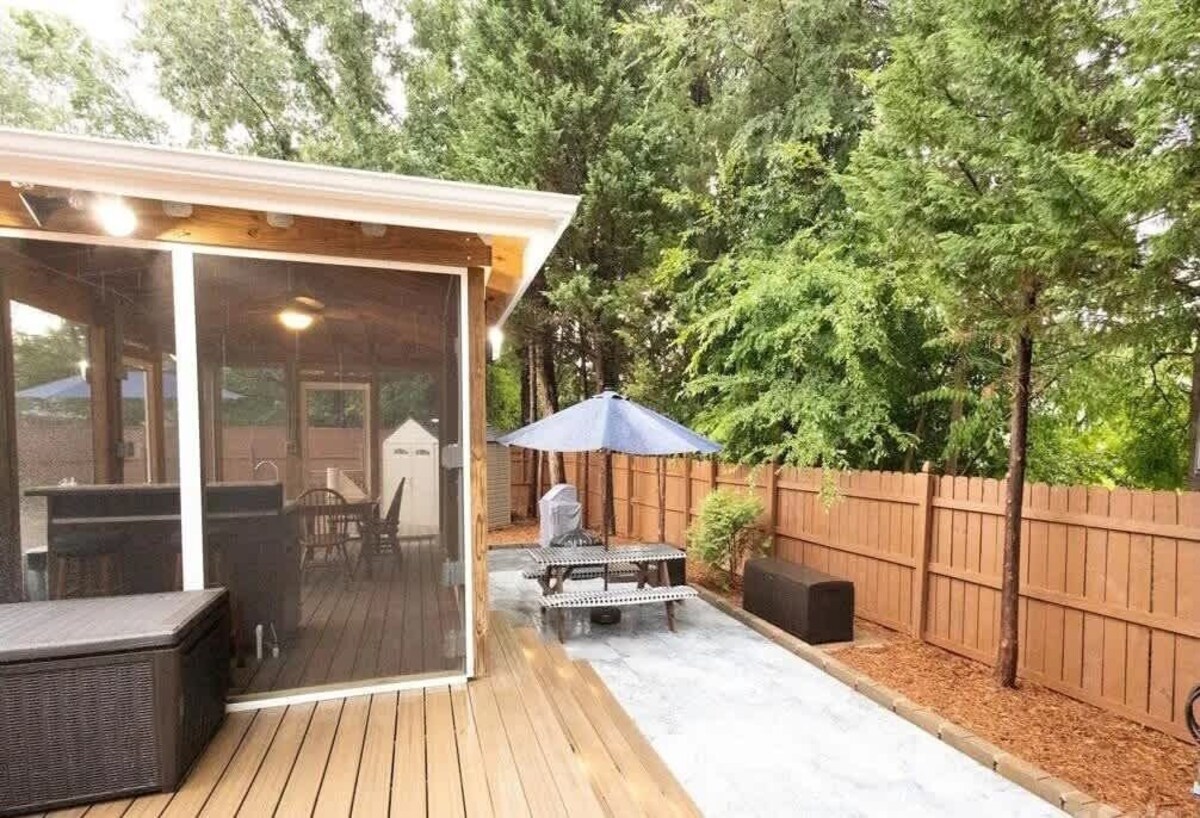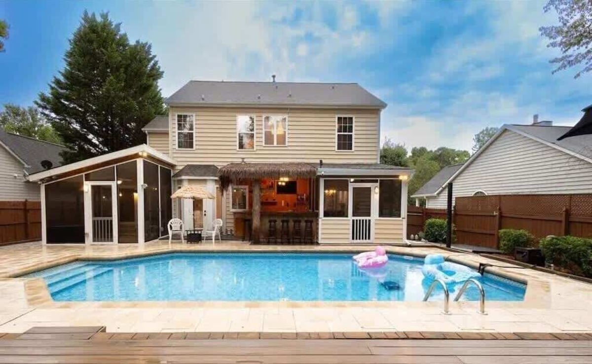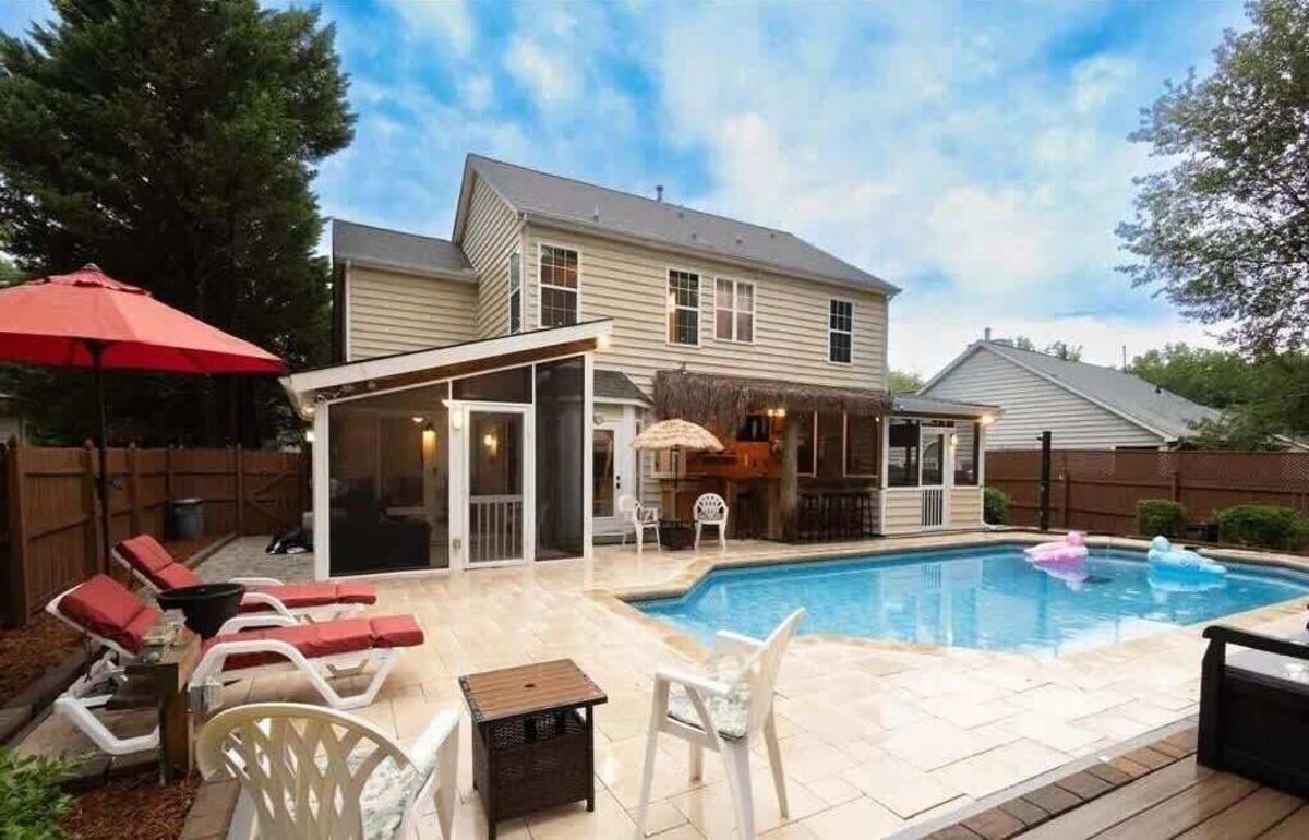 Summary: Come stay at Charlotte's ultimate staycay home featuring 4 separate outdoor areas surrounding an amazing pool. Also literally around the pool are a tiki bar, outdoor kitchenette, grill, & fire pit. The location is perfect as it’s just minutes to the Charlotte Motor Speedway, PNC Amphitheater, Concord Mills Mall, University City area and less than 20 minutes to uptown Charlotte. Conveniently located right off I-85 and 485. Enjoy 2 living rooms, 6 dining areas, 4 themed bedrooms, & a game room. The Space: Houses like this are super rare to come by. This home was carefully curated for guests to enjoy during all seasons of the year. Outdoor area: The backyard features an outdoor pool surrounded by a tiki hut (with refrigerator & bar), a screened kitchenette (sink, stove & dining table), grill, fire pit, shower, and plenty of seating. Attached to the back of home are 2 screened-in rooms; 1 of those rooms includes a dining table for 6, TV and mini fridge. There are 2 outdoor TVs to watch your favorite game. The various and plentiful seating includes a dining table for 6 inside the screened kitchenette, a tiki bar, a picnic table with umbrella, lounge chairs, Adirondack chairs and more. There are also a lit deck an outdoor shower. The backyard is fenced in for additional privacy. Let’s not forget the front yard too; there is a basketball goal on the driveway. And if you want to extend the fun, just open the garage door to offer ping pong and foosball! Inside is just as amazing as the outside. You won’t miss any of your favorite sports, as there are 5 TVs on the main floor and 4 TVs upstairs. Main level features: Living Rooms: There are two living rooms on the main floor. The first living rooms is off the main dining room and features a large screen smart TV with DVD player. The second living room features is own private area with large smart TV and access to the sun room. Kitchen: The kitchen is fully stocked with everything you need to make a culinary masterpiece and to entertain your friends and family. There is plenty of countertop space, as well as a spacious pantry closet. There is a large screen smart TV in the kitchen, and even the refrigerator features a TV that is connected to the internet. Dining Room: The dining room is off the kitchen and features an elegant glass table for 6 and features a smart TV. Need even more space? The dining room connects with an outdoor screened-in dining area via a sliding glass door. There is also additional dining options via the breakfast nook in the kitchen area. If that’s not enough and you really want to spread out, sit on the barstools at the tiki bar or at the picnic table or at the table inside the screened kitchenette. Overall, you have 6 dining options! Downstairs bathroom: There is a half bath between the kitchen and entrance. Garage: The garage features a ping pong table, foosball table, chairs, and full size fridge. The ping pong and foosball tables may be moved over to accommodate parking for 1 car. Upstairs: Bedrooms: There are 4 themed bedrooms upstairs. The master bedroom features the North Carolina mountains. The bunk room features Charlotte. The blue room features North Carolina. And the purple room features the many coastal attractions in North Carolina. The master bedroom includes: a queen bed, vaulted ceiling with fan, walk-in closet, en-suite bathroom, multiple lighting options and a smart TV. Its bathroom includes: a dual vanity, shower and a garden tub. Its walk-in closet includes a mini crib, iron and board. The bunk room includes: 2 sets of twin-size bunk beds, smart TV, loveseat, 3 work stations, play nook, reading nook, full length mirror and closet. The 3rd room, the blue room, includes: a full bed, smart TV, work station and closet. The 4th room, the purple room, includes: a full bed, closet and full length mirror. All the bedrooms, except the bunk room, have lamps with USB ports. Bathrooms: There is a full bath with a shower/tub combination in the upstairs hallway. The second full bath is off the master bedroom that features dual vanity sink, soaking tub and shower. Play Nook: This tiny space is shared with the work stations, in a small room off the bunk room. It includes a play grocery stand, children’s books and toys. Pool: Open from April to September (weather pending). There is no child safety fence. Please use extreme caution. Use pool area at own risk and watch over anyone who does not know how to swim, especially children. Owner is not responsible for accidents or injuries from using pool area. INSTANT BOOKING INFO: Note if you are looking to instant book, please note the following rules in order to instant book. -Guests must have a 4.5 star rating or higher history in order to instant book -If you wish you bring a pet, please contact the owner first. Do not instant book if you are bringing pets -If you are wishing to bring additional guests that are not listed as part of the original booking guest quantity , please contact the owner first before instant booking. PLEASE MESSAGE US FOR ANY QUESTIONS! We’d love to hear from you! Guest Access: You have access to everything in the home & yard except: Owner closet upstairs Owner closet in kitchen Owner closet (storage cabinet) in garage These owner closets are labeled, locked and not to be tampered with. They are only accessible to the owners and cleaners. Any theft will be reported to the police and Airbnb/Vrbo/BDC. The Neighborhood: Located in a welcoming Charlotte neighborhood, our Tiki Hut home provides a wonderful mix of peace and convenience. Discover lots of great restaurants and local shops, all nearby. This neighborhood offers a calm place to relax while still being close to everything you need for a pleasant and enjoyable stay. Getting Around: Conveniently located near major attractions, this property offers easy access to various destinations. Northlake Mall is just a short 8-10 minute drive (approximately 5 miles), while Concord Mills is a