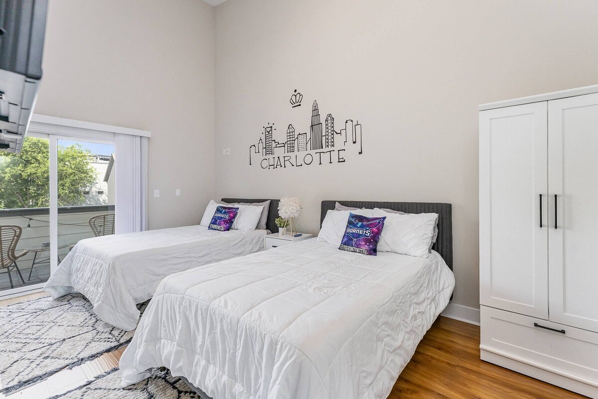 Planning a longer stay? We offer exclusive discounts for extended bookings—contact us directly for details! We would love to host you for a short trip or mid term stay! **Welcome to Queen City’s Nest & Den Uptown – Charlotte’s Premier Group & Family Getaway located in Downtown/Uptown Charlotte!** This one-of-a-kind luxury duplex is among the most unique properties located in Uptown Charlotte, comfortably accommodating 20+ guests within a 10-minute walk to Bank of America Stadium, Charlotte FC matches, Spectrum Center concerts, and Uptown restaurants and nightlife. Perfect for large families, friend groups, or company retreats, this fully private 6-bedroom, 6-bathroom duplex is loaded with custom murals, game-night extras, upscale finishes, and social media-worthy design touches inspired by Charlotte’s iconic pro sports teams—the Panthers and Hornets. ________________________ **Hosting a smaller group?** Ask us if we have availability for your group to book just one side of this duplex, which comfortably sleeps 12 guests! Which side would you choose, The Panthers Den or Hornets Nest? ________________________ **Location Highlights:** - Just 0.4 miles to Bank of America Stadium (walk to Concerts, Panthers & Charlotte FC games!) - Walkable to Uptown Charlotte's restaurants, nightlife, and museums - Located on a quiet, tree-lined street just steps from greenways and urban trails (Frazier Park & Irwin Creek Greenway is 2 minute walk away with trails, slides, and soccer field) ________________________ Inside the Space – Two Identical Units in One Stunning Home: **Queen City’s Den Uptown (Unit A – Panthers Inspired)** **Queen City’s Nest Uptown (Unit B – Hornets Inspired)** 6 Bedrooms, 6 Bathrooms, 4 Kitchens and a 12 total of Beds ________________________ **Each side of the duplex includes:** - 3 Bedrooms, 3 Bathrooms, & Private Balcony! - Two Full kitchens, Two Separate Living Room areas with Sleeper Sofa, and 5 Beds! - Smart TVs, private laundry, and luxury furnishings throughout! - Four Separate entrances for ultimate privacy! **Inside The Space: Bedroom Layout (per unit):** - Main Floor: Queen bedroom with full bathroom and a queen-size sleeper sofa, and private kitchen! - Middle Floor: Open-concept kitchen, dining, living room with sleeper sofa, full bathroom, and washer/dryer! - Top Floor: Loft with 2 full beds and private balcony; oversized king master with en-suite bathroom and additional hallway bathroom! ________________________ **Luxury Amenities & Features:** - Custom murals, bold art, and curated design in every room - Private balconies with skyline views of Uptown Charlotte - Fully stocked kitchens with stainless steel appliances - Smart TVs throughout every room and common space, high-speed WiFi, and dedicated workspaces - Giant stand-up Connect 4, board games, and cozy hangout spaces, located on both sides! - Multiple Washer & dryers in each unit - Free on-site parking for 4 vehicles ________________________ **Perfect for:** - Multi-family gatherings - Corporate retreats or team off-sites - Bachelor/bachelorette weekends - Sports fans attending games, concerts, or events in Uptown Book with confidence knowing your Charlotte adventure starts at one of the most exclusive, art-inspired properties in the city—where upscale comfort meets unbeatable access to everything Queen City has to offer. *Important: We are committed to protecting our properties. Please note that before your booking begins, you must verify your details and ID. Primary renter must be 25 or older and must be present for the entire stay. Name on Credit Card MUST MATCH NAME ON RESERVATION or risk being canceled automatically. The billing address MUST MATCH ID. NOTE: Your Check-in instructions from iTrip Charlotte (management company) will be emailed out to you 24 - 48 hours before your arrival date. Please check your SPAM folder if you have not received them. These will be sent out to the email address you used when you first booked. Our prices include all fees. No hidden fees.
