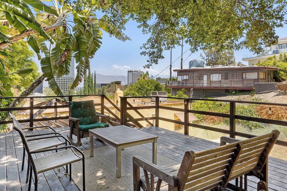 Kjngdom of Fredonia by KJNGDOM. Golden Age Hollywood Hills Spanish home perfectly located and walkable to Universal. One of the first homes built in the Hills, this is an authentic Hollywood experience full of character and original charm. It features 2 bedrooms and 1 bathroom with a large open concept kitchen, dining and living room. The large backyard provides for two seating areas; one with a skyline view over Universal and one a large dining area. You will love the bath as it is very special with an extra large Turkish style shower bath. *** Send us a message and inquire about SPECIAL OFFERS! *** Charming Spanish-Colonial 2BR home in historic Hollywood Hills. This is an authentic Golden Age Hollywood home built in 1920s updated with modern amenities: - Spacious outdoor backyard with covered dining table and elevated deck offering glorious views of Studio City. - You can see Universal City and Hogwart's castle from the deck. - Additional Patio area for outdoor dining - Full kitchen with vintage Okeefe & Meritt Stove - One queen bed in main bedrooms, one twin daybed convertible to a king in second bedroom. Living room has pull out sofa into king size bed. Suitable up to 6 guests - Central Air, Nest Thermostat - Living Room Smart TV with Surround Sound - Google Home, Chromecast & WiFi Welcome to the Kingdom of Fredonia, a charming Spanish-Colonial retreat in the heart of Los Angeles with mesmerizing views of Studio City from its elevated backyard deck. This delightful 2-bedroom home retains all its original touches, offering a unique blend of old-world charm and contemporary comforts. Your entrance, up a gentle set of steps to the front door, leads you into one of the first homes built in the Hollywood Hills. The large outdoor backyard is a haven, featuring a covered outdoor dining table for al fresco meals and an elevated balcony with glorious views of Studio City and San Gabriel mountains. You can see Universal Studios, The Minion, and Hogwart's Castle from the backyard. Inside, Fredonia seamlessly combines old-world charm with new contemporary furniture for a chic ambiance. The full chef's kitchen and dining area are perfect for culinary delights. Two queen beds in the bedrooms, one of which transforms into a futon, provide comfortable sleeping arrangements. The sofa in the living room converts to a bed for two, and an air mattress is also available, accommodating up to 6 guests. There is a smart HDTV with surround sound and Netflix for entertainment. The highlight is the very large bathroom with custom shower bath suitable for multiple guests. In this part of the Hollywood Hills, free street parking is plentiful, making it convenient for you to explore the vibrant surroundings. Fredonia invites you to experience the charm of historic Hollywood Hills with all the modern comforts for an unforgettable stay. This is the perfect central location to experience Los Angeles with many convenient destinations close by. Universal Studios and City Walk is a 10 min walk and from the Universal City Metro Station you can easily access Hollywood, Downtown, Pasadena, Santa Monica and Culver City. It's a longer hike (40 min) to the north entrance of Runyon Canyon - LA's famous hiking hotspot where you can frequently spot celebrities. Lake Hollywood, the Hollywood Sign, Griffith Observatory and Griffith Park are also easily accessible by car (10-15min). Smart home features include keyless entry, hue colored lighting, google home and smart networked speakers throughout. Registration number HSR25-001007 Other things to note ** HOME TRUTHS ** - There are 35 steps (stairs) to reach up to the property. - This is an older home with some eccentricities. We do our best to keep everything clean and updated but please be aware there are some wear and tear that comes with these vintage homes in Hollywood especially in the hills. - The front yard and backyard are terraced. Please be careful with elderly, children or pets. No running and jump or risky behavior. WE ARE NOT RESPONSIBLE OR INJURIES OR FALLS. - Street parking only. - Security Cameras in use in outdoor public spaces (streets, front and back yards, deck, entrances). *** Send us a message and inquire about SPECIAL OFFERS! *** Our prices include all fees. No hidden fees.
