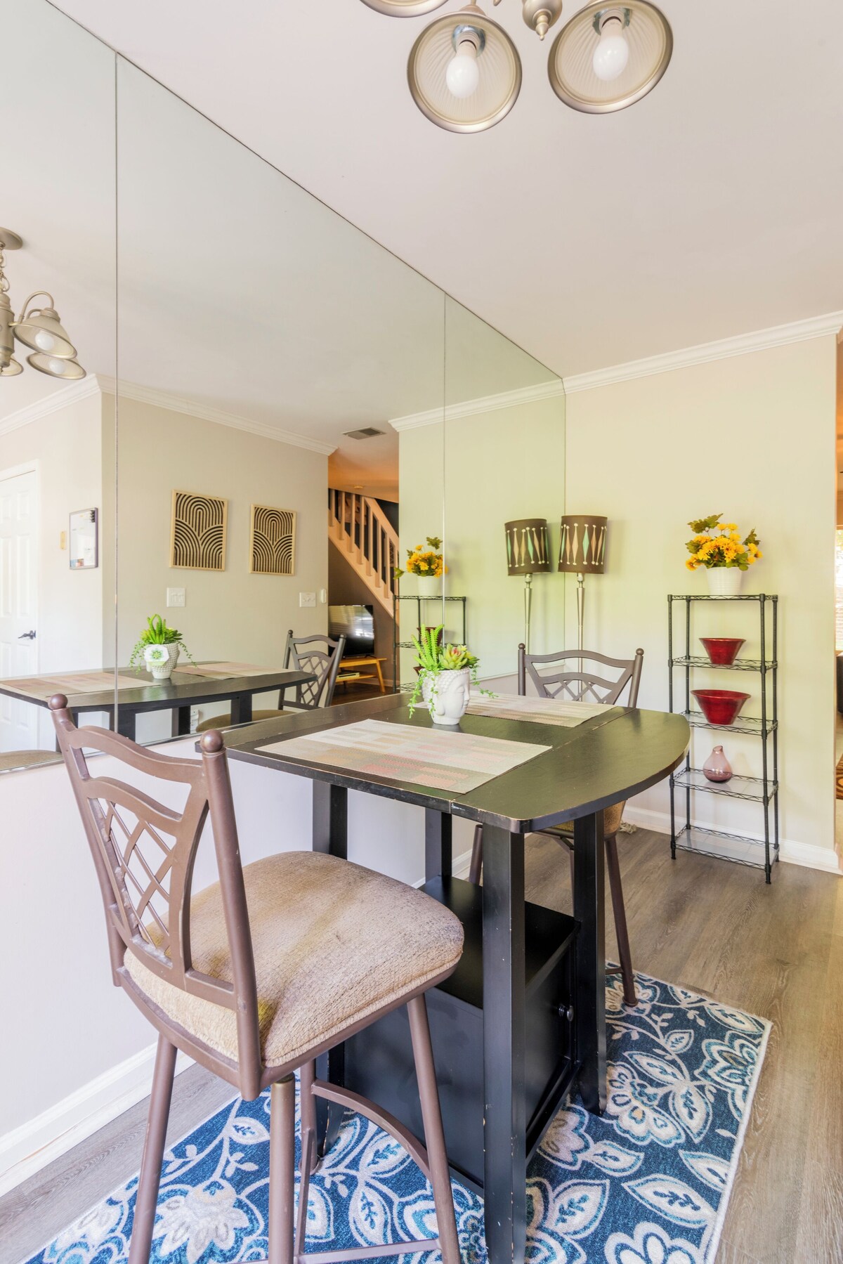 Gorgeous town home located on the 7th hole of a CC in South Charlotte. Brand new siding and paint in inside and outside. It is fully furnished and includes full size washer dryer, WIFI, Cable and dishwasher. Townhome was just updated with brushed nickel fixtures. Kitchen is fully stocked with everything you could need. Plush linens and bedding. Has 2 large bedrooms upstairs. Master has Queen size bed and 2 closets with built in shelving. 2nd bedroom has rand new memory foam Queen size bed. Full bathroom upstairs and half bath down stairs. Downstairs also has pull out couch if needed. Beautiful deck overlooking lake and golf course. Very quiet mature neighborhood. 1 mile form shopping and restaurants, including Target, Walmart, Harris Teeter, Trader Joes etc. Movie Theater and ample dining options also within 1 mile. Absolutely no parties and no groups larger than 5ppl. This is a non smoking property. Our prices include all fees. No hidden fees.