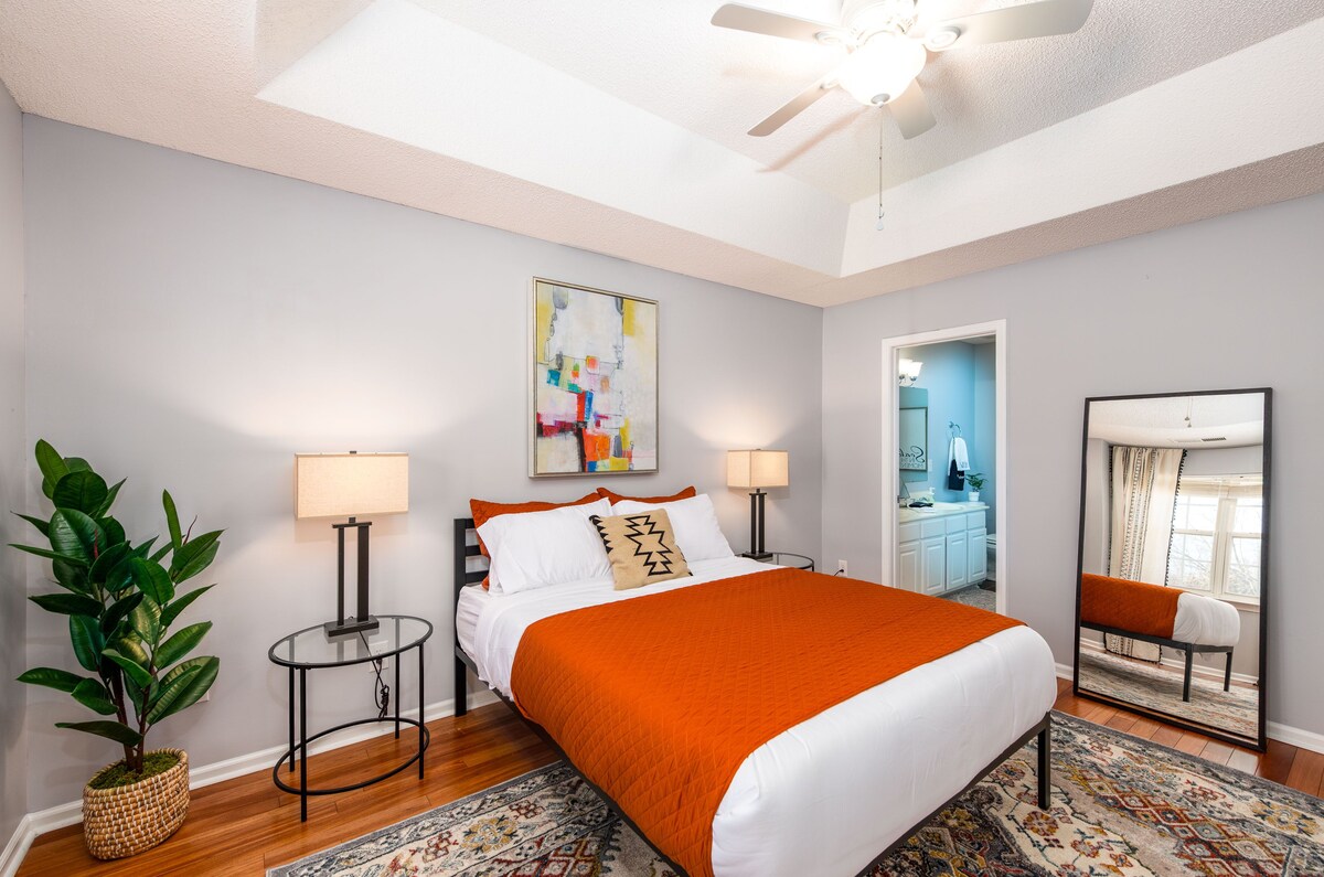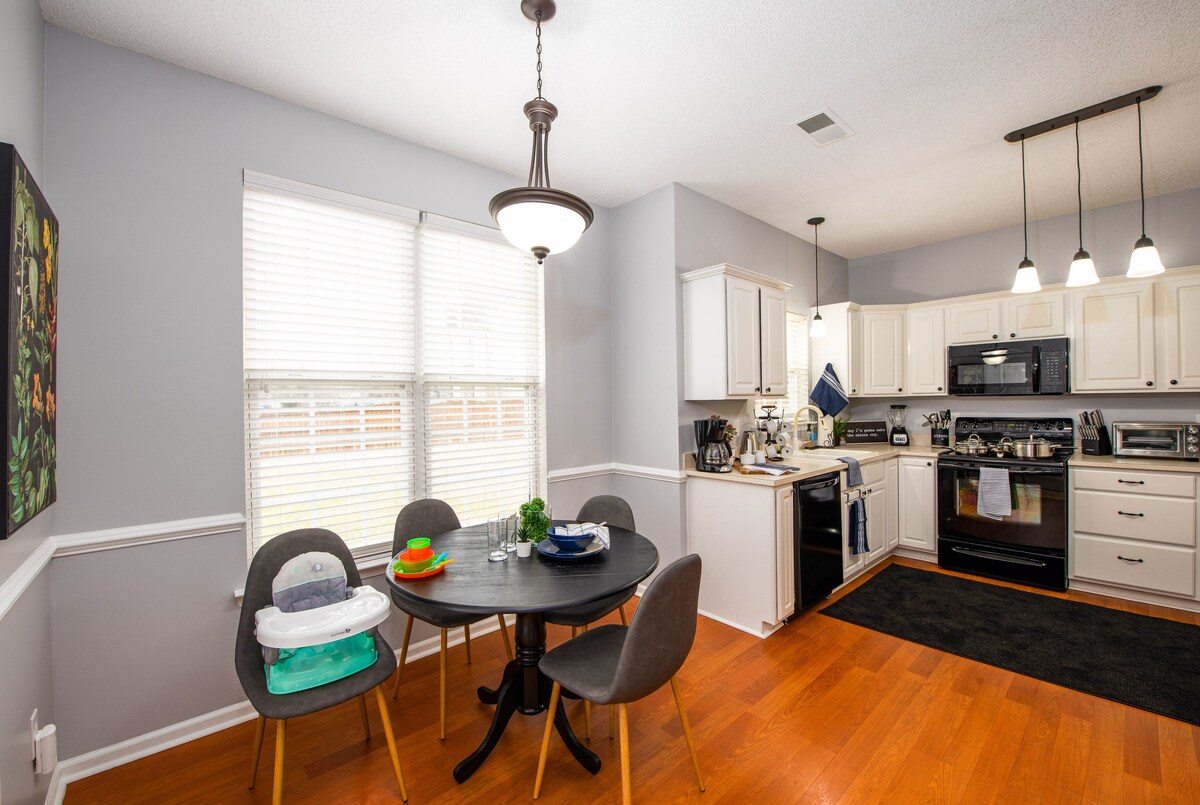 Conveniently located 5 minutes from major highways & shopping centers. We're in North Carolina right near the border of South Carolina, CAROWINDS is only 2 miles away. Coming in for work, visit family, moving to the area? You'll have 2,000 sq ft ENTIRE HOUSE to yourself! Kitchen has all the basics along with some extras. Relaxing backyard lounge area & NEW FENCE INSTALLED in 2021! - 4 bedroom, 2.5 bathroom - 7 formal beds - Plus couch & air mattress We are dog friendly! Please note we do charge Pet Fee. ******************************************************************************************************** >>>>>>>>>>>>>>>>>> IMPORTANT: Parties, events, or gathering OF ANY KIND ARE NOT PERMITTED at our home. ENTIRE PROPERTY IS Non-smoking, inside and outside. Guests are NOT PERMITTED to bring a grill onto the property.<<<<<<<<<<<<<<<<<< We've installed a new taller FENCE, extended the backyard PATIO to have a larger eating and hang out area since families love the yard for the kiddies (adults young at heart) and dogs to run around. :) We named our place \ in honor of Charlotte's nickname \ and the use of color throughout the house to honor a queen's jewels. ;) When you walk in the door to the beautifully designed living & formal dining room. You will immediately notice how spacious and relaxing the vibe of the place is. Color splashed around the house that speaks to the youth and modern designs of today. The home has a Security System that will make your stay stress-free. There is a doorbell camera facing the front exterior of the home. Ample driveway fits 4 full size cars and street parking. OUR HOME IS IDEAL for larger groups as we can sleep 13 people or those wanting a very large house to spread out. We're both for vacation renters, corporate rentals, traveling workers and those relocating to Steele Creek, South Charlotte, Fort Mill, Rock Hill, Tega Cay. We're only 5 min from the main highway to quickly access those areas. **** FIRST FLOOR **** LIVING ROOM: -- You have a SMART TV with a SOUND SYSTEM you can connect to bluetooth for music during family and friends bonding time or your cooking time! The couch can comfortably sleep an adult, we also have an air mattress available. KITCHEN: -- We've try to think of as many amenities to accommodate our traveling chefs. ;) We offer a standard coffee maker, as well as a FRENCH PRESS for our coffee lovers. Two toasters to choose from, including a toaster oven to nicer warm or toast some left overs. FORMAL DINING ROOM: -- We have a bench as well as formal seating for a nice family or friends meal. **** SECOND FLOOR **** All bedrooms are on the 2nd floor. We have 3 bedrooms PLUS a Bonus room that invites that relaxing feeling you have when you are comfortably staying at your own home. ALL BEDROOMS HAVE A SMART TV! PRIMARY BEDROOM w/ attached Bathroom: -- QUEEN BED -- When you reach the top of the stairs, to the left, you have the Primary bedroom with an attached bathroom. This bedroom is SEPARATED from the additional bedrooms by the large Walk-In closet and hallway bathroom. SECOND BEDROOM & THIRD BEDROOM: -- QUEEN BED -- To the right of the stairs are the 2nd and 3rd bedrooms which are across the hall from each other (not next to each other) for some added privacy. UPSTAIRS BATHROOM: -- The full hallway bathroom separates the Primary and additional bedrooms. BONUS ROOM: -- 4 TWIN BEDS -- The large, spacious bonus room is next to both the 2nd and 3rd bedrooms (which is on the opposite side of the house from the primary bedroom). This room also has a SMART TV, a PLAYSTATION as well as GAMES and TOYS for the kids. BACKYARD: PATIO: -- When you exit the back door, you're greeted by some crisp fresh air and a nice comfy outdoor sofa right there on the patio! There's also a great table for you to enjoy your meals, a chat or just some drinks. YARD: -- NEWLY re-fenced, so no kids or fur babies can escape if the gate is closed! Great place for kids, dogs OR adults to run around and enjoy some fresh air. There are also outdoor games like Giant Connect 4 and CORNHOLE. PLEASE NOTE: We do charge a PET FEE. We must be notified prior to booking AND this must be PAID prior to booking. As there aren't always guests that honor our home that we spent extensive time to deliver the best possible home experience. We've had to implement an extensive House Rules for our guests which consider the experience of current and future guests, while being respectful of our home and neighbors. WE THANK YOU IN ADVANCE for taking a moment to review our House Rules and honoring them during your stay. Our prices include all fees. No hidden fees.
