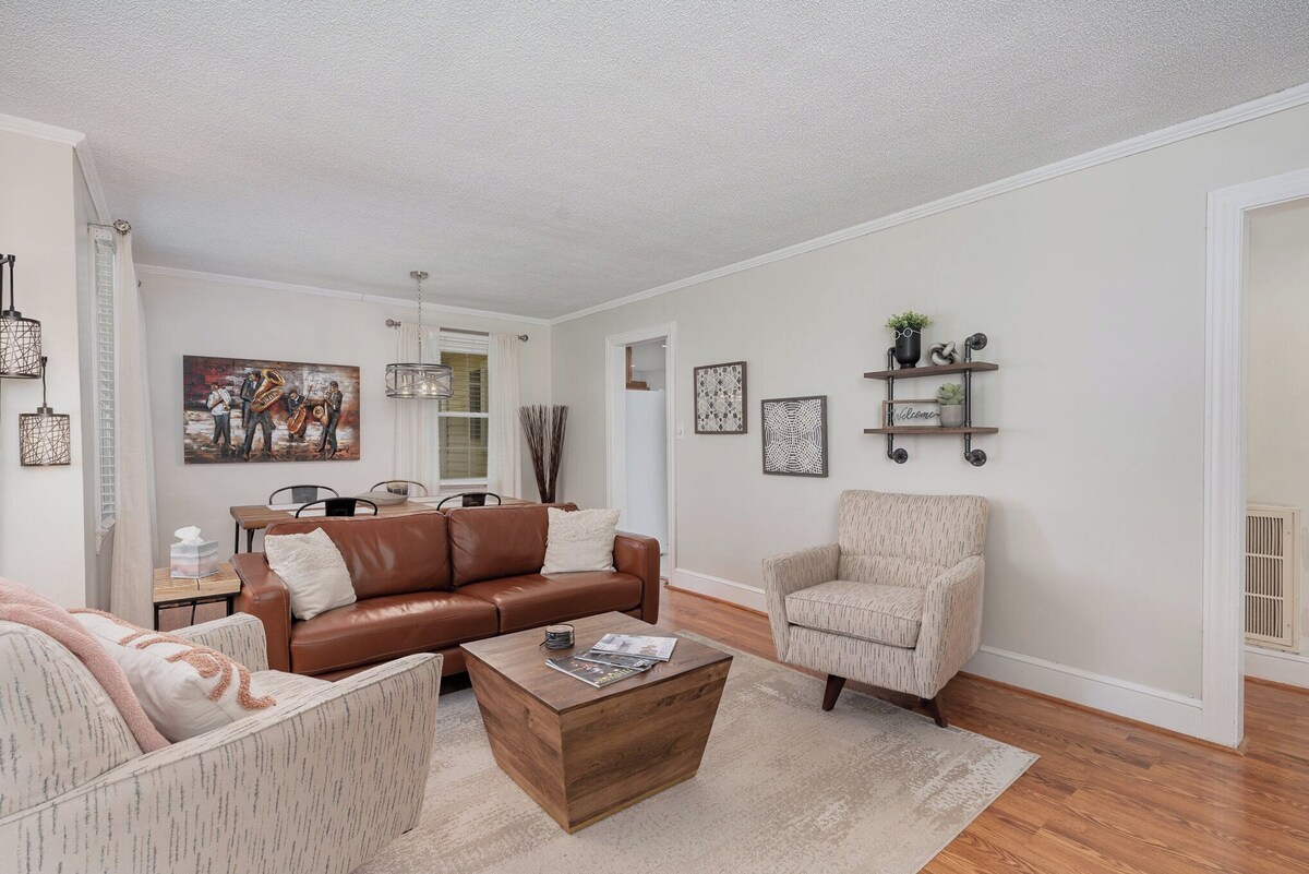 The house was built in 1934 so some floors are vintage, the bathrooms are from that era, but the house is newly furnished, newly painted and newly stocked to be your home away from home during your stay! Brand new mattresses (one plush; one firm) and plenty of pillow options will let you get a fantastic night's rest (along with blackout curtains!). Comfy couch, swivel chairs, and a 56\